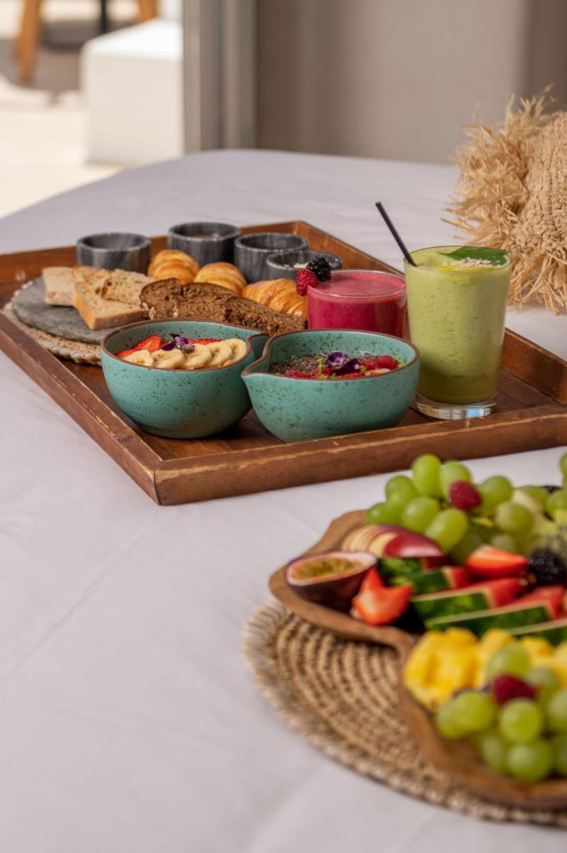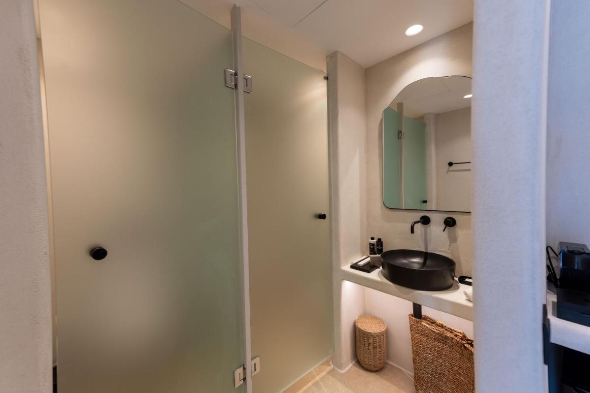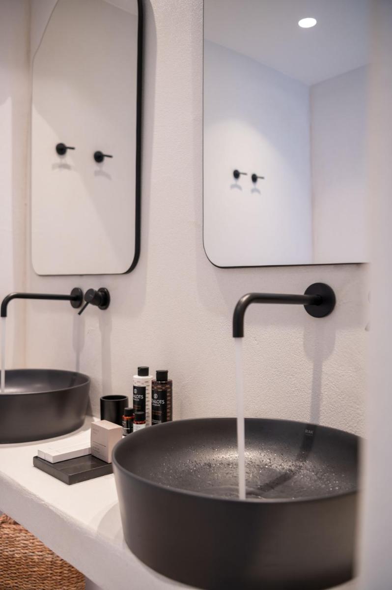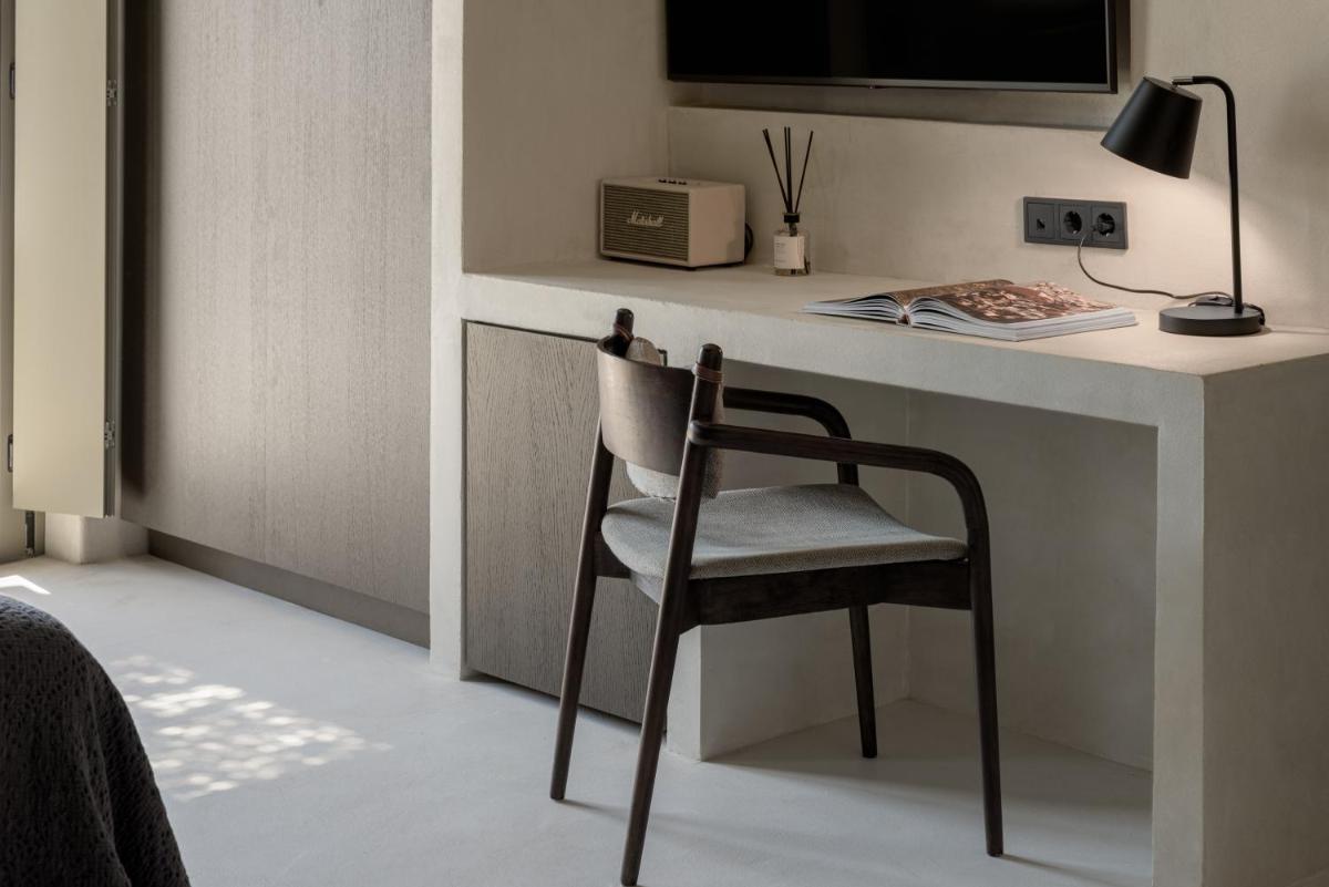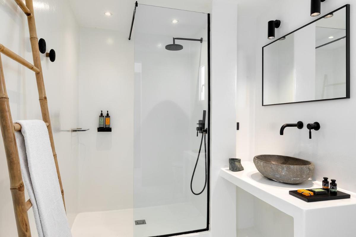 L'hôtel propose une variété de chambres et de suites, dont beaucoup sont équipées de jacuzzis privés extérieurs ou de petites piscines donnant sur l'Égée et le port de Tourlos. Chaque espace est une retraite de design, conçue pour offrir un confort absolu et une sensation d'évasion.