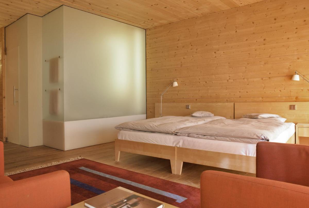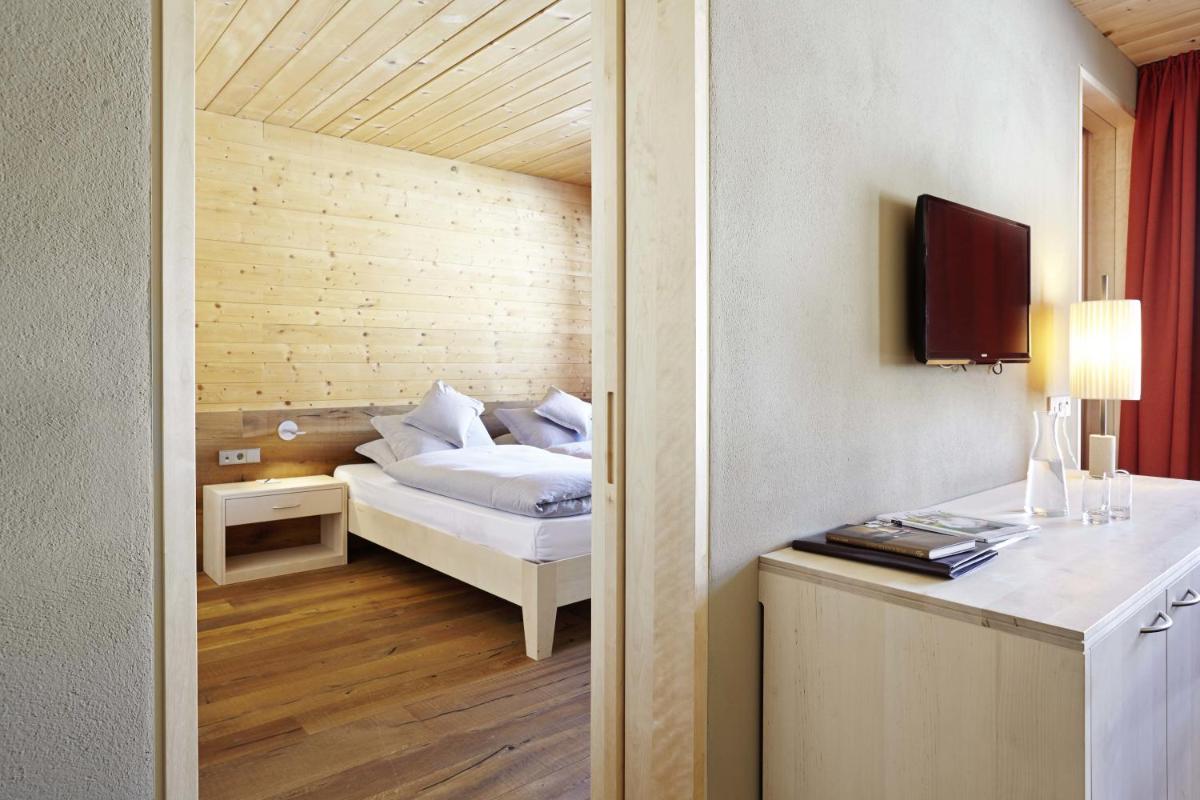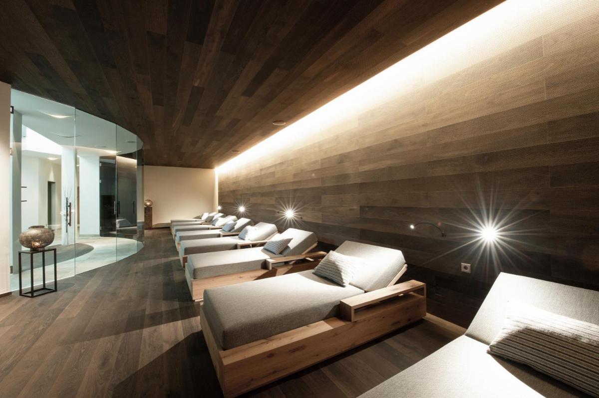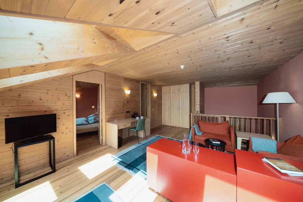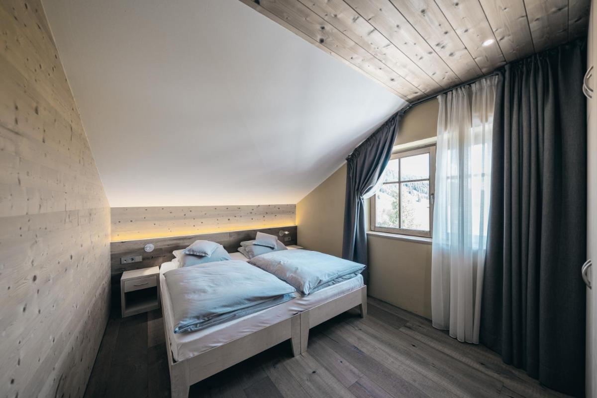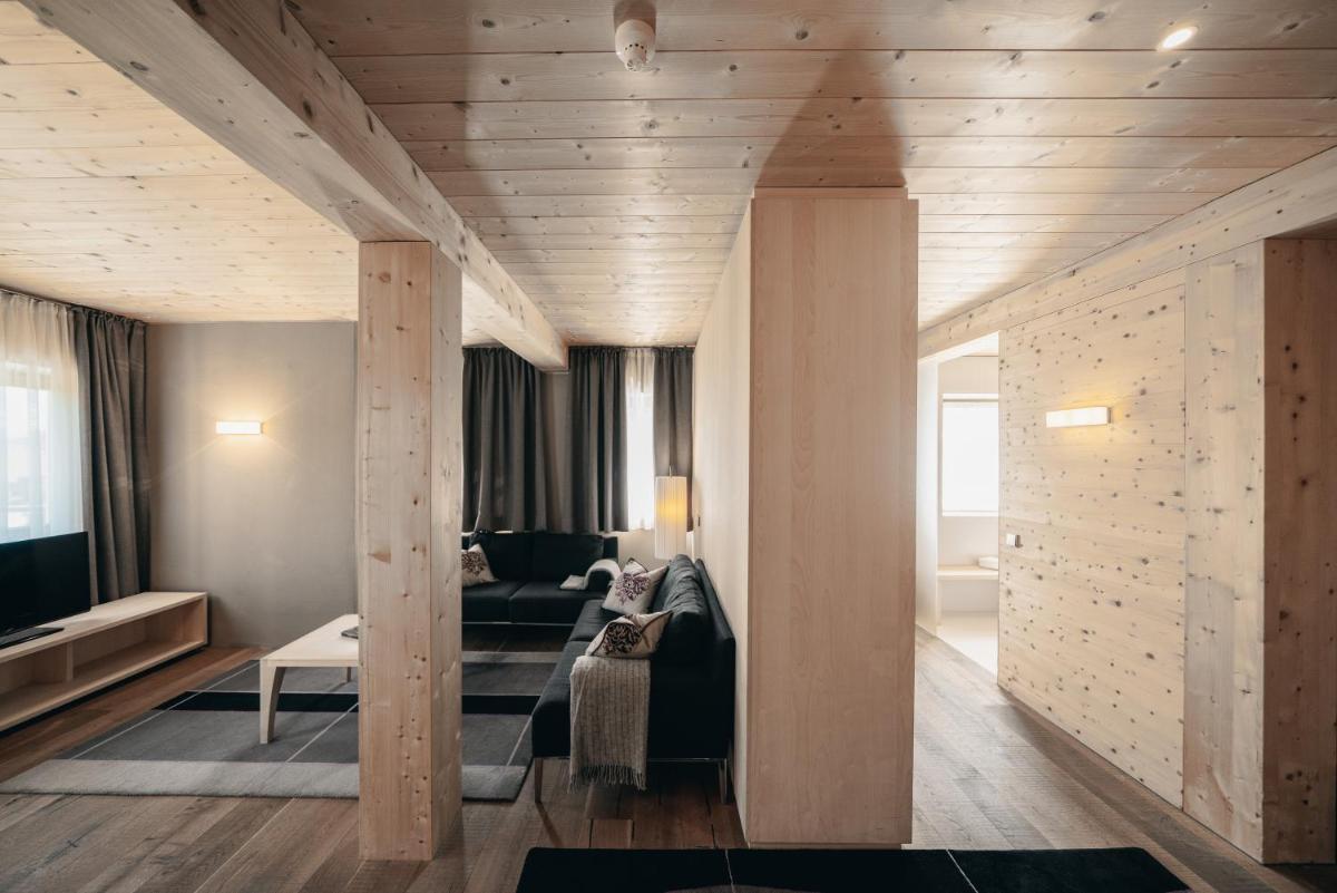 Les 63 chambres et suites reflètent la philosophie de l'hôtel, avec des murs, plafonds et planchers réalisés avec des poutres en bois massif jointes uniquement par des chevilles en bois, sans colle. Les hébergements sont spacieux et offrent des salles de bains privées modernes (souvent avec des parois en verre), baignoire, douche et bidet. Des grandes fenêtres et des balcons, les clients profitent de vues imprenables sur les Dolomites. Les Junior Suites et Suites, qui dépassent les 40 m², offrent des espaces de vie séparés et un design en bois pur.