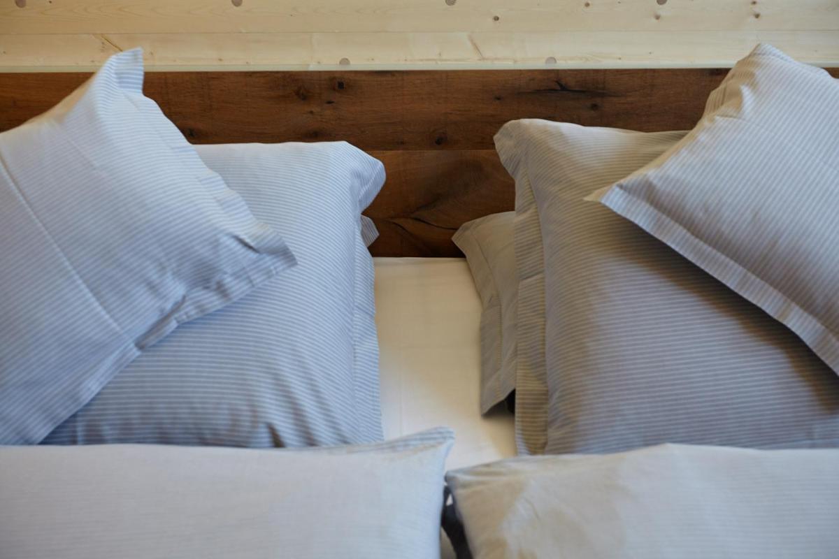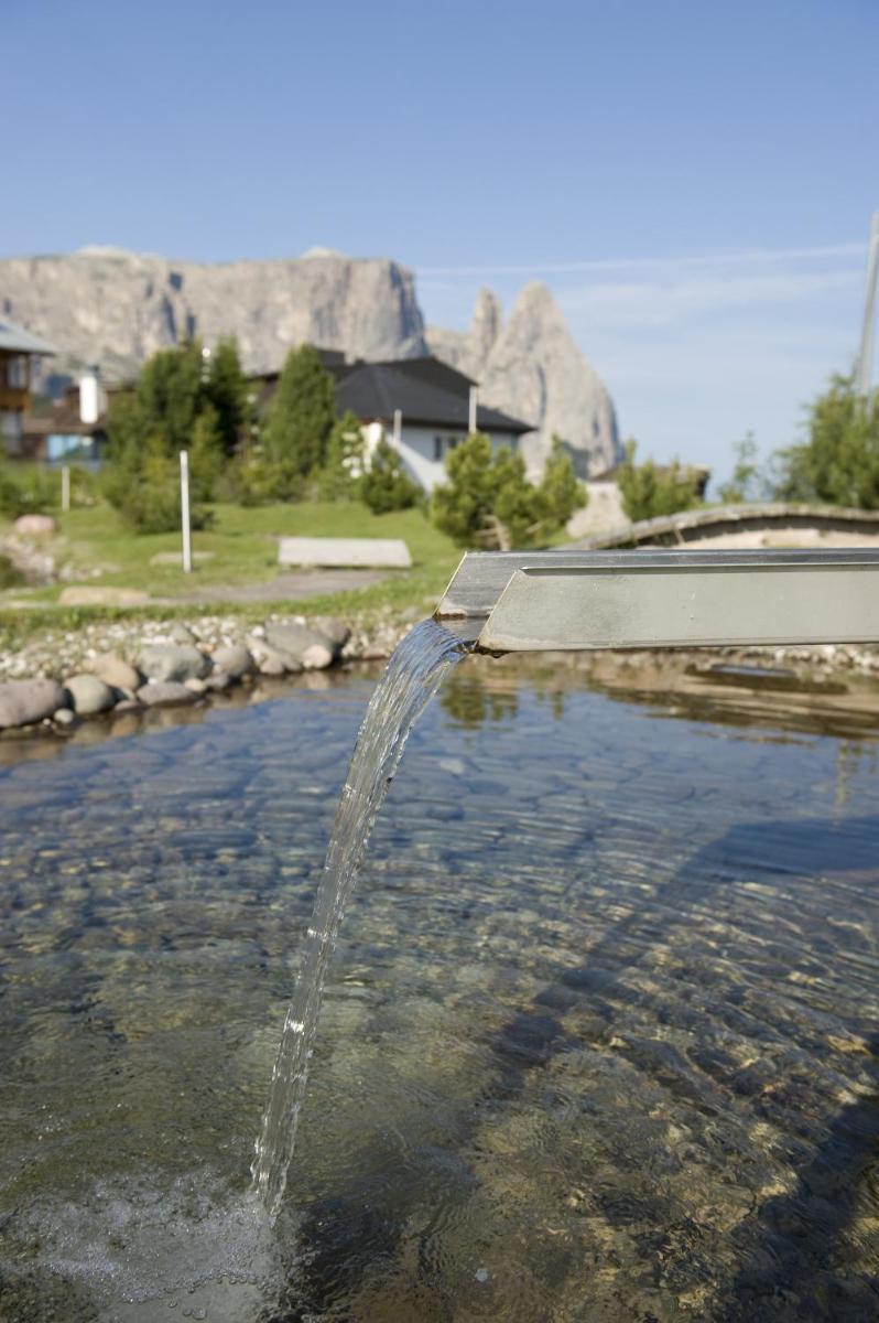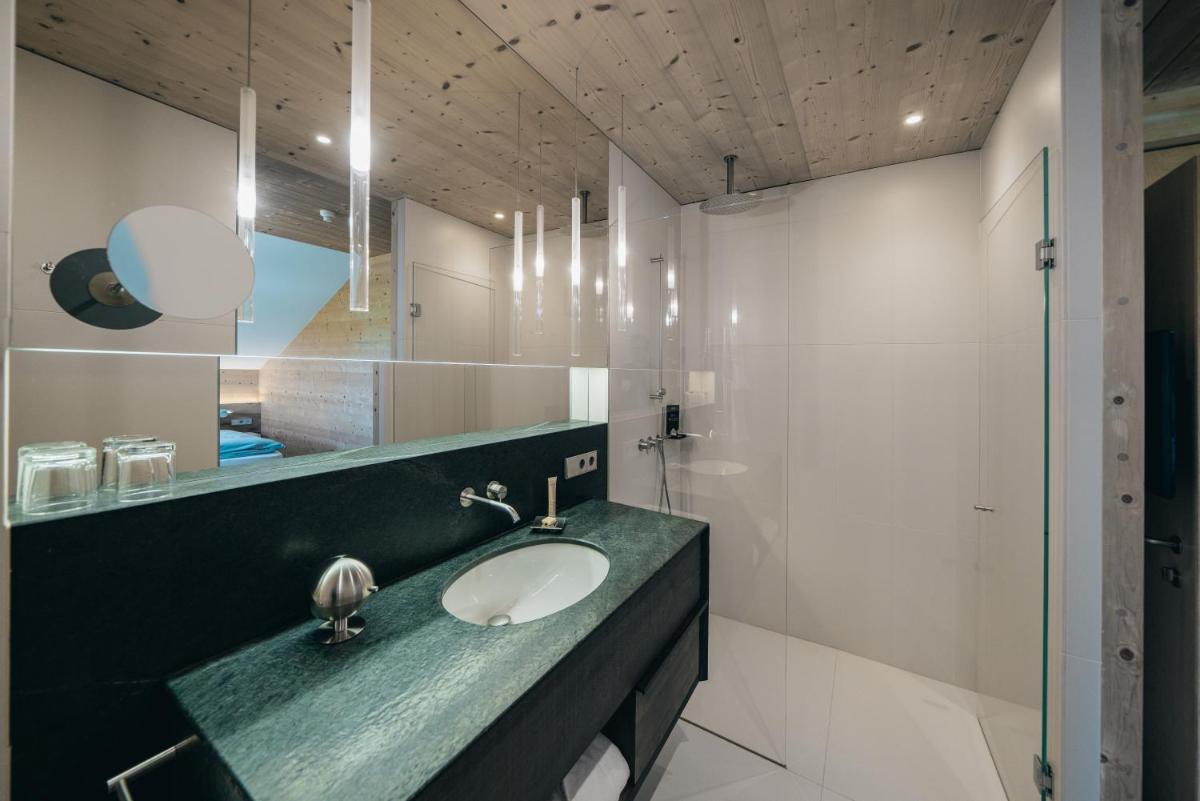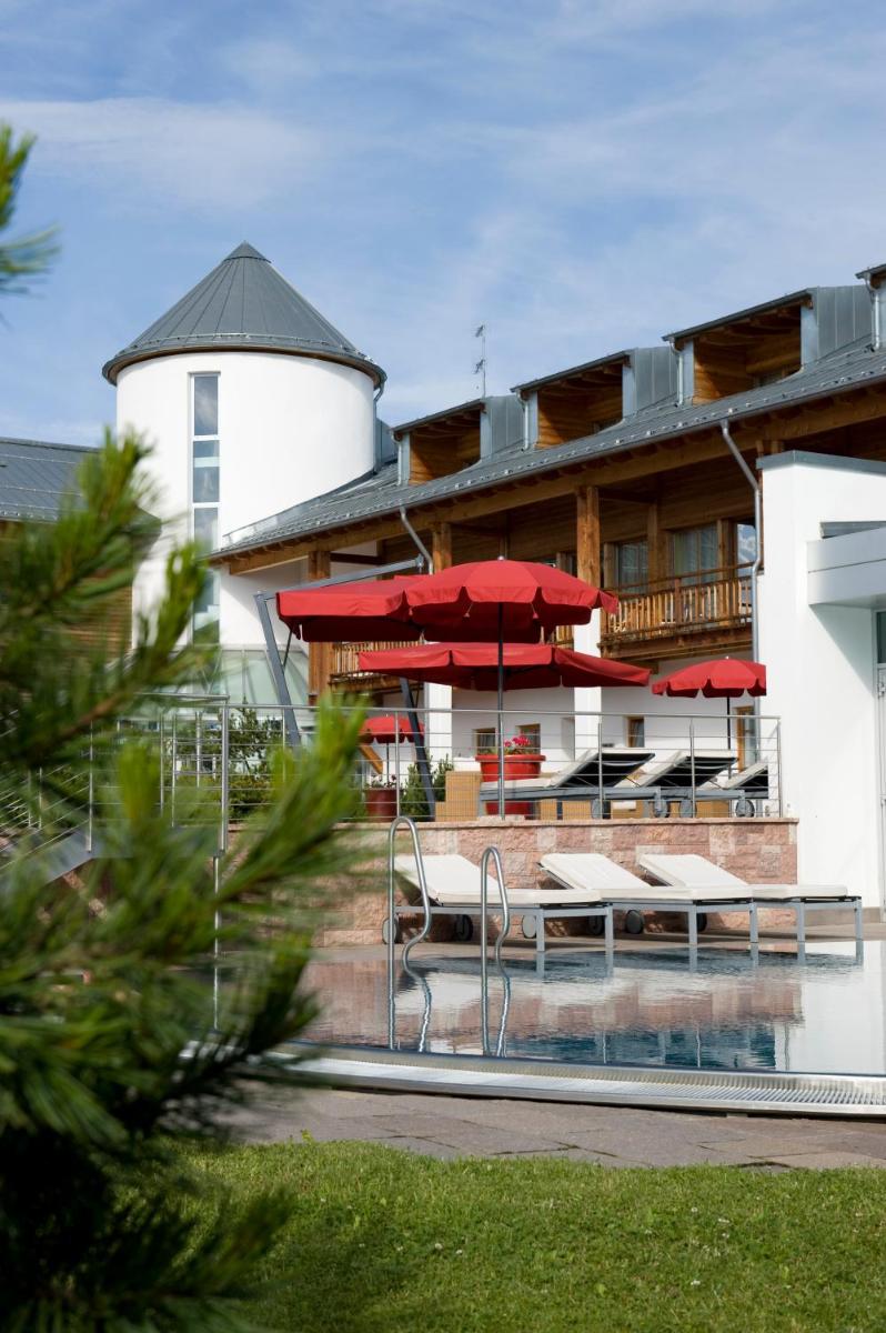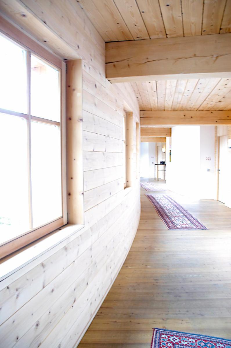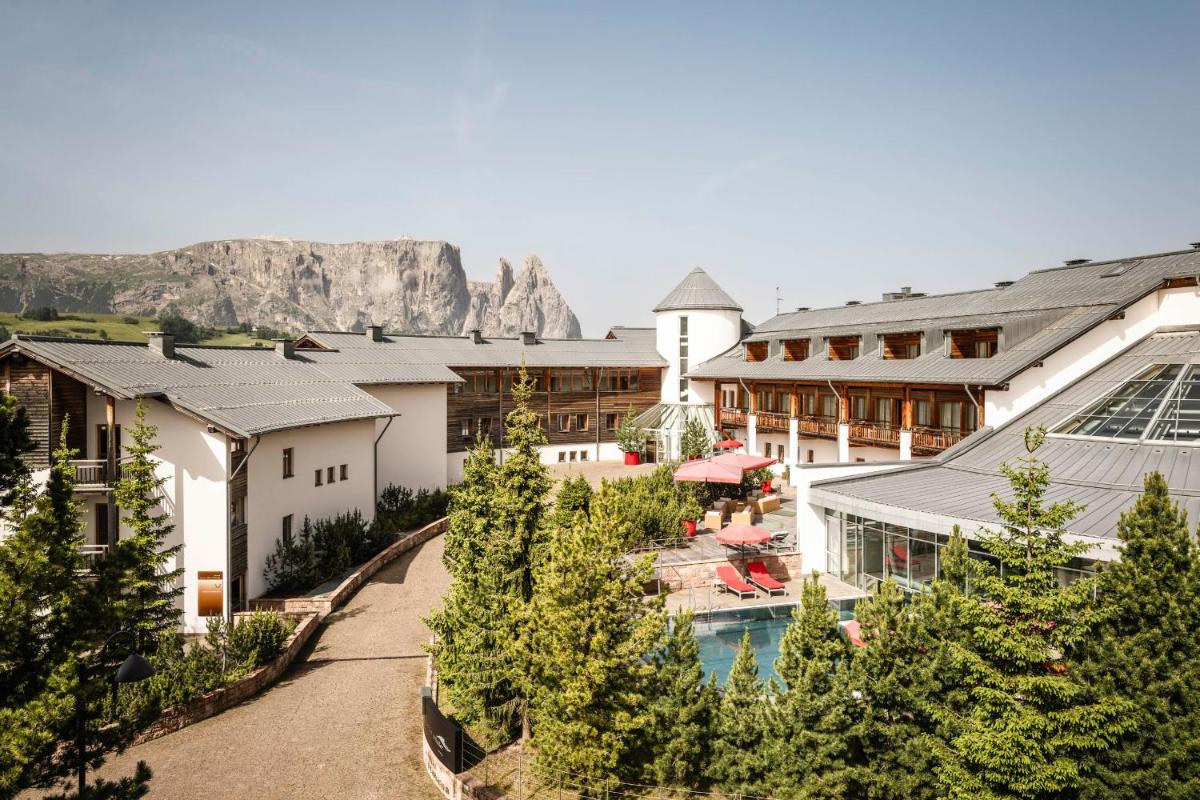 Les 63 chambres et suites reflètent la philosophie de l'hôtel, avec des murs, plafonds et planchers réalisés avec des poutres en bois massif jointes uniquement par des chevilles en bois, sans colle. Les hébergements sont spacieux et offrent des salles de bains privées modernes (souvent avec des parois en verre), baignoire, douche et bidet. Des grandes fenêtres et des balcons, les clients profitent de vues imprenables sur les Dolomites. Les Junior Suites et Suites, qui dépassent les 40 m², offrent des espaces de vie séparés et un design en bois pur.