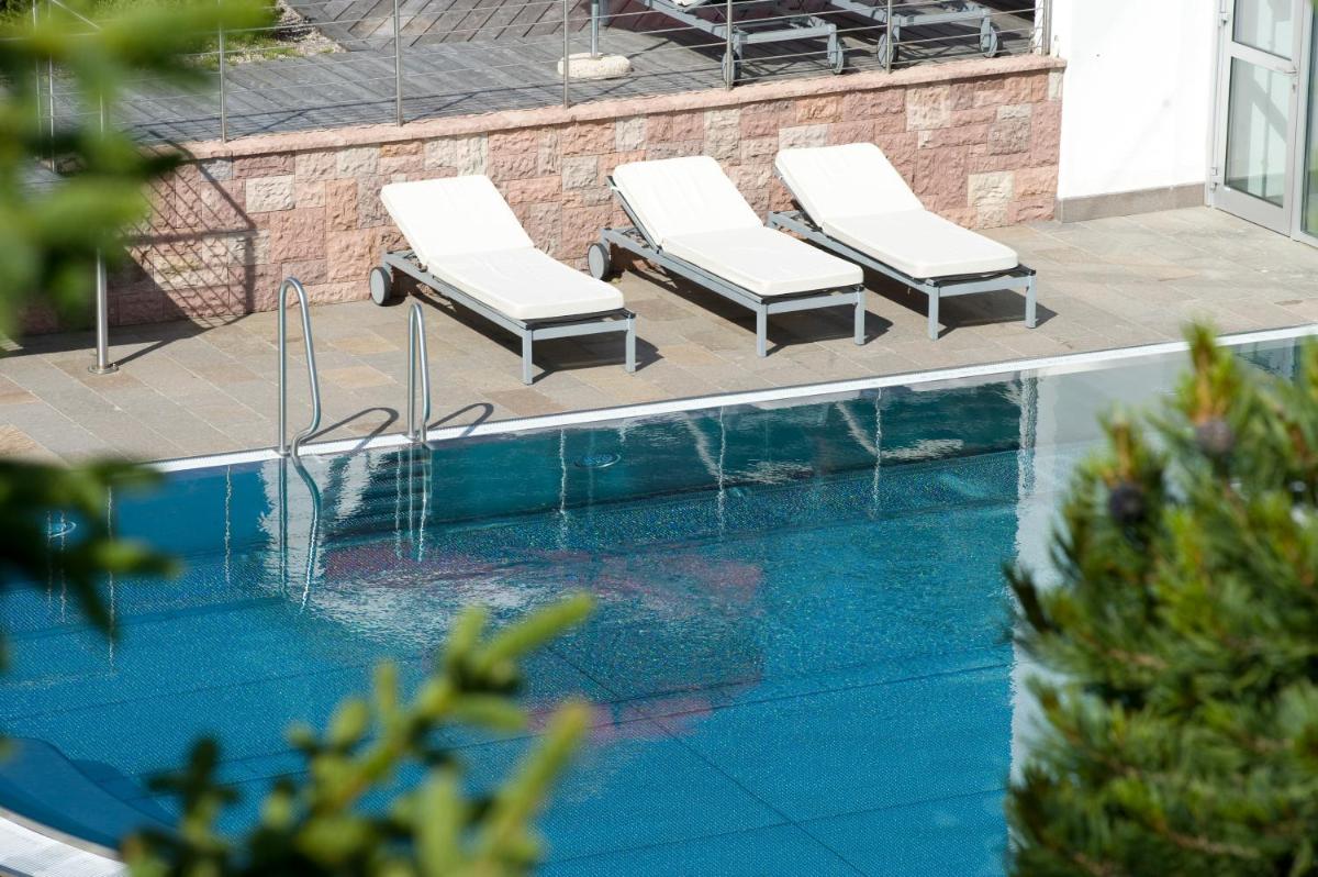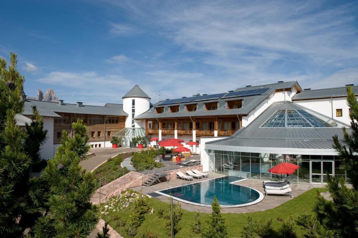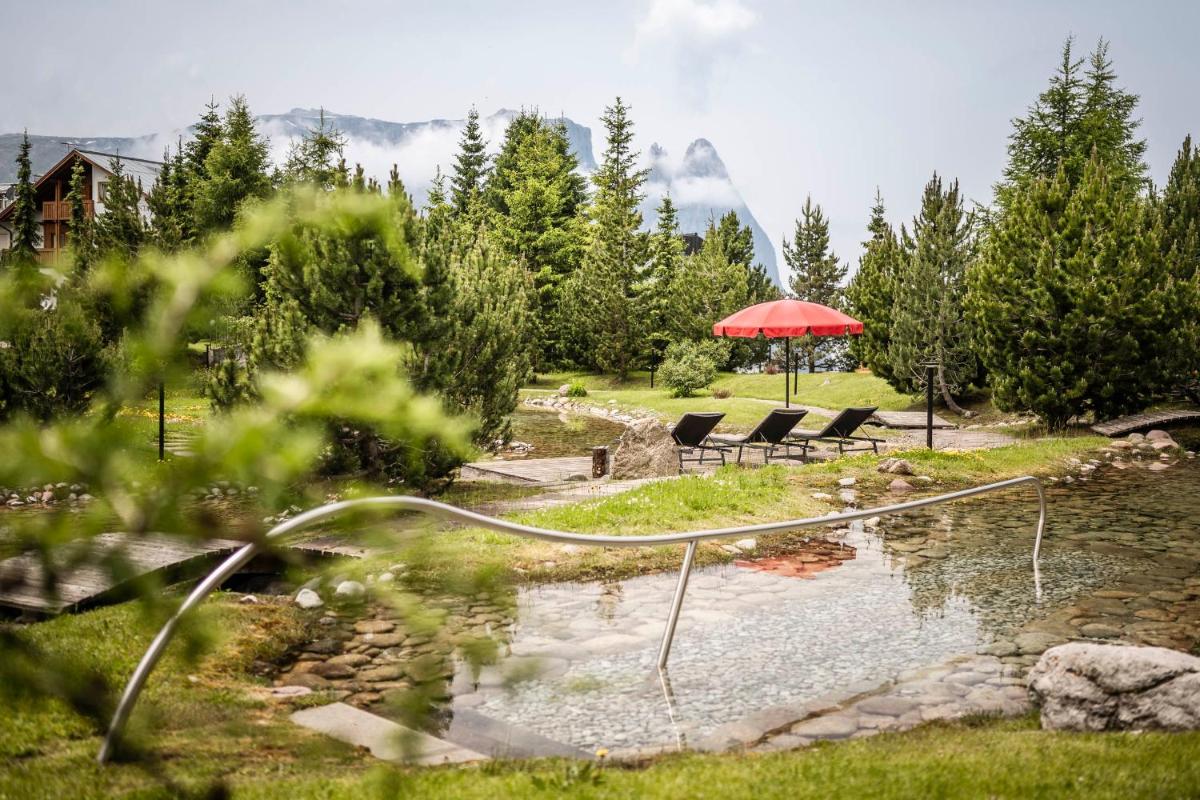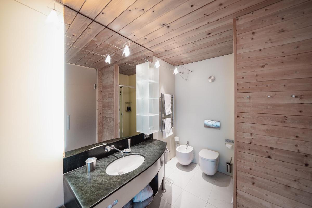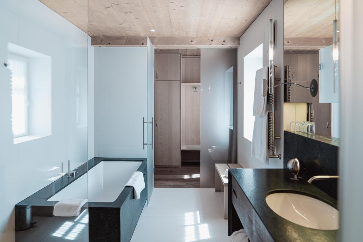 Les 63 chambres et suites reflètent la philosophie de l'hôtel, avec des murs, plafonds et planchers réalisés avec des poutres en bois massif jointes uniquement par des chevilles en bois, sans colle. Les hébergements sont spacieux et offrent des salles de bains privées modernes (souvent avec des parois en verre), baignoire, douche et bidet. Des grandes fenêtres et des balcons, les clients profitent de vues imprenables sur les Dolomites. Les Junior Suites et Suites, qui dépassent les 40 m², offrent des espaces de vie séparés et un design en bois pur.