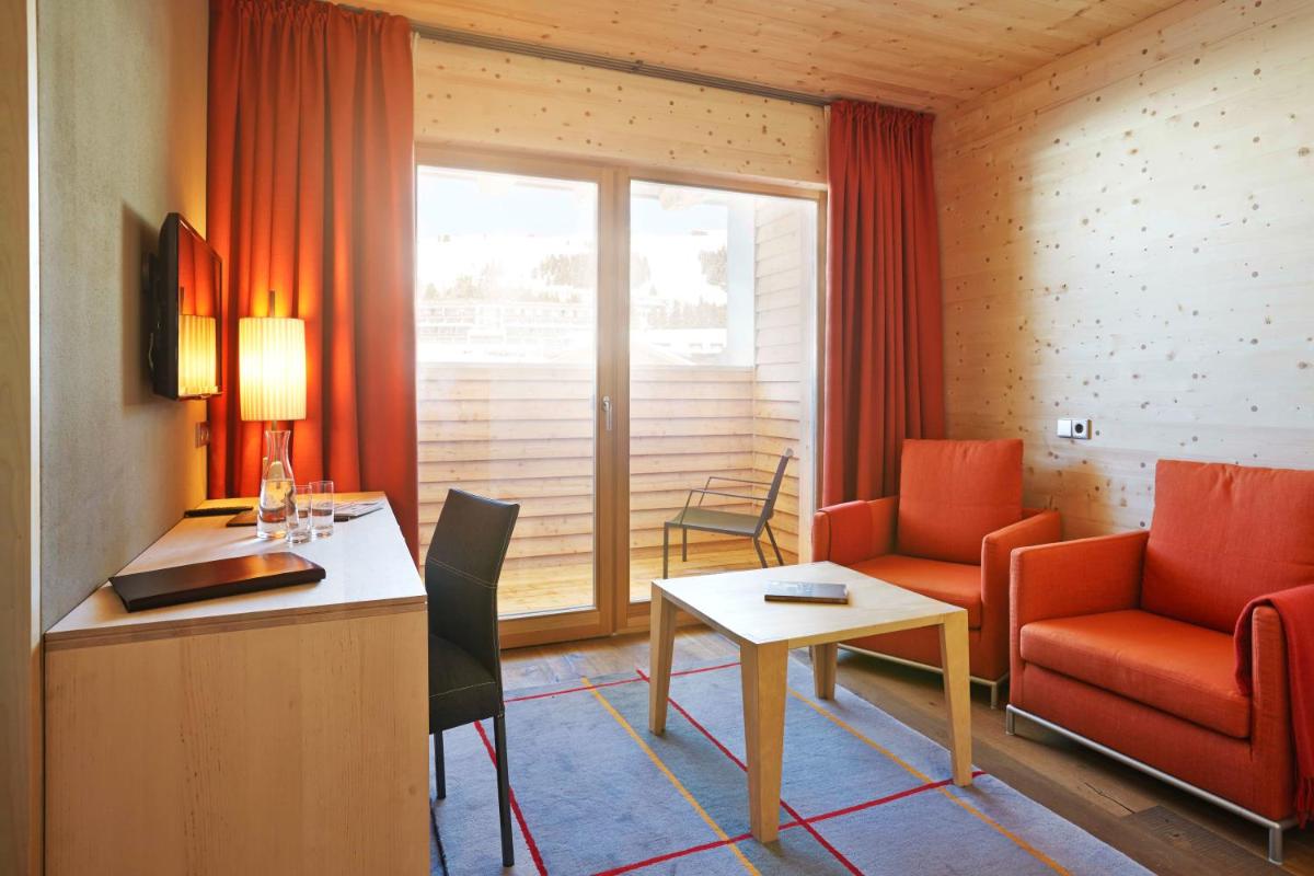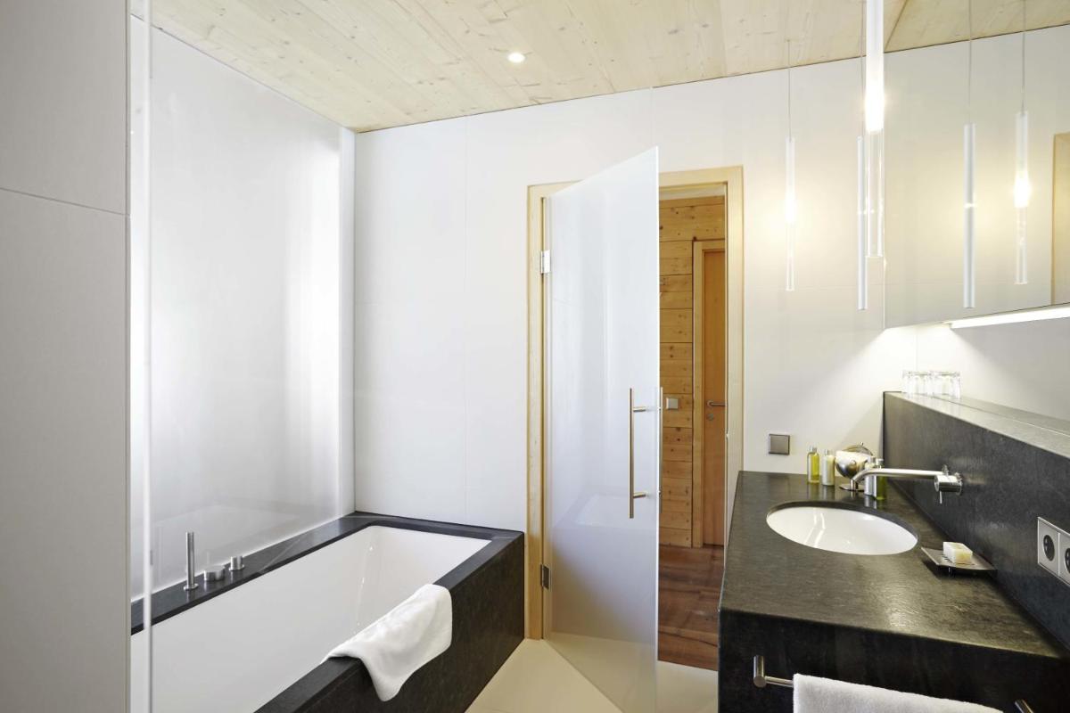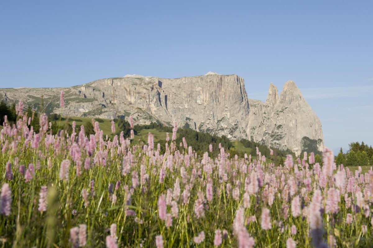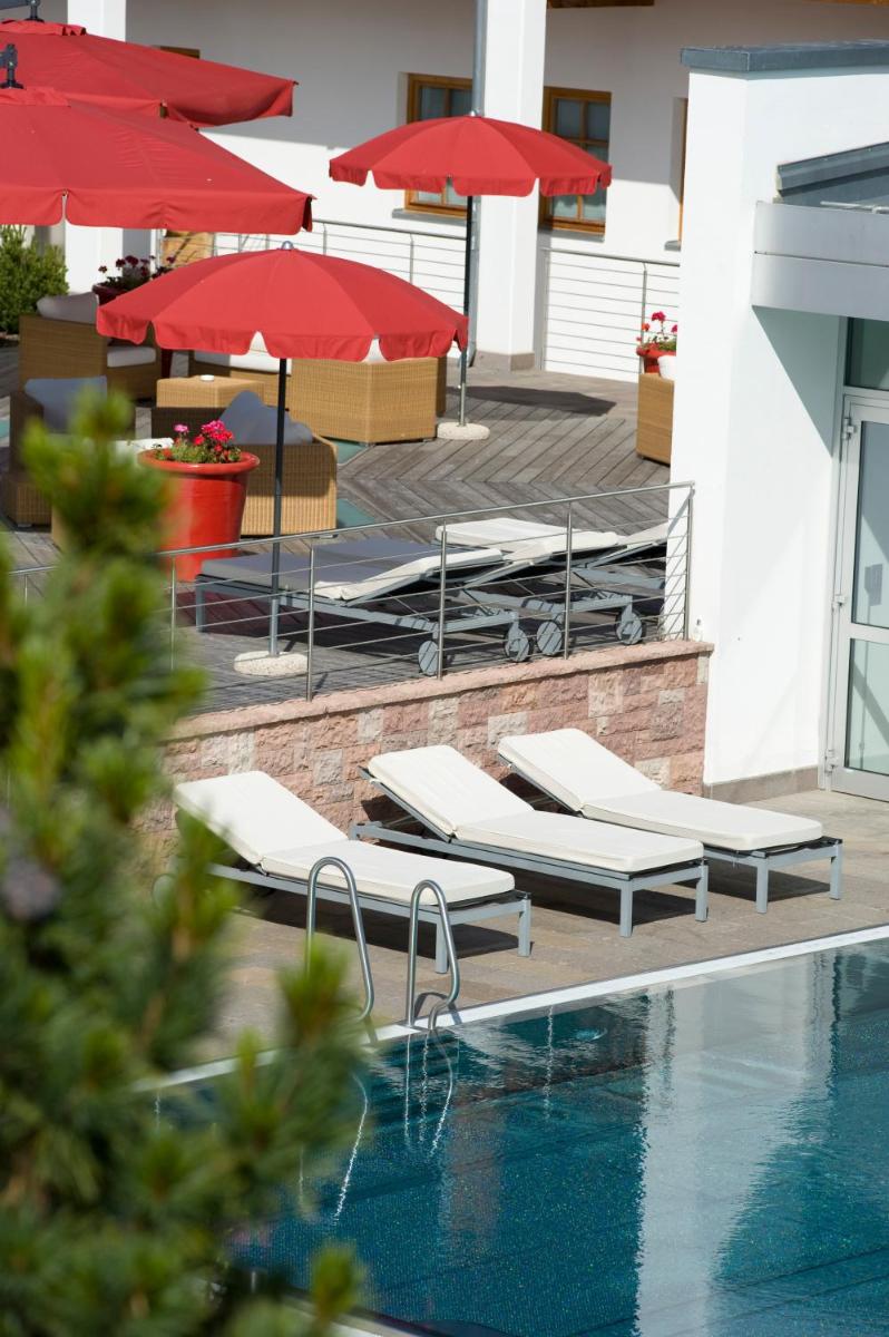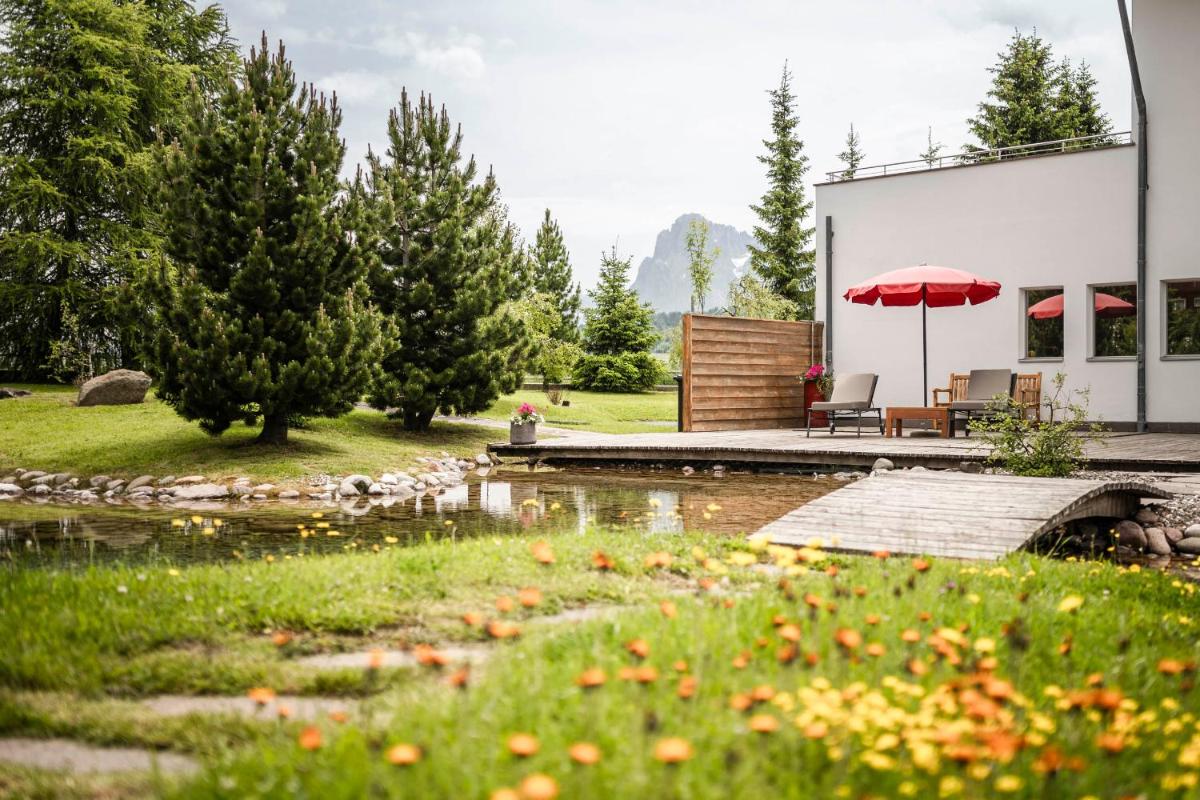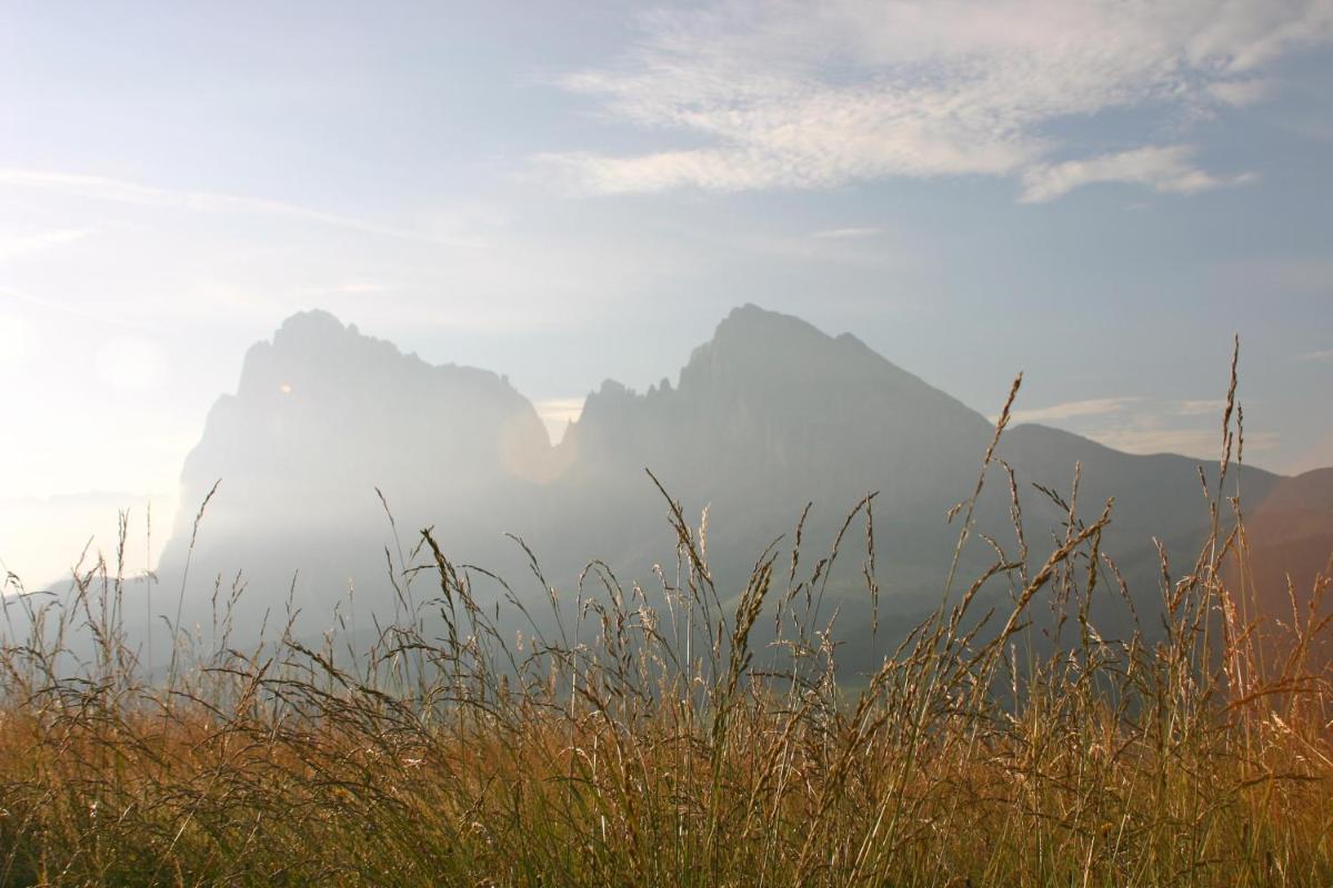 Les 63 chambres et suites reflètent la philosophie de l'hôtel, avec des murs, plafonds et planchers réalisés avec des poutres en bois massif jointes uniquement par des chevilles en bois, sans colle. Les hébergements sont spacieux et offrent des salles de bains privées modernes (souvent avec des parois en verre), baignoire, douche et bidet. Des grandes fenêtres et des balcons, les clients profitent de vues imprenables sur les Dolomites. Les Junior Suites et Suites, qui dépassent les 40 m², offrent des espaces de vie séparés et un design en bois pur.
