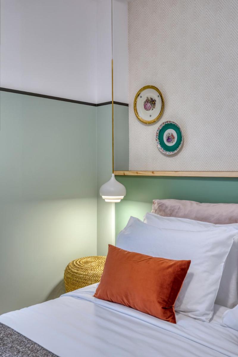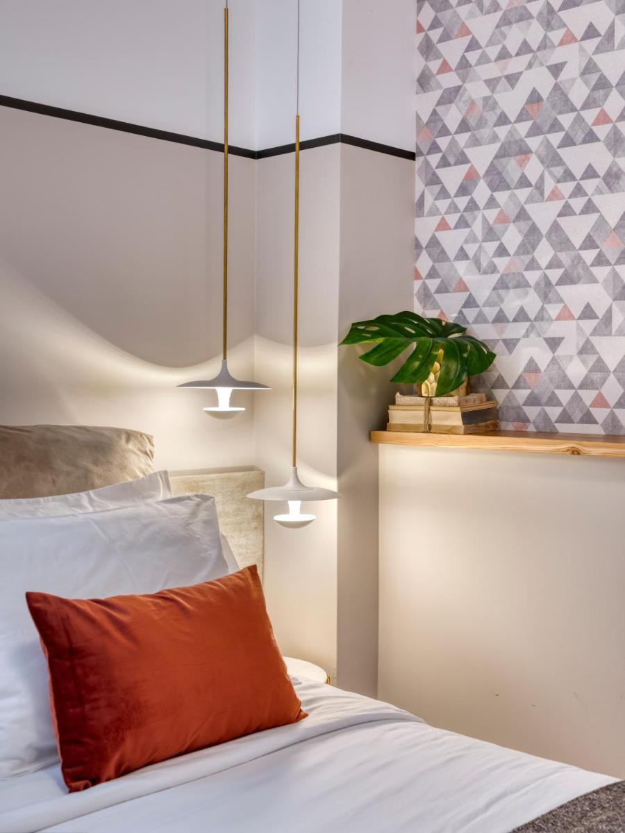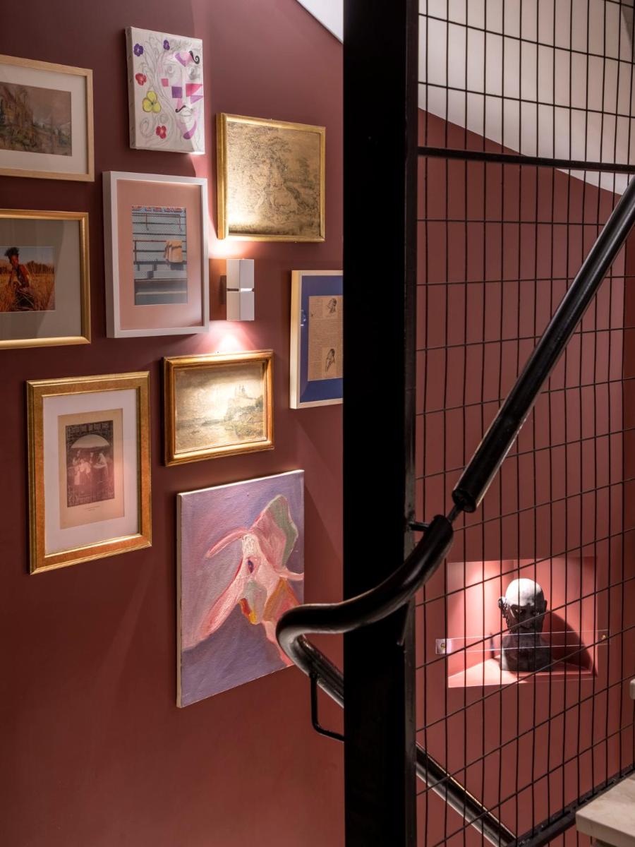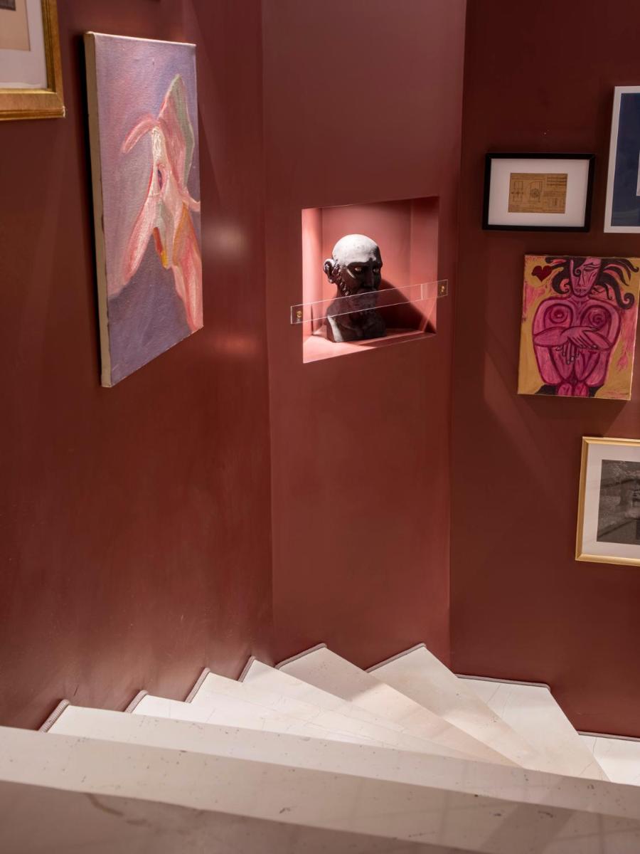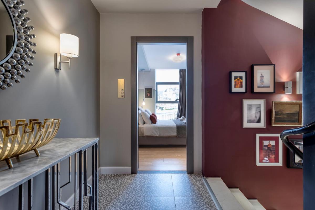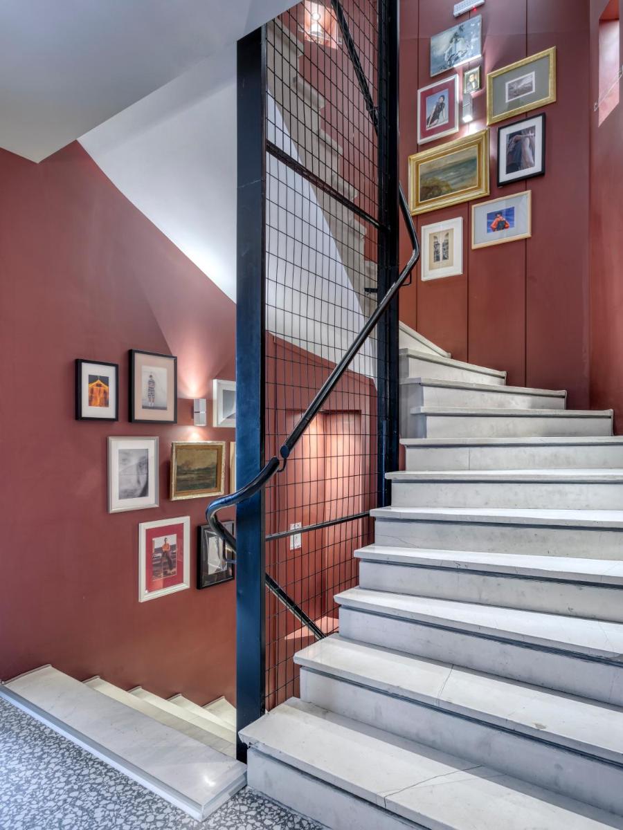 Les intérieurs regorgent de caractère, avec des papiers peints raffinés, des sols en marbre et un mobilier vintage rappelant l'âge d'or du modernisme athénien. Une petite pépite est le sol en damier d'origine qui traverse les espaces communs, créant un contraste visuel fascinant avec les œuvres d'art contemporain exposées. Chaque suite est conçue comme un appartement privé de luxe.