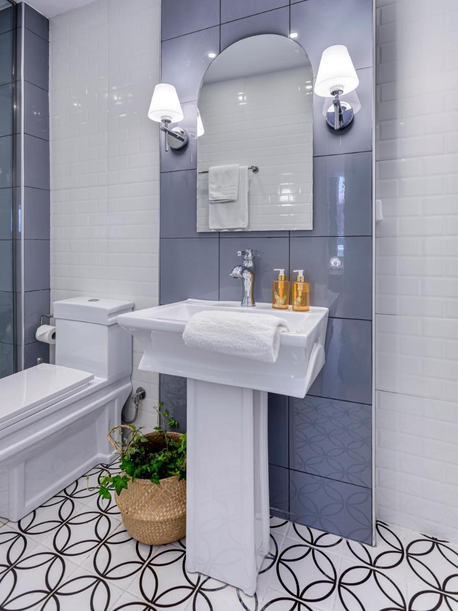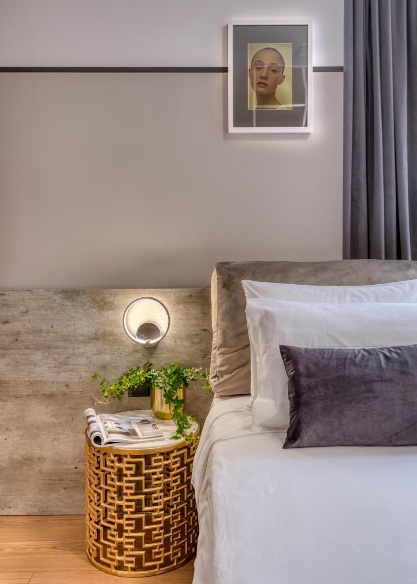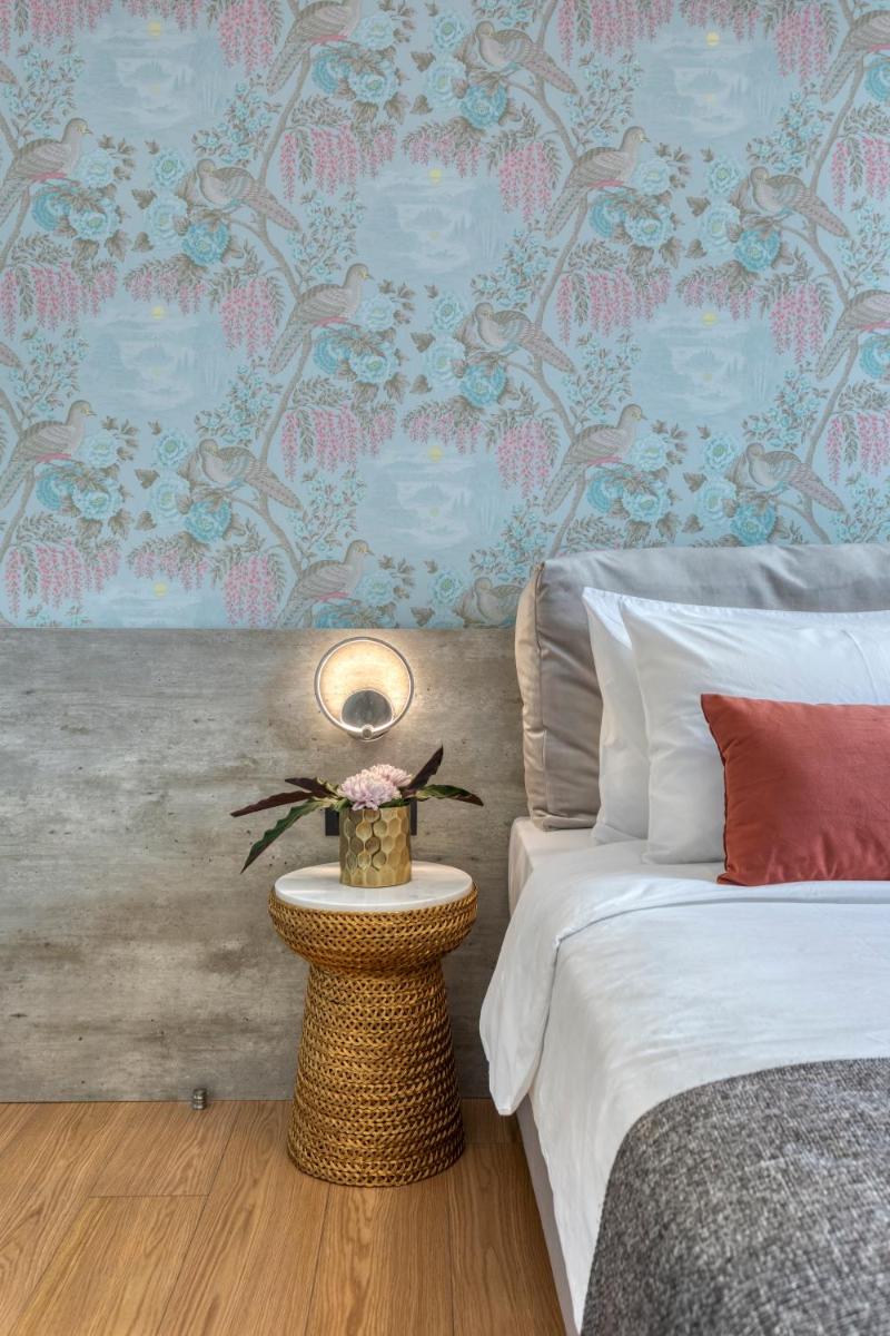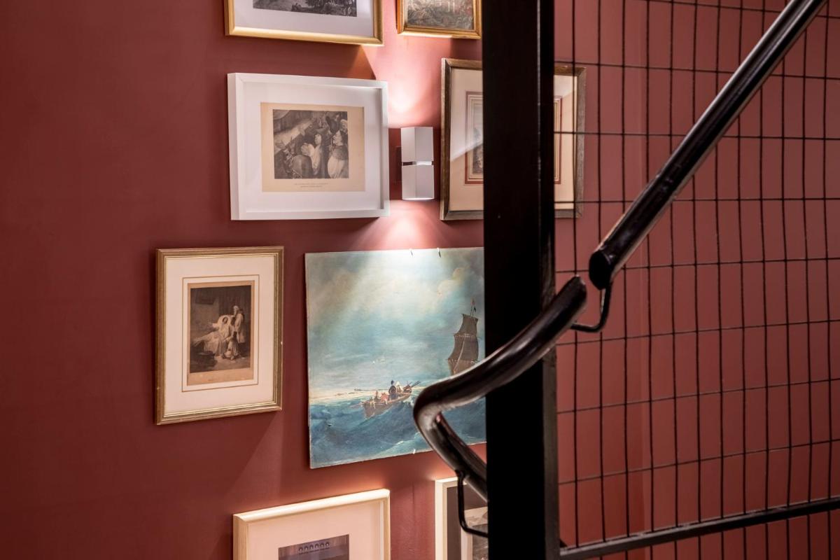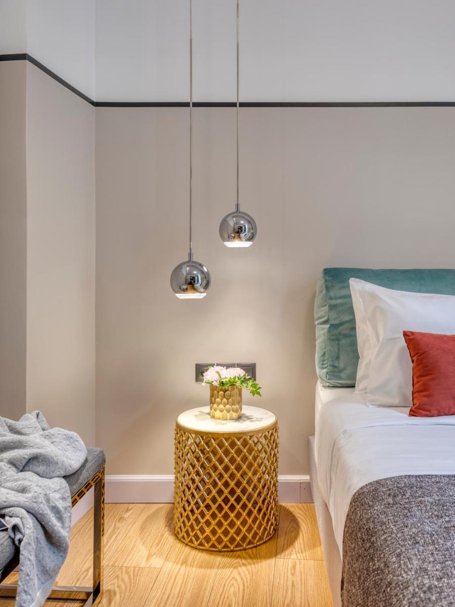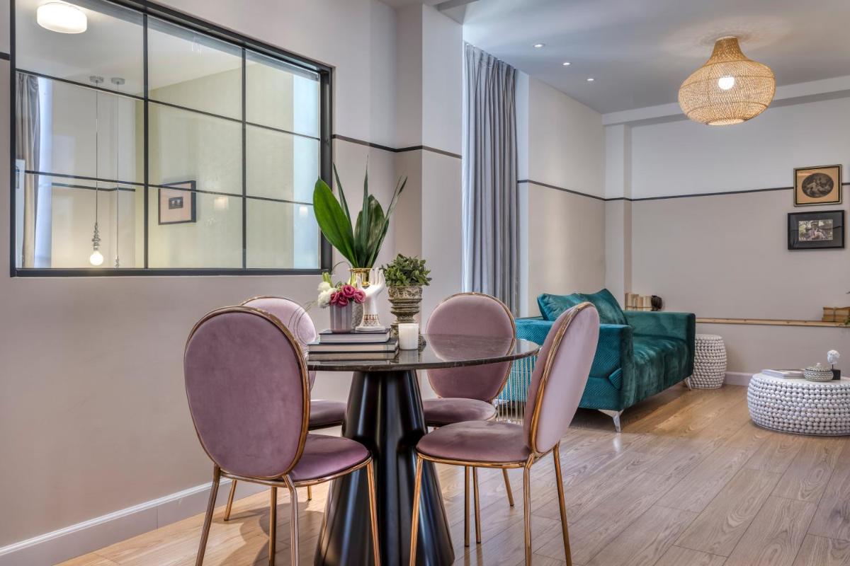 Les intérieurs regorgent de caractère, avec des papiers peints raffinés, des sols en marbre et un mobilier vintage rappelant l'âge d'or du modernisme athénien. Une petite pépite est le sol en damier d'origine qui traverse les espaces communs, créant un contraste visuel fascinant avec les œuvres d'art contemporain exposées. Chaque suite est conçue comme un appartement privé de luxe.