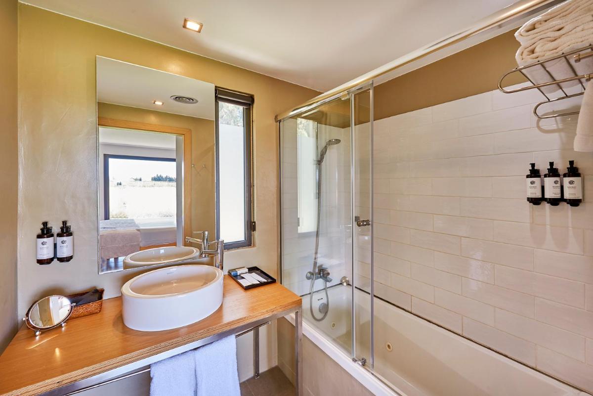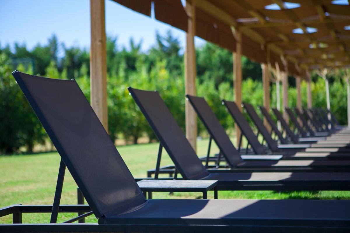 L'extérieur est caractérisé par de vastes jardins, des arbres fruitiers et des oliviers centenaires, où se trouvent la piscine principale et plusieurs zones de détente. La présence de canaux et de petites cascades rappelant l'ancienne fonction du moulin ajoute un élément de sérénité et de fraîcheur à l'environnement.