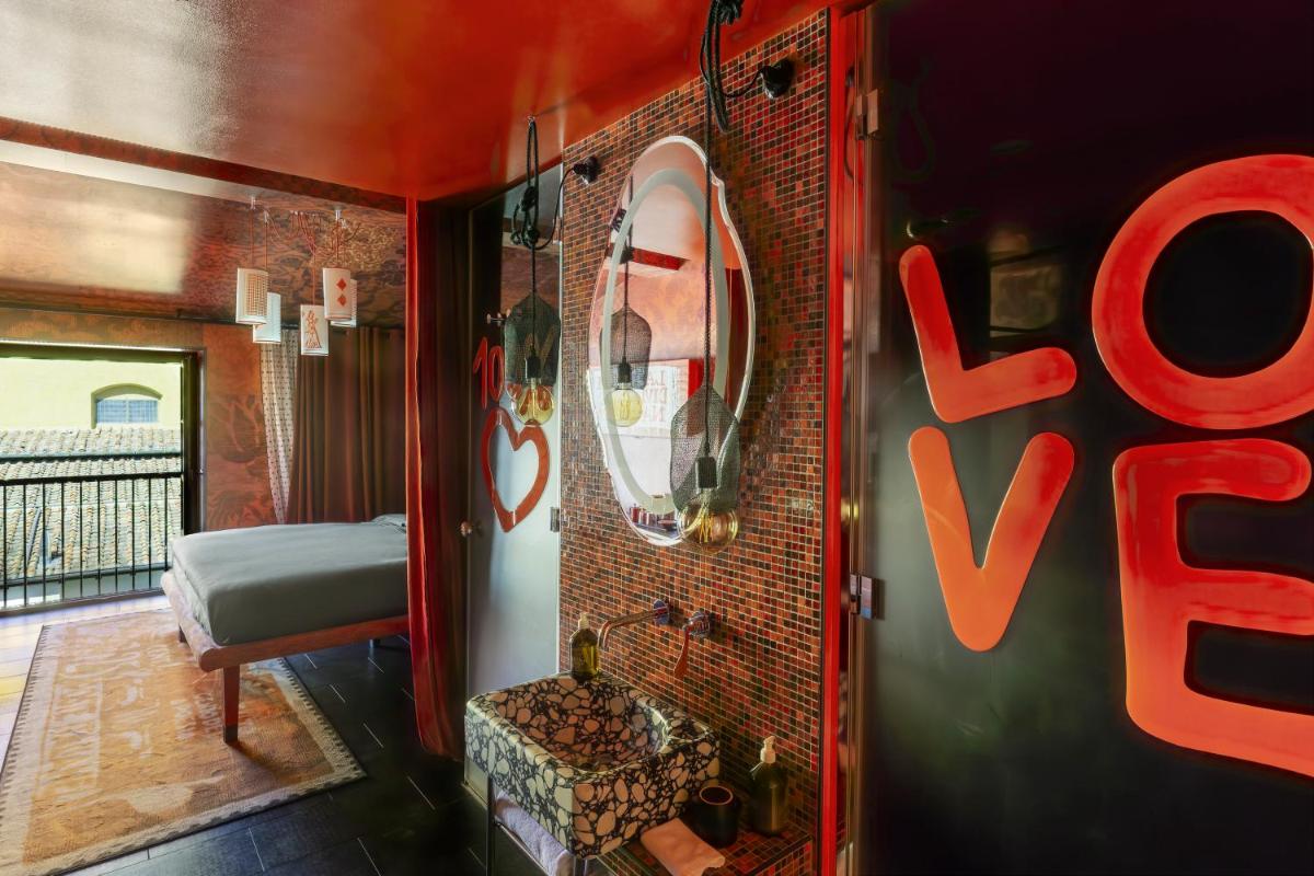 Le 171 camere e suite si dividono tra i temi "Paradiso" e "Inferno", ognuna caratterizzata da arredi eclettici e dettagli curati che spaziano dal sacro al profano. L'interior design, curato da Paola Navone, trasforma ogni spazio in una narrazione visiva, offrendo un mix unico di arte moderna, colori vivaci e richiami alla tradizione locale. Molte camere godono di affacci sui cortili interni o sul panorama cittadino.