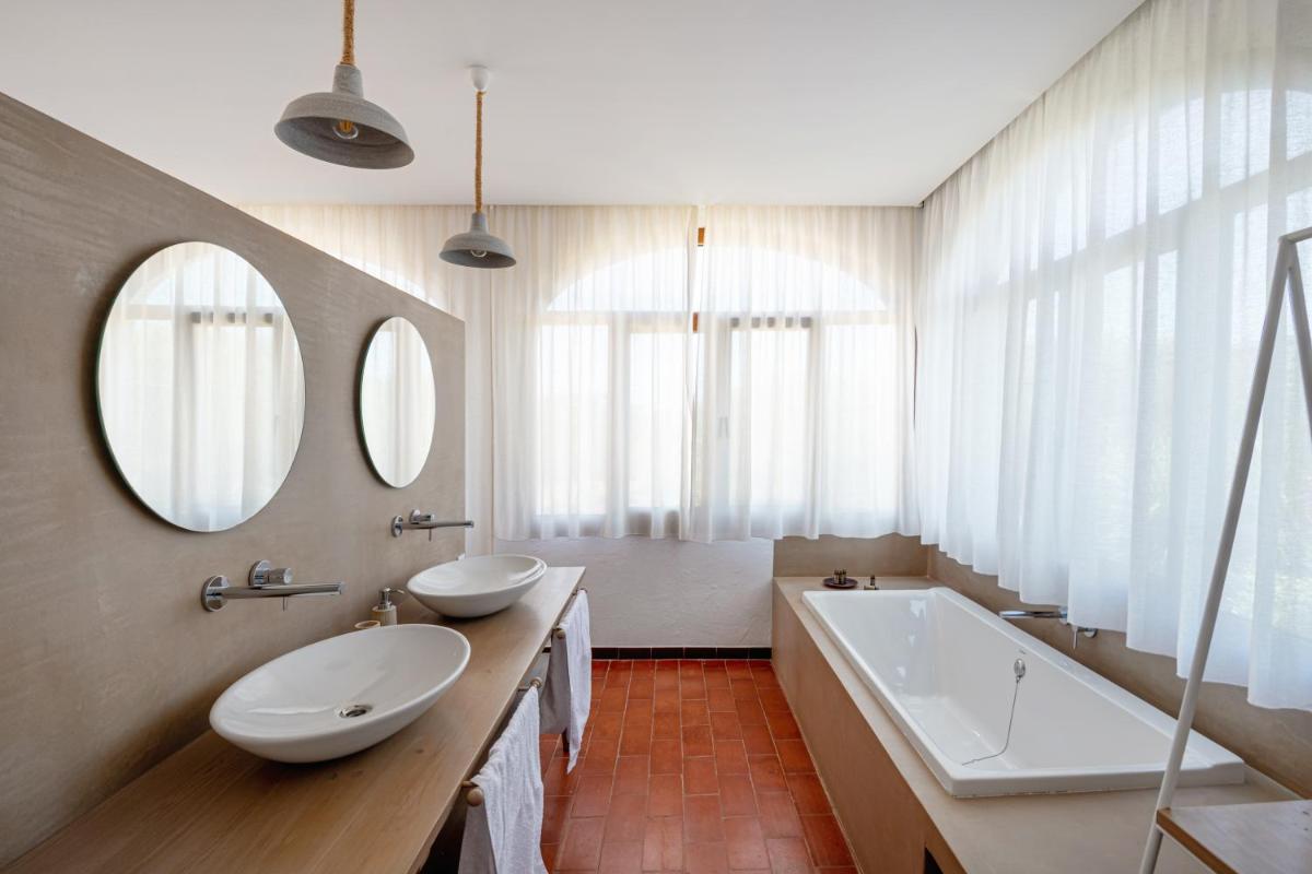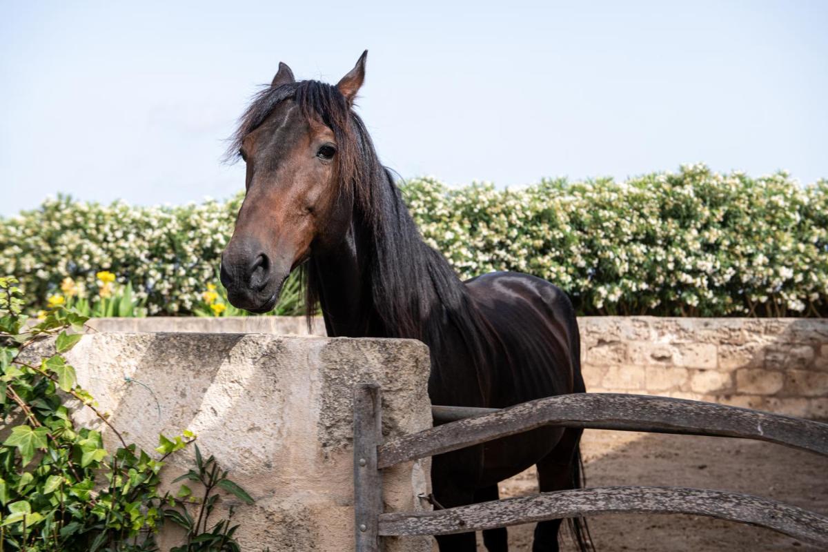 Il cuore dell'agriturismo è la splendida area esterna. La piscina, incorniciata da una terrazza solarium e circondata da giardini lussureggianti di ulivi e piante autoctone, è il luogo ideale per il relax. La vista si estende sui campi aperti, offrendo un senso di isolamento pacifico e un profondo contatto con la natura incontaminata di Minorca.