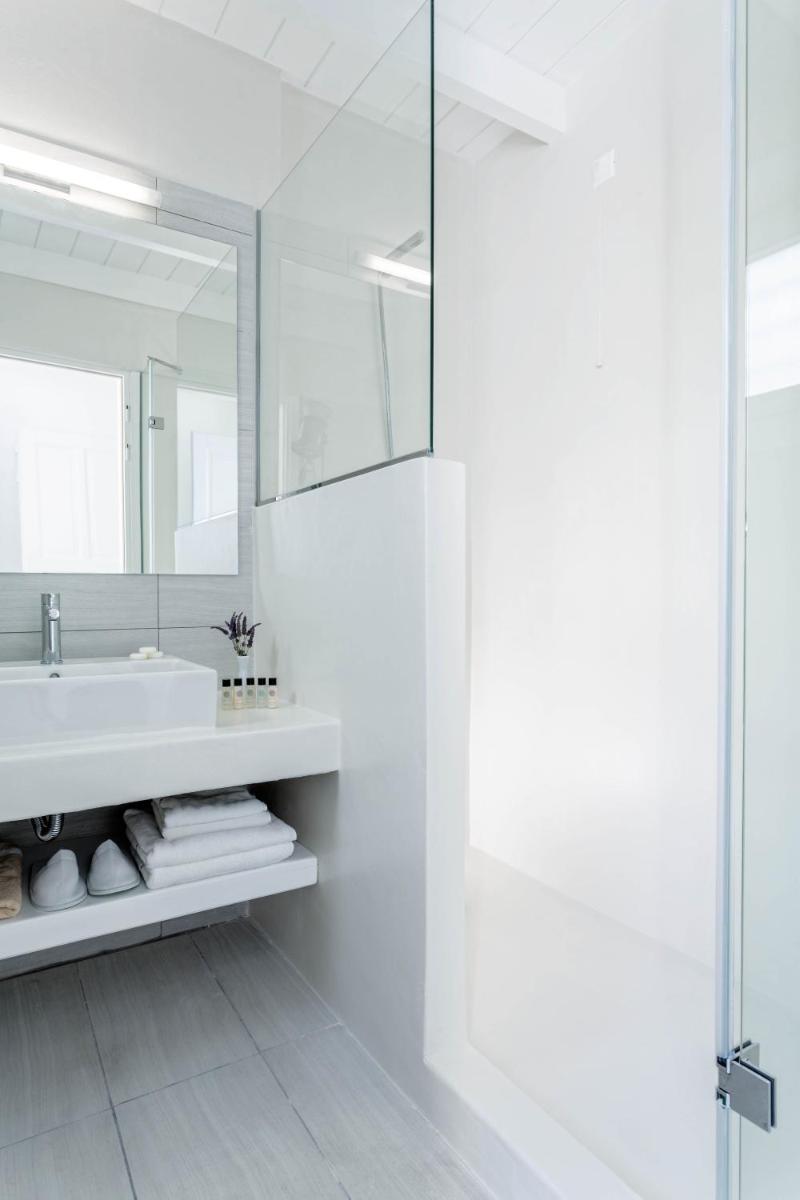 Le sistemazioni riflettono l'estetica pura e luminosa dell'isola, con arredi in legno chiaro, tessuti naturali e pareti bianche. Molte camere e suite vantano balconi o terrazze private che offrono viste panoramiche sul Mar Egeo e sulla baia circostante. Sono un invito al relax, fornendo un santuario personale dove la tranquillità è garantita.