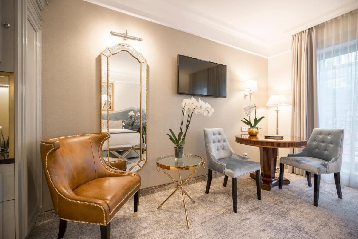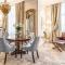 Gli interni sono caratterizzati da uno sfarzo discreto, con l'uso sapiente di materiali nobili come mosaici in marmo, lampadari di cristallo e ornamenti dorati. Le grandi finestre del palazzo ottocentesco incorniciano viste pittoresche sulla curva della Vistola e sul castello, garantendo un soggiorno di puro lusso e raffinatezza.