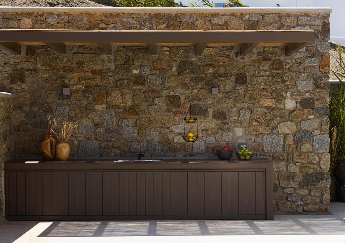 Il design si distingue per l'uso di linee pulite, muri bianchi, cemento lucido e pietra naturale. L'estetica è fresca e contemporanea, massimizzando la luce naturale e la vista sul paesaggio di Mykonos.