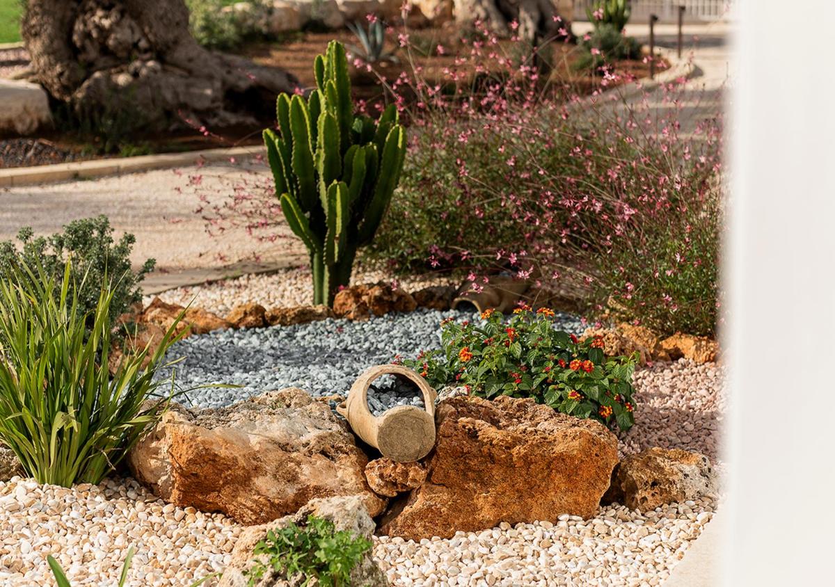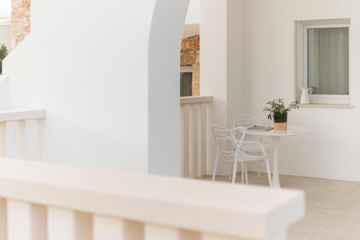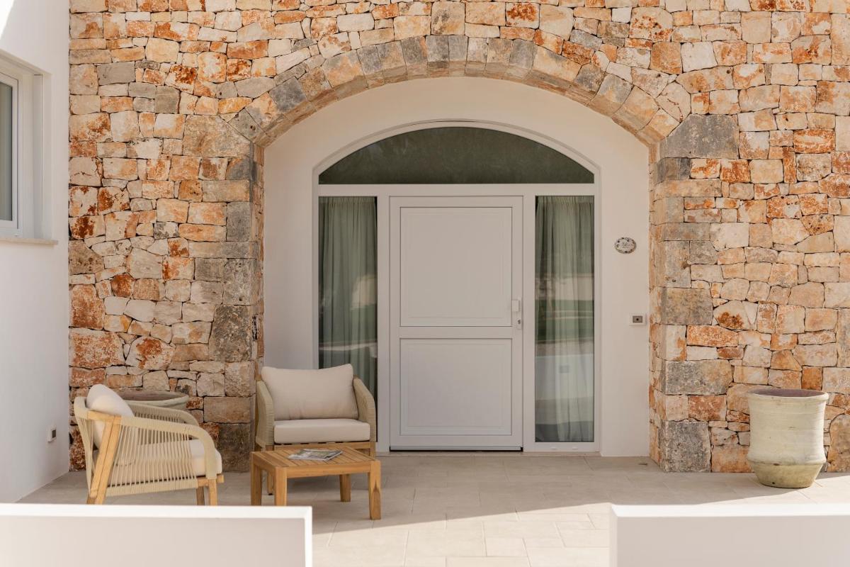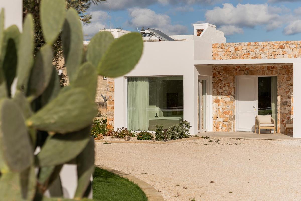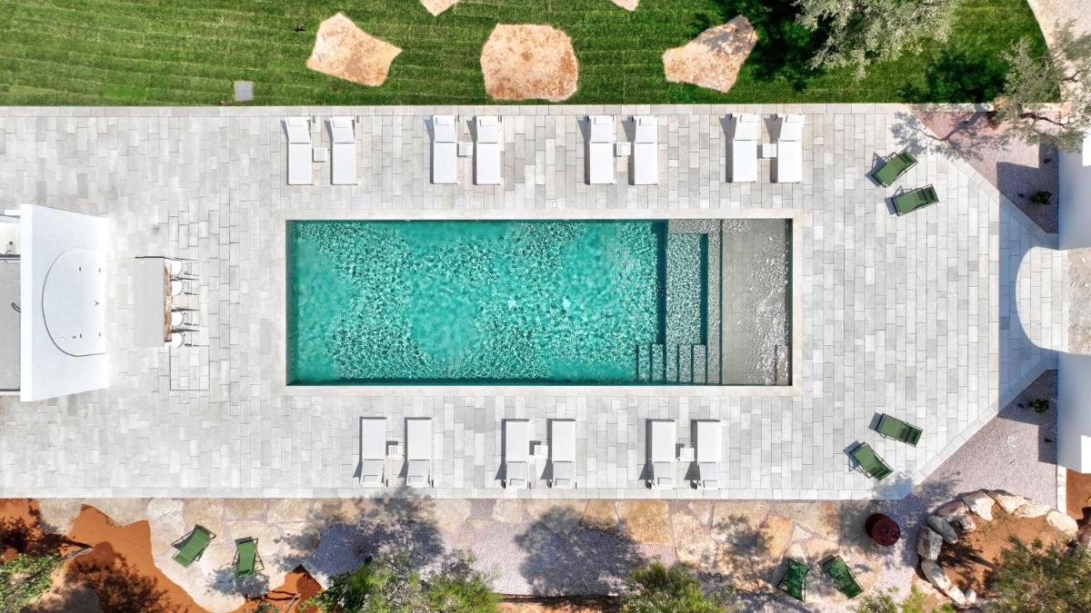L'area esterna vanta una splendida piscina circondata da muretti a secco e vegetazione mediterranea. È un angolo di puro relax dove il silenzio è interrotto solo dal fruscio delle foglie. La piscina a sfioro offre una vista privilegiata sulla campagna di Fasano, trasformandosi in un palcoscenico naturale durante le ore del tramonto, quando la pietra bianca del borgo si tinge di rosa.