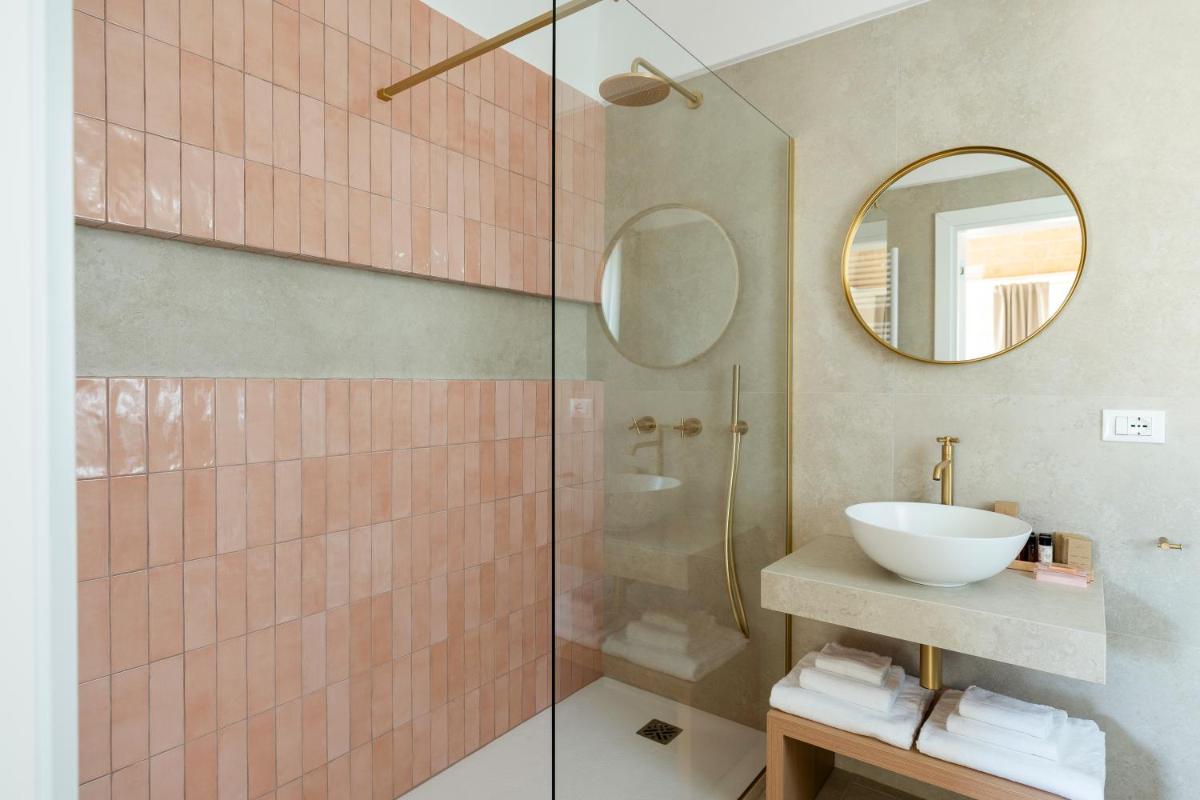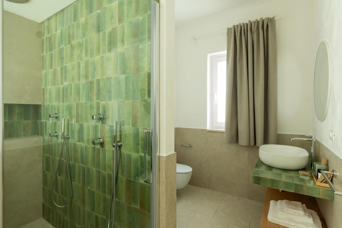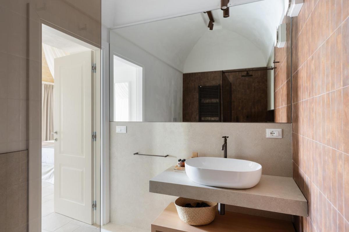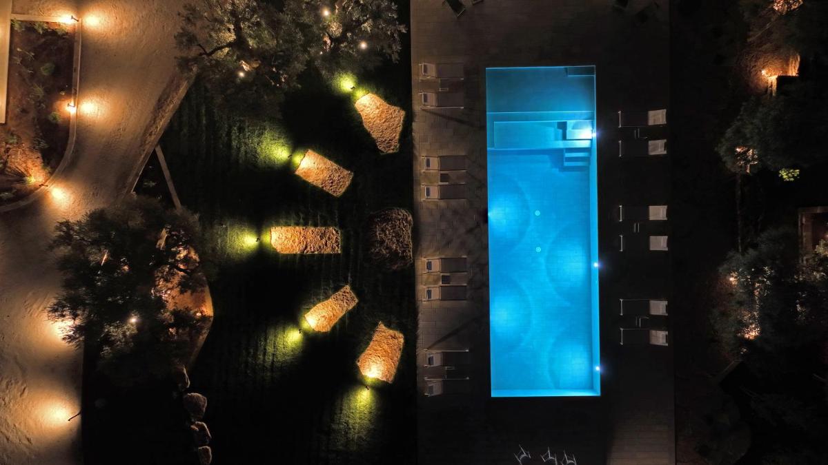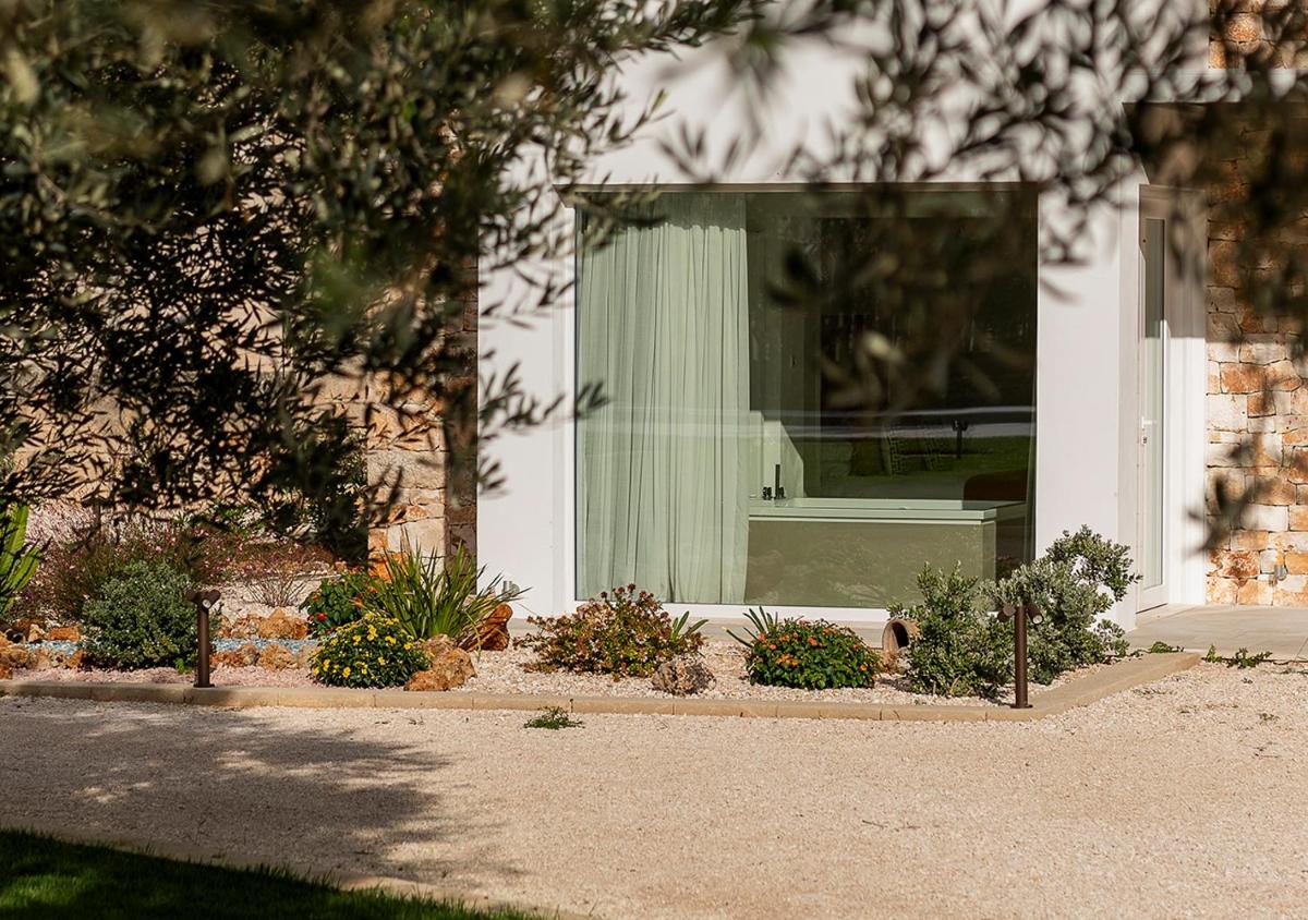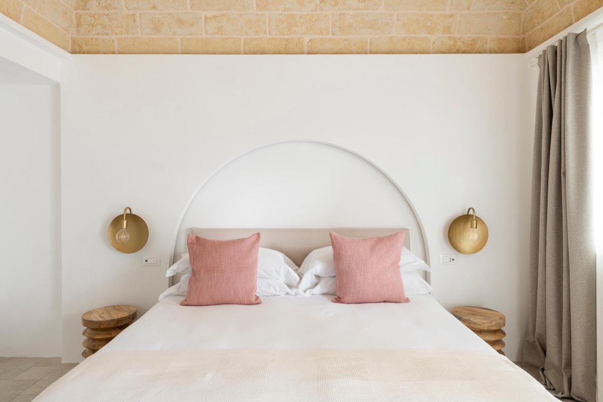 L'area esterna vanta una splendida piscina circondata da muretti a secco e vegetazione mediterranea. È un angolo di puro relax dove il silenzio è interrotto solo dal fruscio delle foglie. La piscina a sfioro offre una vista privilegiata sulla campagna di Fasano, trasformandosi in un palcoscenico naturale durante le ore del tramonto, quando la pietra bianca del borgo si tinge di rosa.