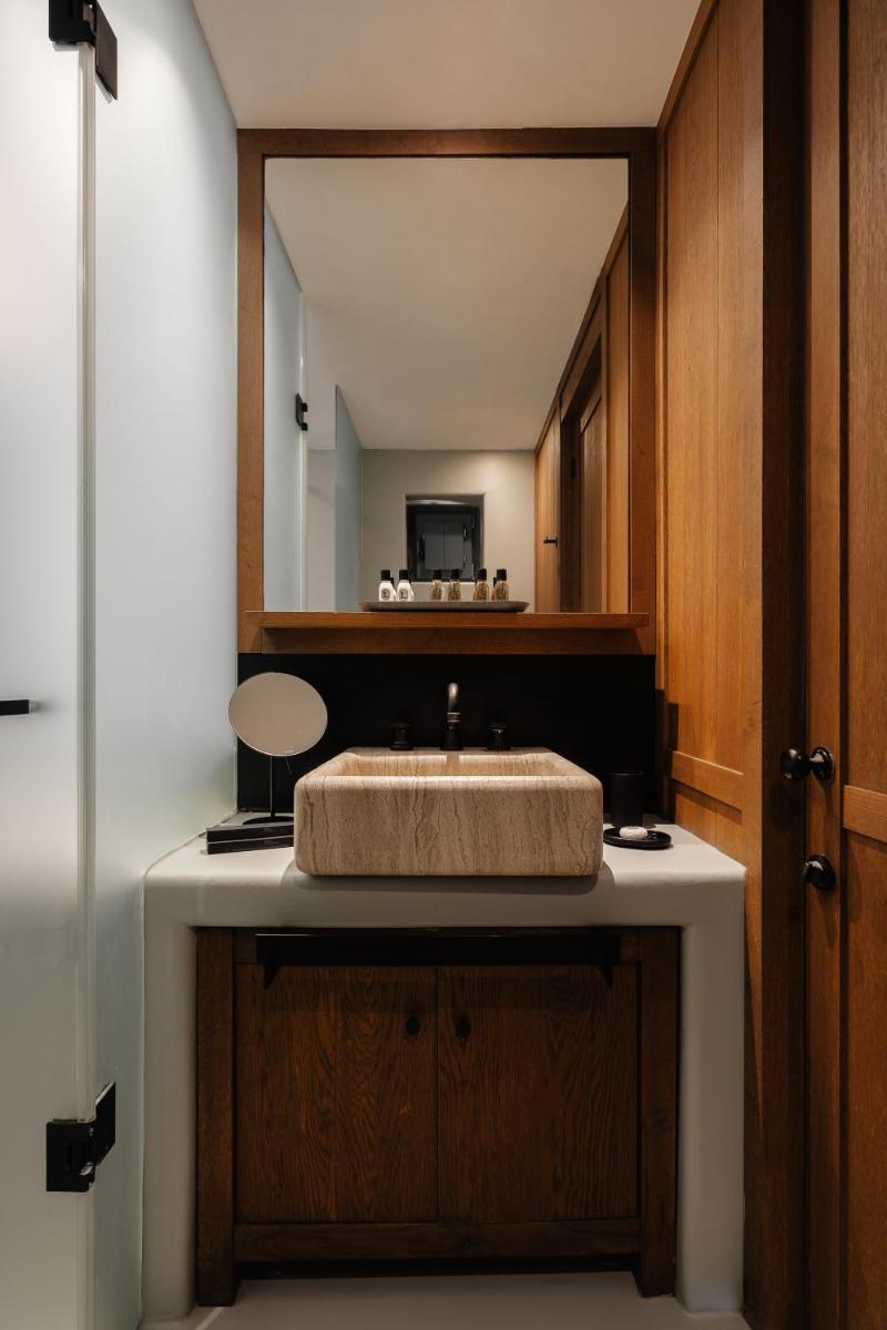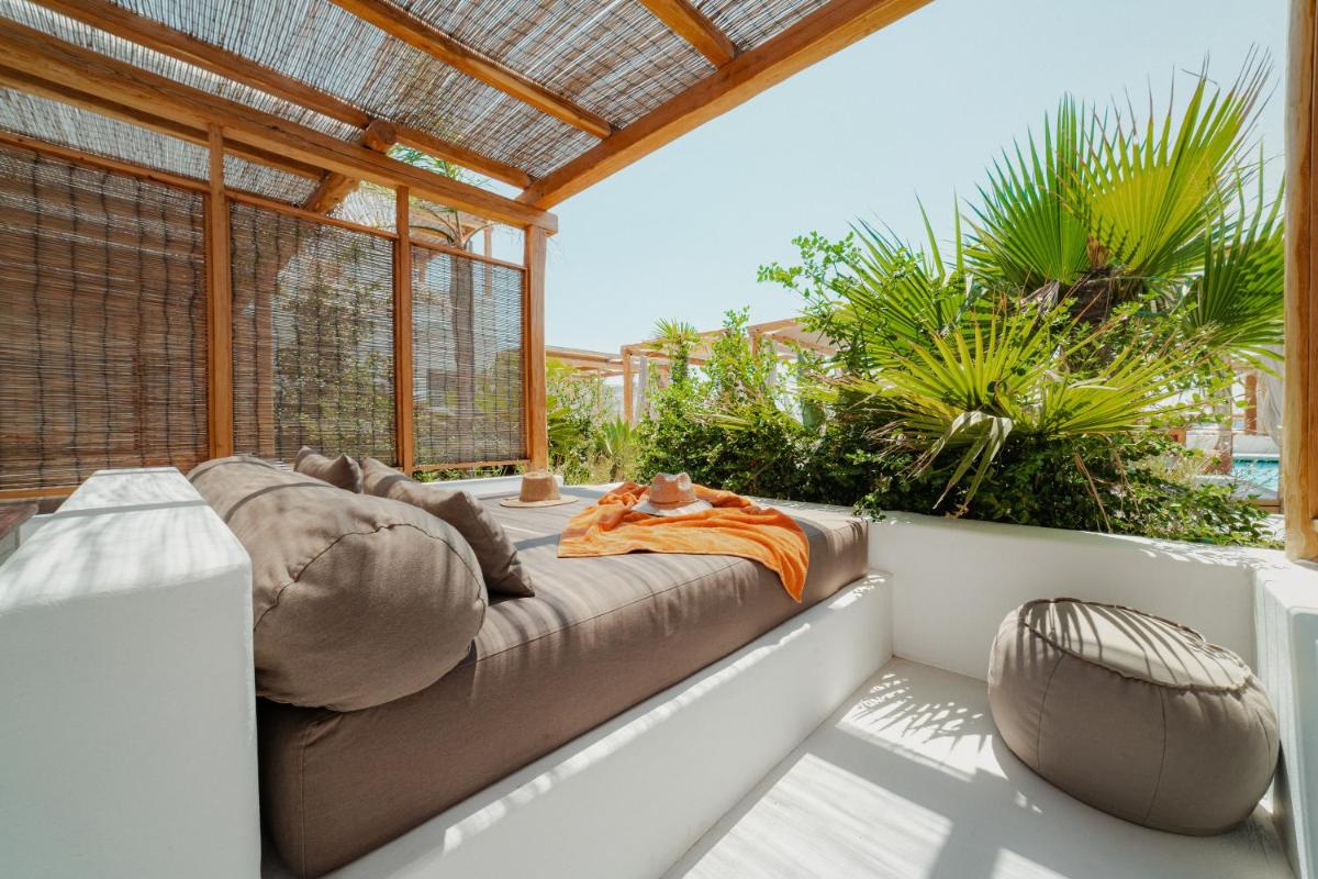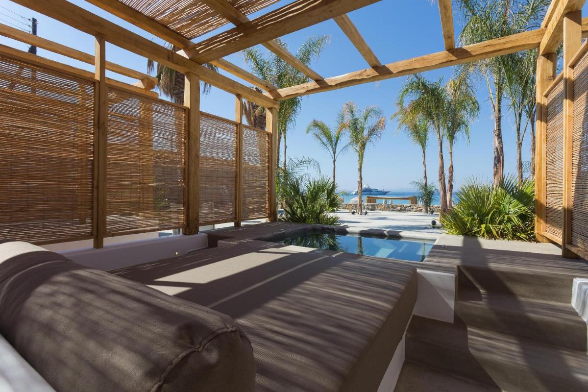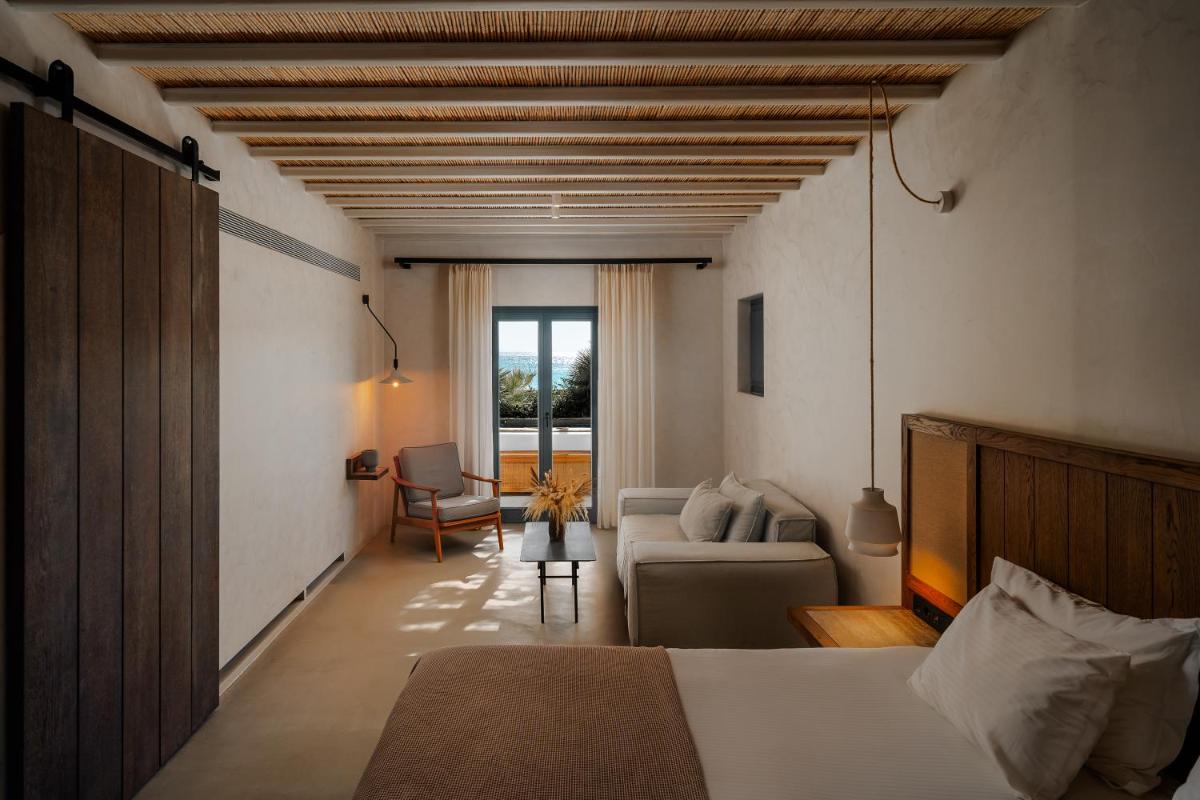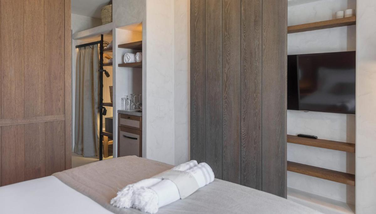 Le camere e le suite sono progettate con uno stile fresco e contemporaneo, caratterizzato da toni neutri, lino di alta qualità e tocchi di design. Molte delle sistemazioni vantano vasche idromassaggio private o piccole piscine sui balconi, offrendo una vista incantevole sul Mar Egeo e sulla spiaggia animata.