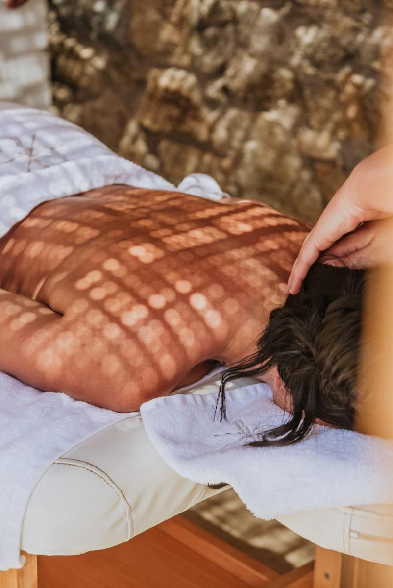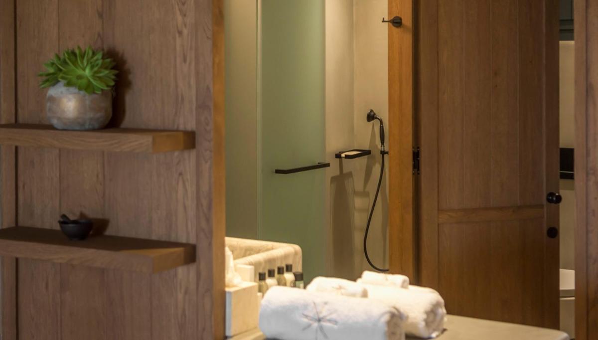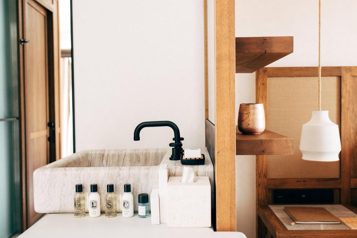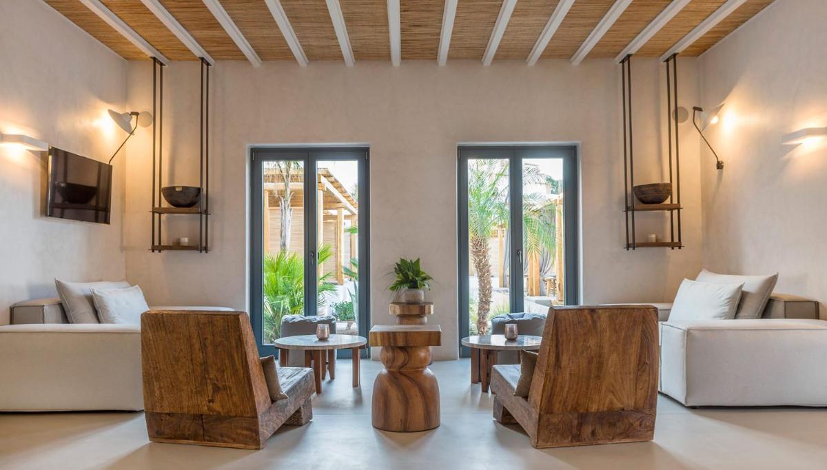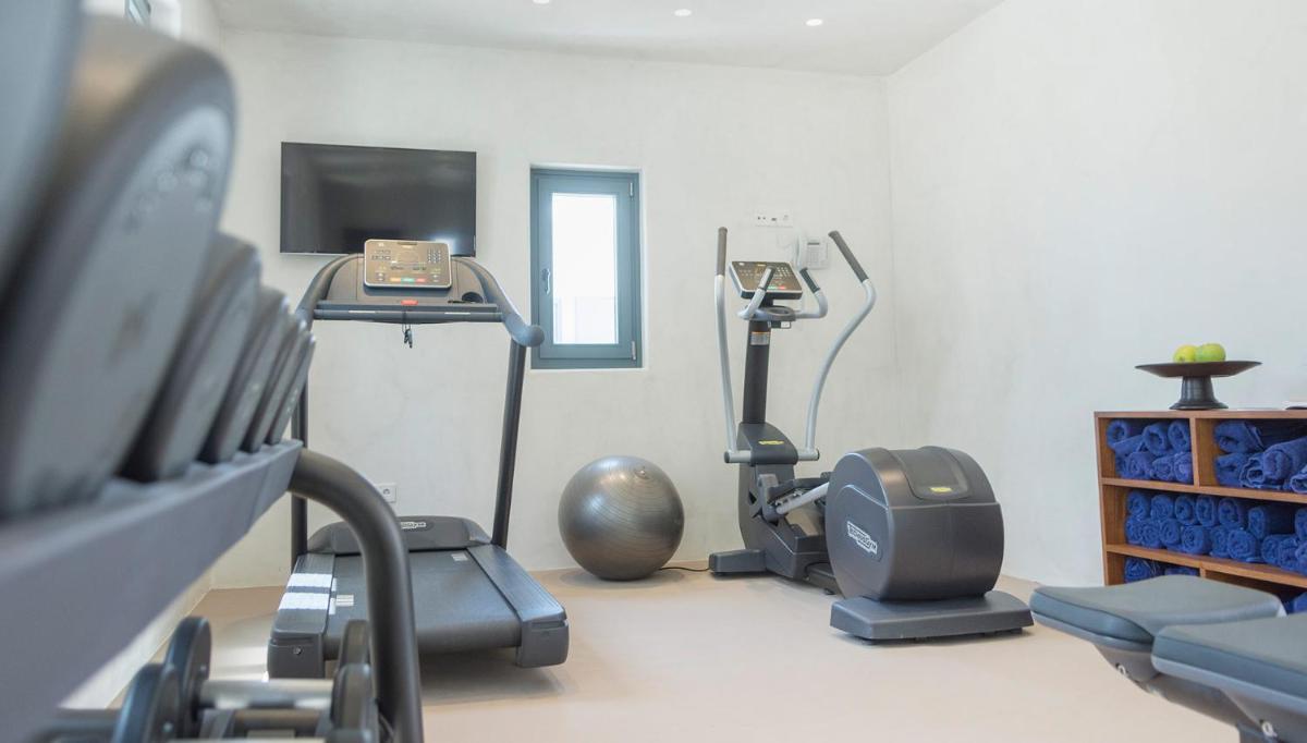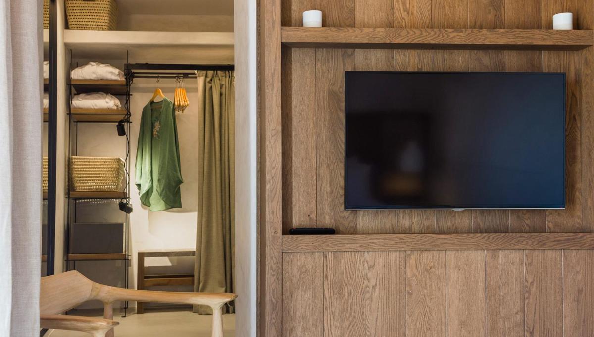 Le camere e le suite sono progettate con uno stile fresco e contemporaneo, caratterizzato da toni neutri, lino di alta qualità e tocchi di design. Molte delle sistemazioni vantano vasche idromassaggio private o piccole piscine sui balconi, offrendo una vista incantevole sul Mar Egeo e sulla spiaggia animata.