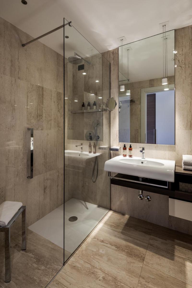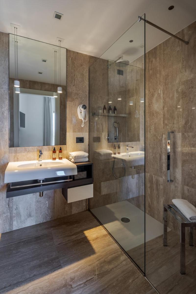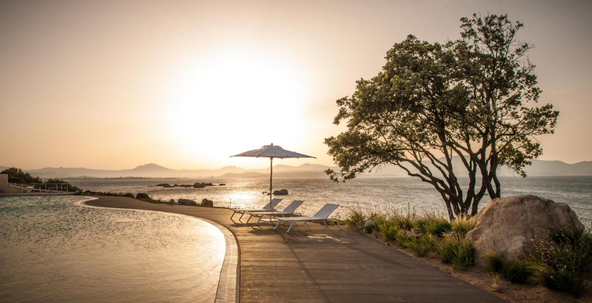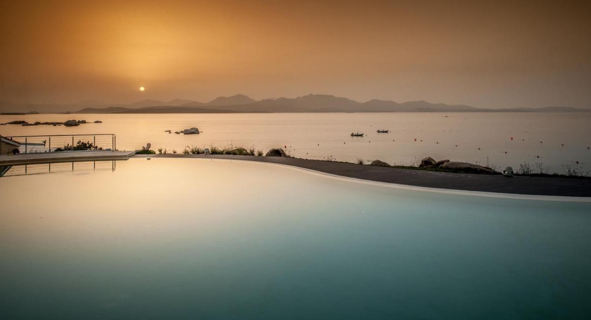 Il punto focale della zona esterna è la magnifica piscina a sfioro, che sembra fondersi con il mare, circondata da una vasta area solarium attrezzata con lettini e ombrelloni. A pochi passi, la spiaggia riservata garantisce privacy e tranquillità. Gli ospiti possono godere di lettini e ombrelloni inclusi, oltre alla possibilità di praticare sport acquatici o noleggiare imbarcazioni.
