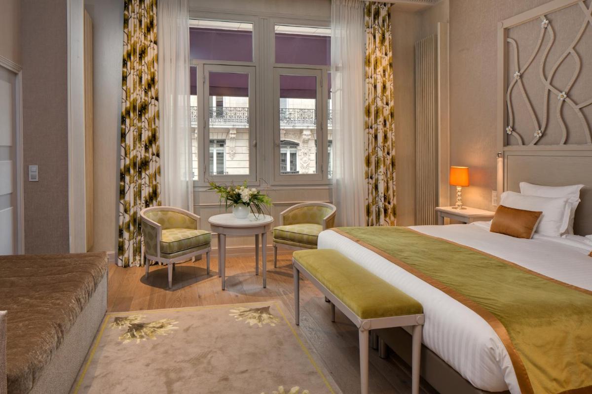 Gli interni sono stati curati per riflettere un'eleganza senza tempo, con arredi in stile Luigi XV e Luigi XVI, tessuti preziosi e lampadari scintillanti. L'atmosfera è intima e accogliente, con aree comuni che invitano al relax in un ambiente che celebra l'artigianato francese e la sua storia decorativa.