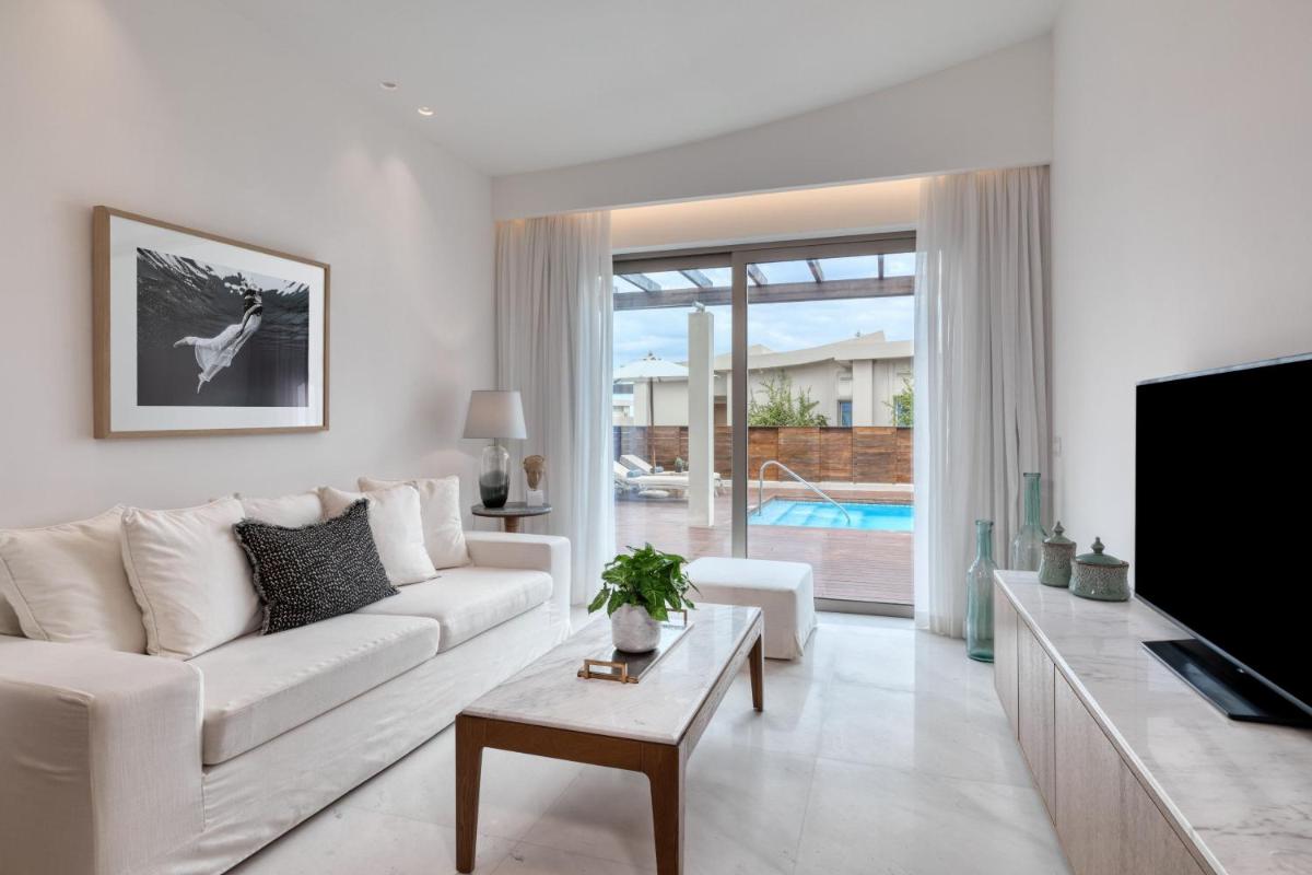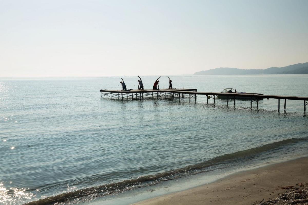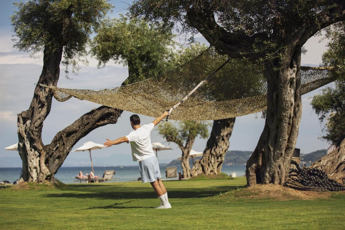 Il resort vanta una magnifica piscina a sfioro circondata da eleganti cabanas private e lettini, offrendo un'atmosfera serena e sofisticata. La spiaggia privata è un'oasi di tranquillità, dove gli ospiti possono usufruire di servizi impeccabili e godere del mare cristallino di Corfù in totale pace.