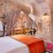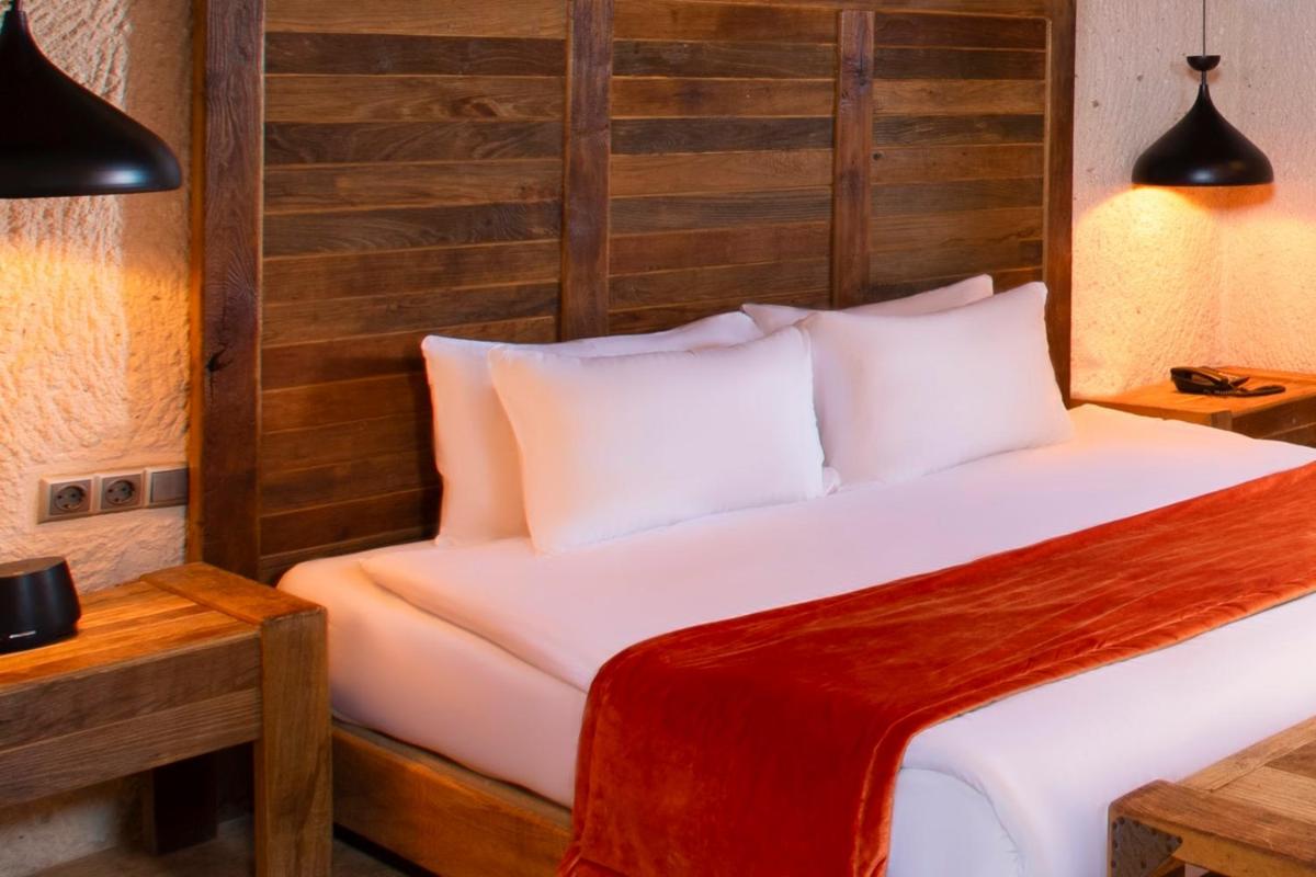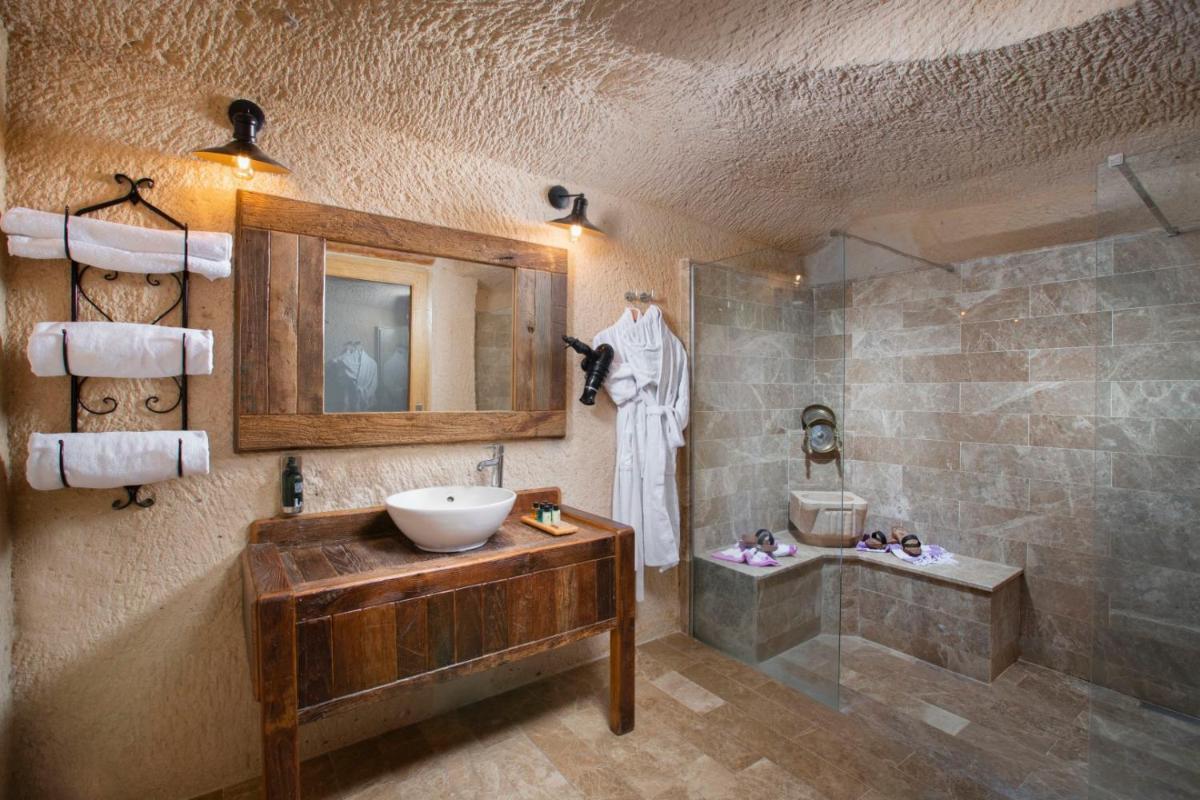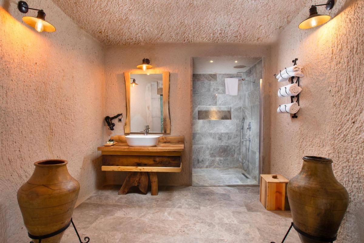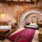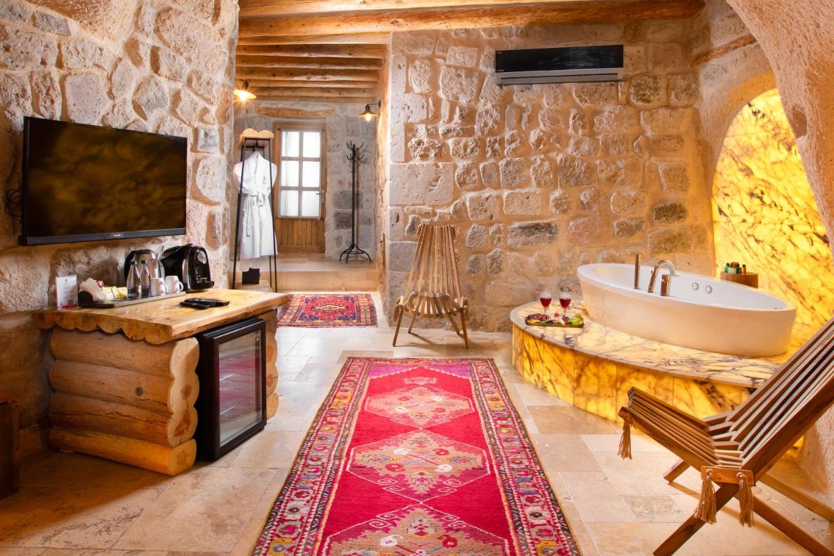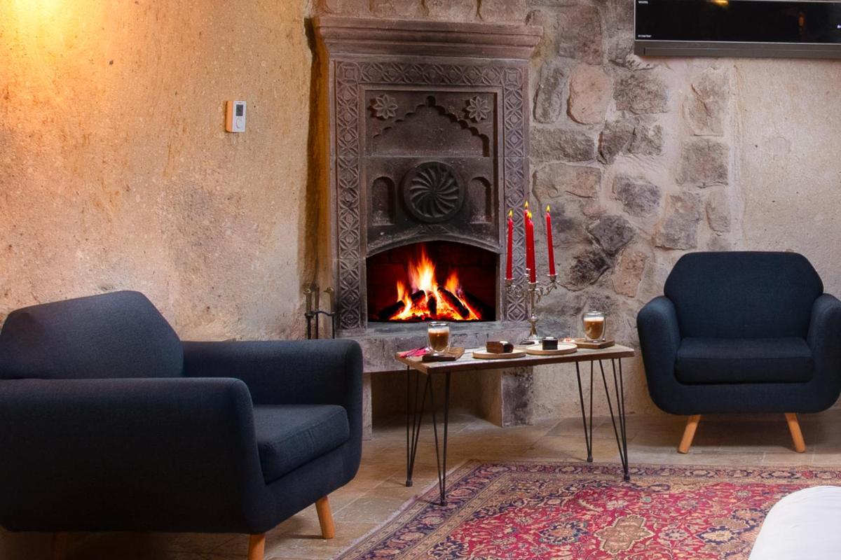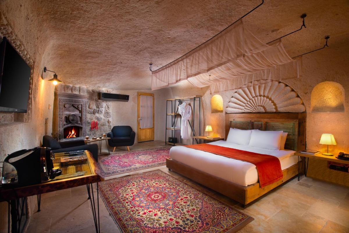 Le camere e le suite sono un capolavoro di design, mantendendo il fascino rustico delle caverne ma arricchite con arredi eleganti, letti lussuosi e bagni moderni. Molte delle suite offrono un camino e una terrazza privata da cui si può ammirare l'alba, spesso decorata dal volo colorato delle mongolfiere, regalando un risveglio indimenticabile e assolutamente fotogenico.