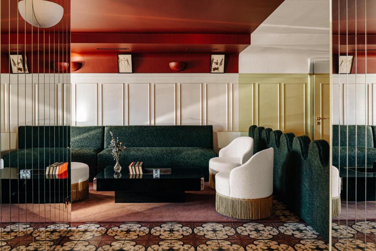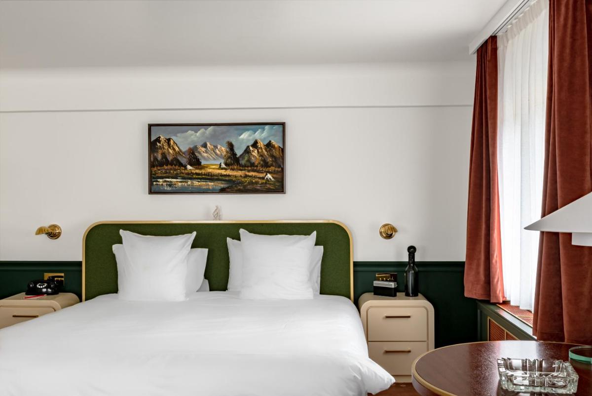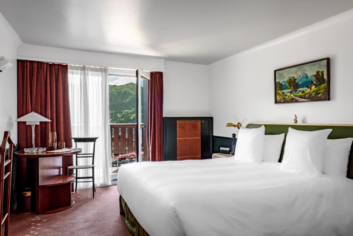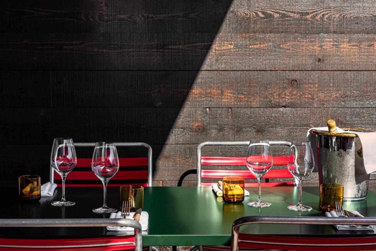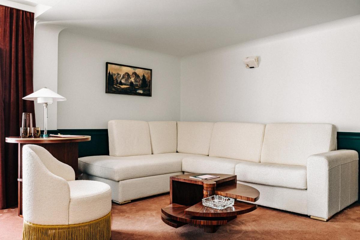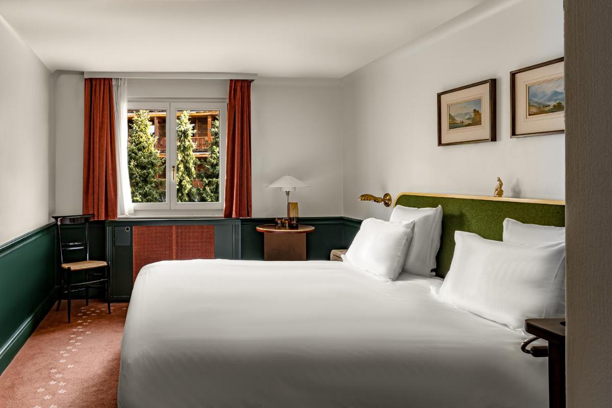 Le 39 camere e suite, alcune con la propria vasca idromassaggio esterna privata, sono state progettate da Dorothée Meilichzon. Il design si ispira allo stile Mid-Century Modern, con l'uso di legni scuri, lana, velluti e colori caldi che creano un contrasto affascinante con il paesaggio alpino esterno. Il risultato è un ambiente elegante e giocoso.