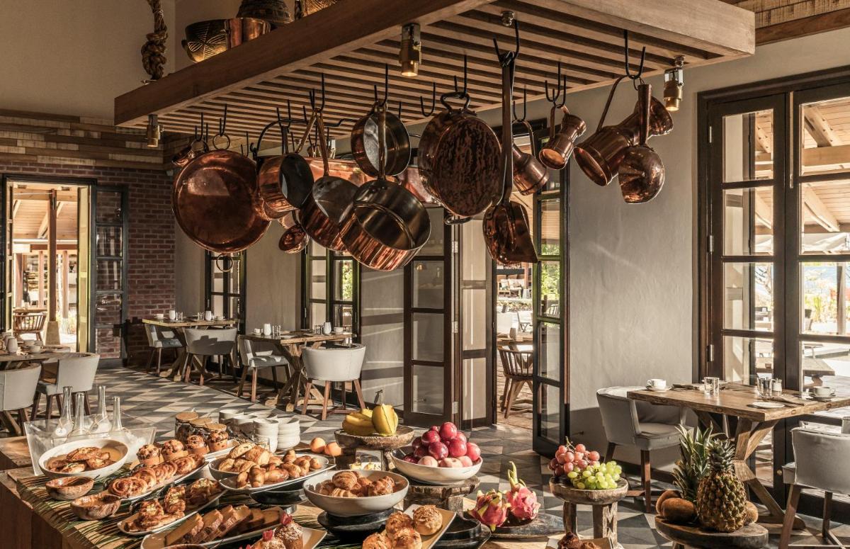 La cucina del resort celebra i sapori dell'Oceano Indiano e la fusione con la tradizione creola e internazionale. I ristoranti si concentrano sulla freschezza degli ingredienti locali, in particolare il pescato del giorno, con ambientazioni mozzafiato che spaziano da cene eleganti sulla sabbia a piatti più informali vicino alla piscina. L'attenzione alla sostenibilità è un elemento chiave dell'offerta gastronomica.