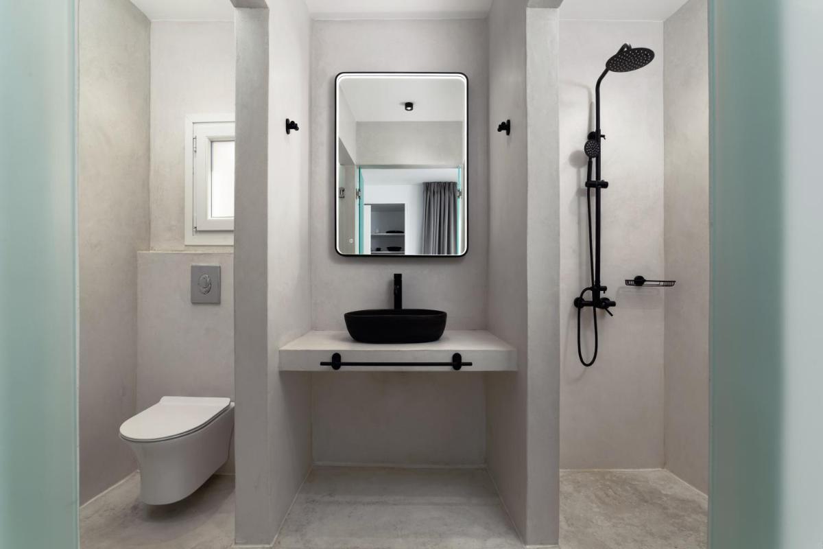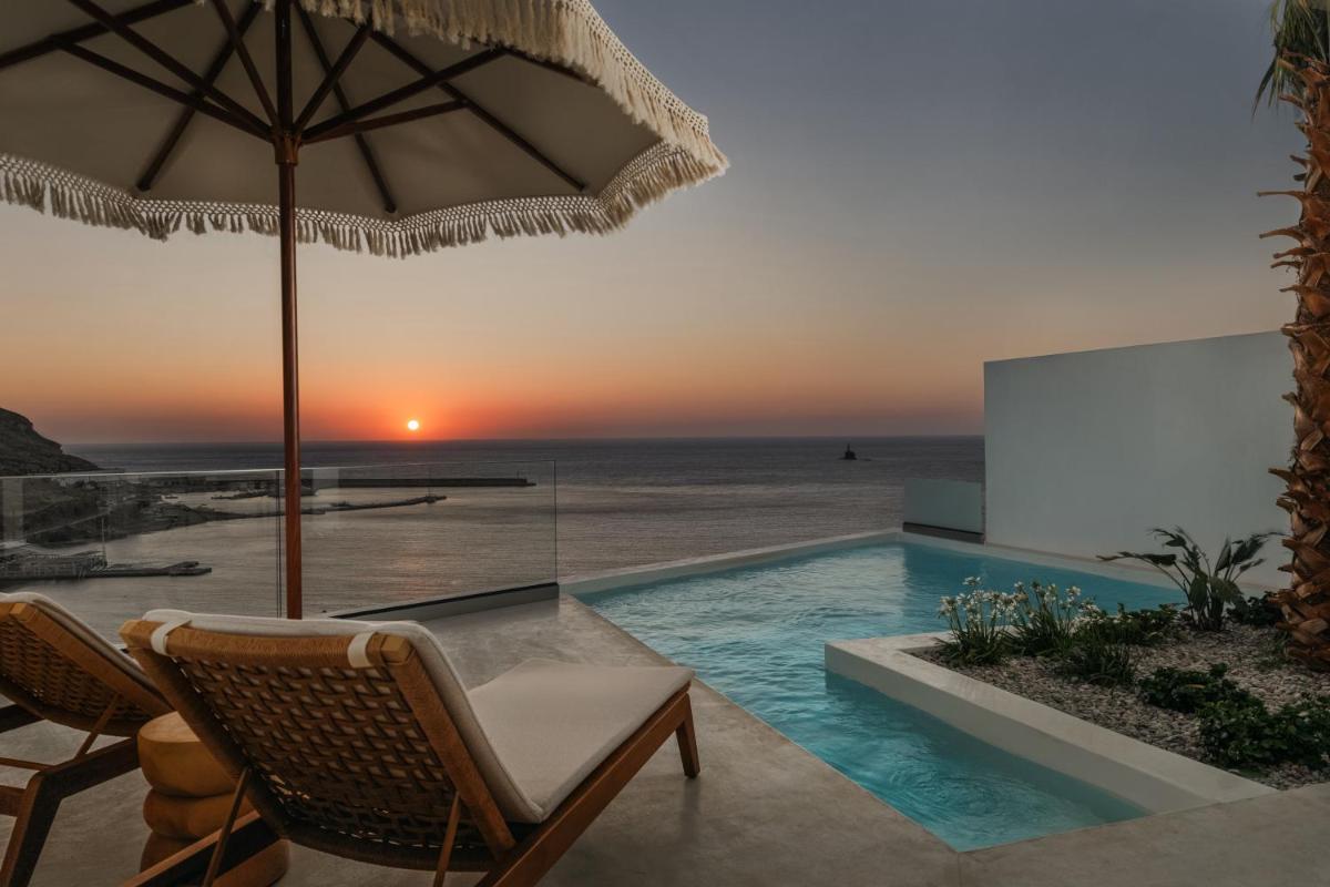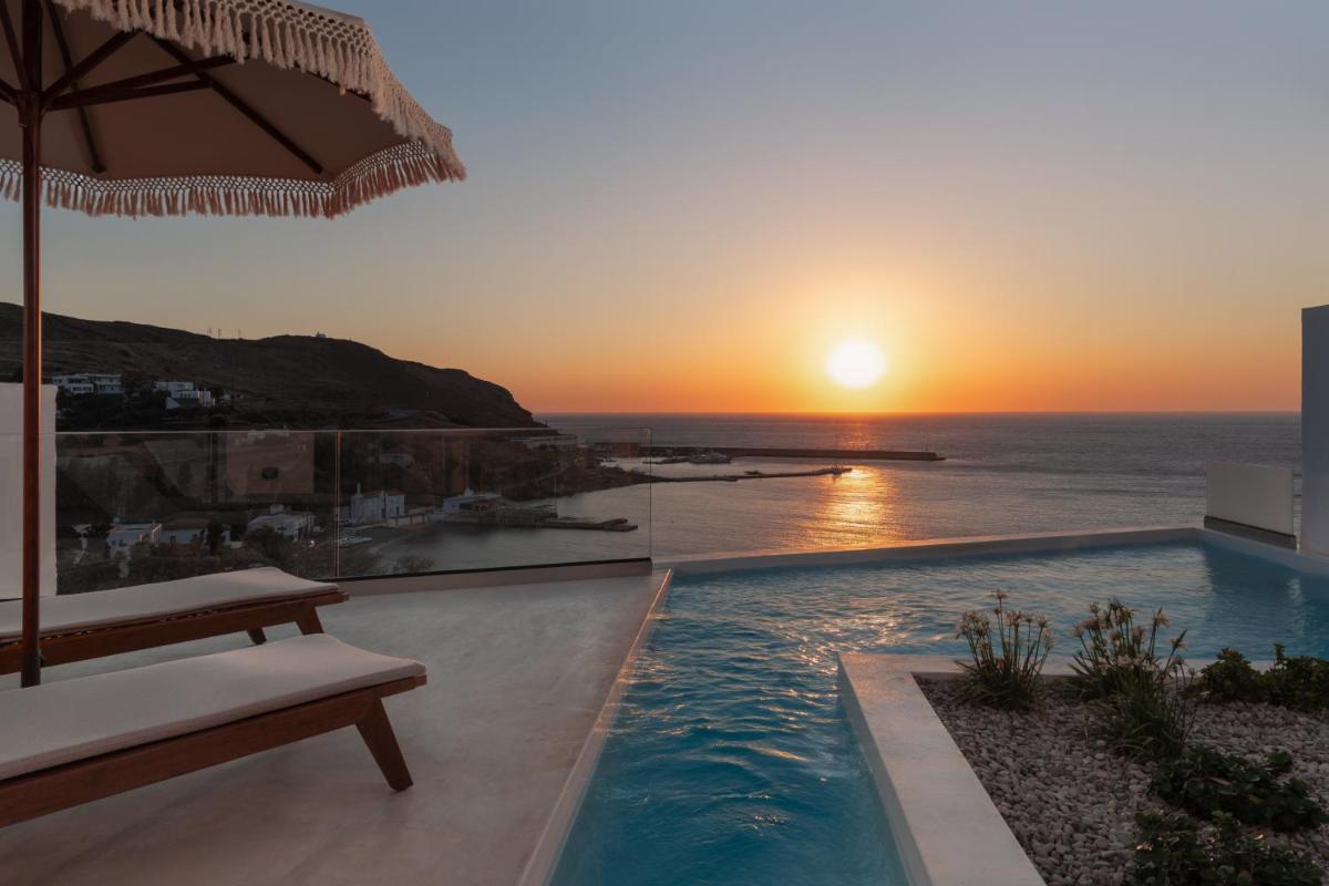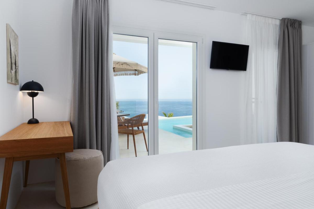 Le suite, spaziose e con una o più camere da letto, sono arredate in uno stile moderno che richiama l'estetica cicladica, con un'enfasi sul comfort e sulla luce naturale. Ogni unità è dotata di un angolo cottura completamente attrezzato e un balcone privato per godersi il panorama marino in totale libertà e autonomia.