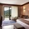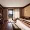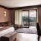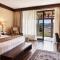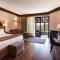 Opening to a patio with mountain views, this room includes a seating area and a bathroom with branded toiletries, bathrobes and slippers.