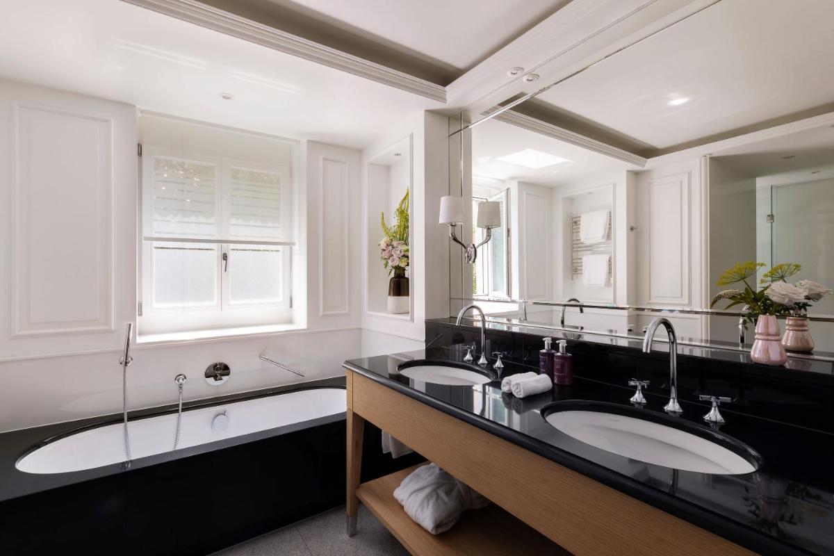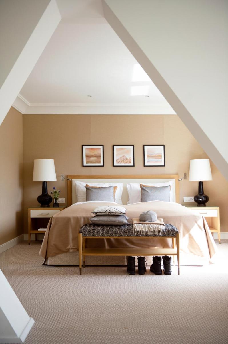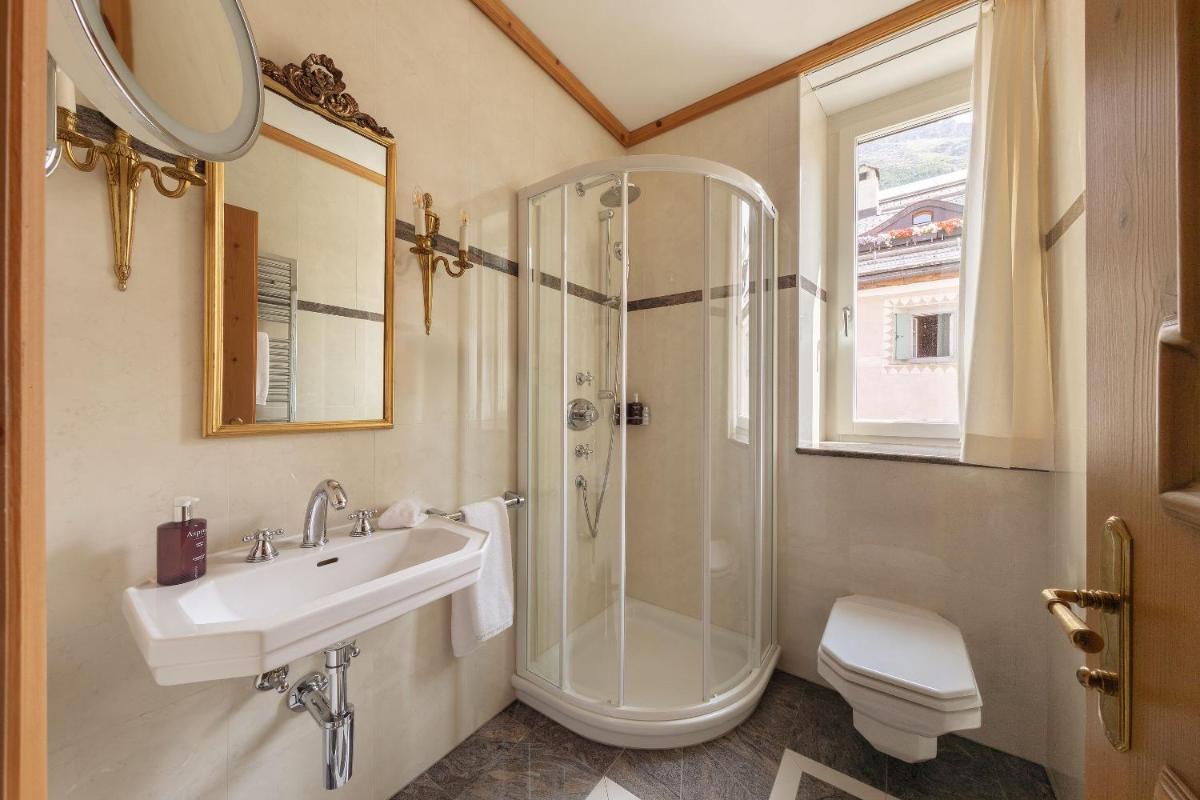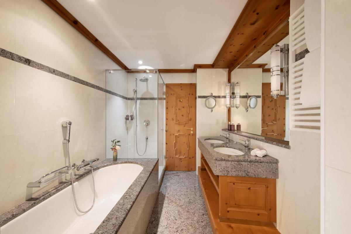 Le camere e le suite sono arredate con gusto, bilanciando il fascino storico con il comfort contemporaneo. Molte offrono panorami alpini mozzafiato. L'atmosfera è quella di una grande casa di campagna alpina, con interni ricchi, soffitti alti e un'attenzione meticolosa alla conservazione del patrimonio architettonico dell'edificio.