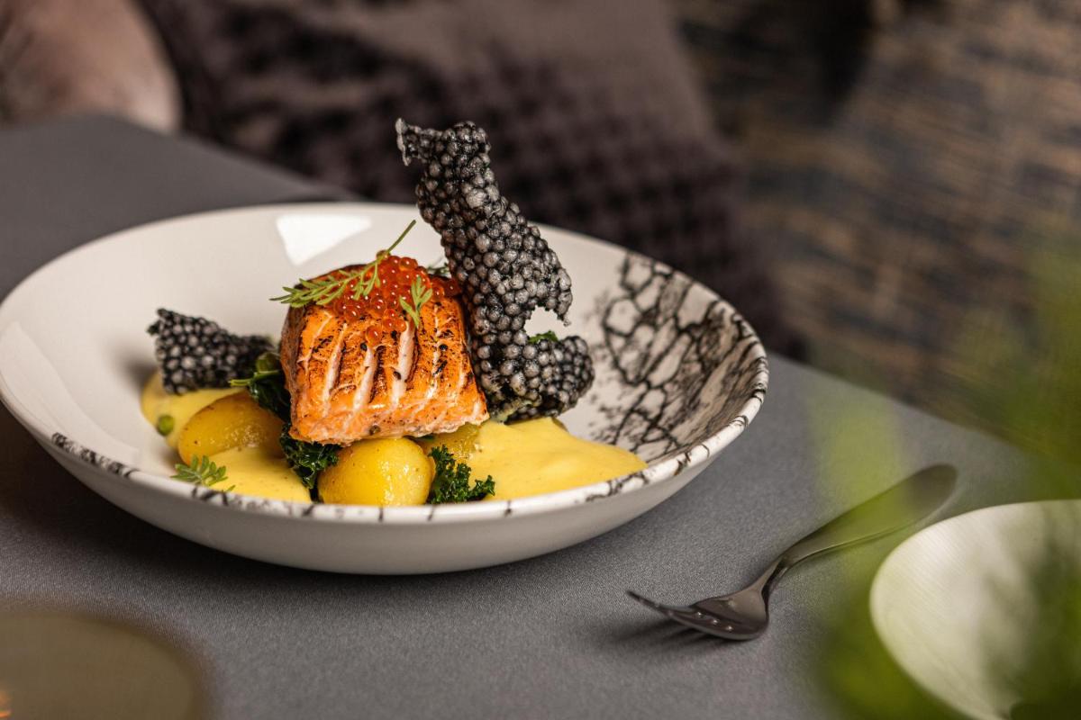 La proposta culinaria è curata dal ristorante, che propone un menu di ispirazione internazionale con un focus sui sapori freschi e gli ingredienti locali. L'ambiente è elegante e raffinato, perfetto per cene di alto livello o per un cocktail serale nel bar adiacente, un punto di incontro sofisticato.