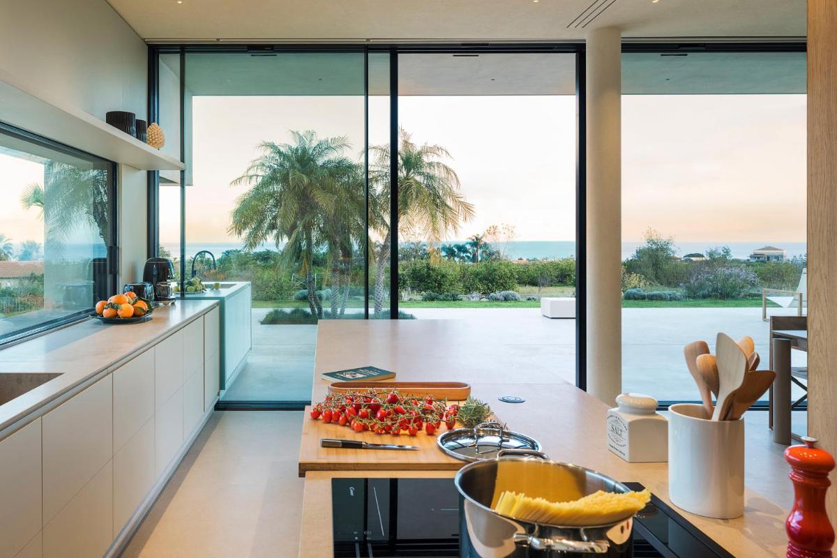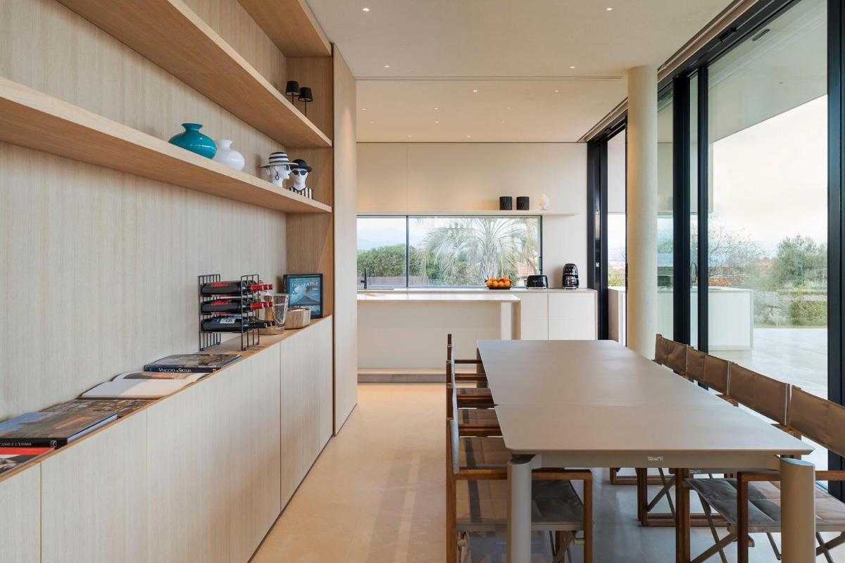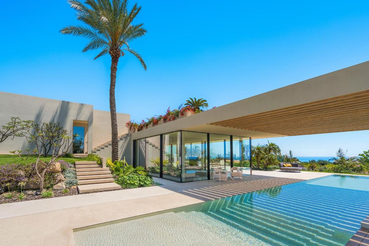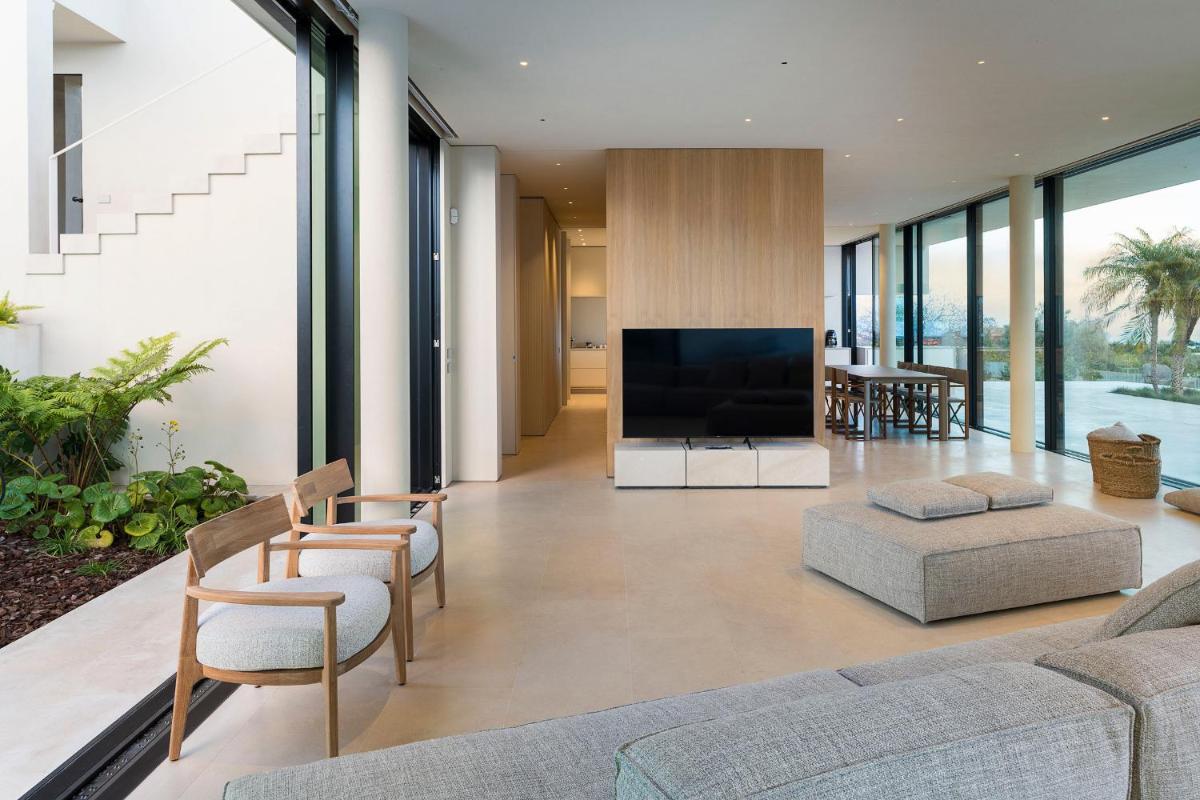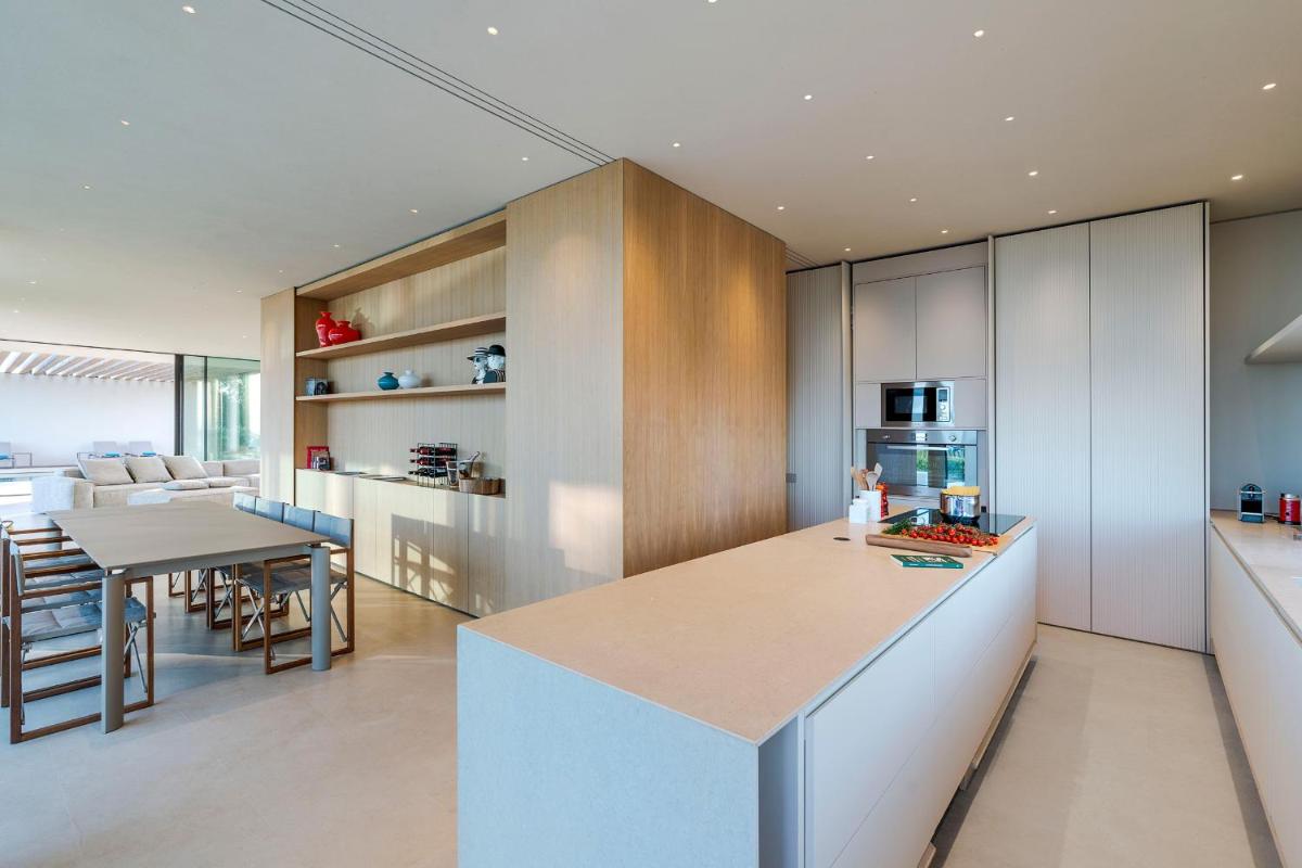 Distribuita su tre livelli, la villa ospita quattro ampie camere con bagno privato, arredi moderni, aria condizionata e ampie vetrate. Gli interni luminosi presentano linee contemporanee e materiali di pregio.