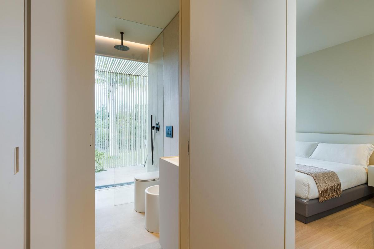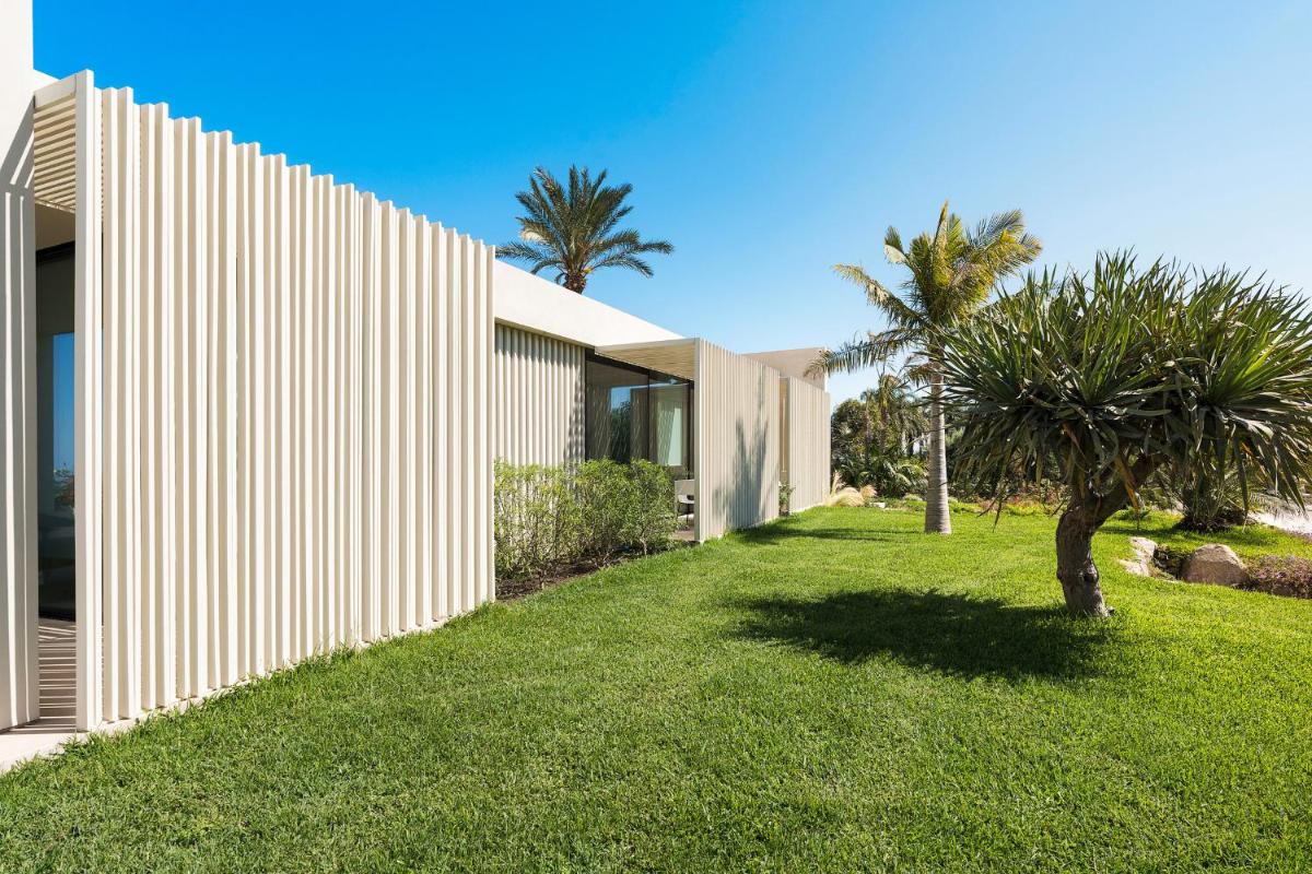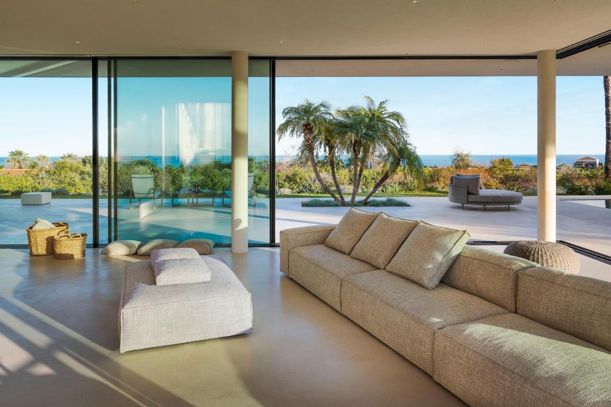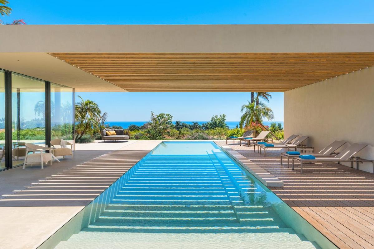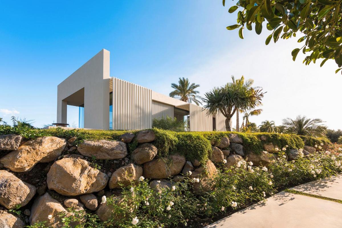 Distribuita su tre livelli, la villa ospita quattro ampie camere con bagno privato, arredi moderni, aria condizionata e ampie vetrate. Gli interni luminosi presentano linee contemporanee e materiali di pregio.