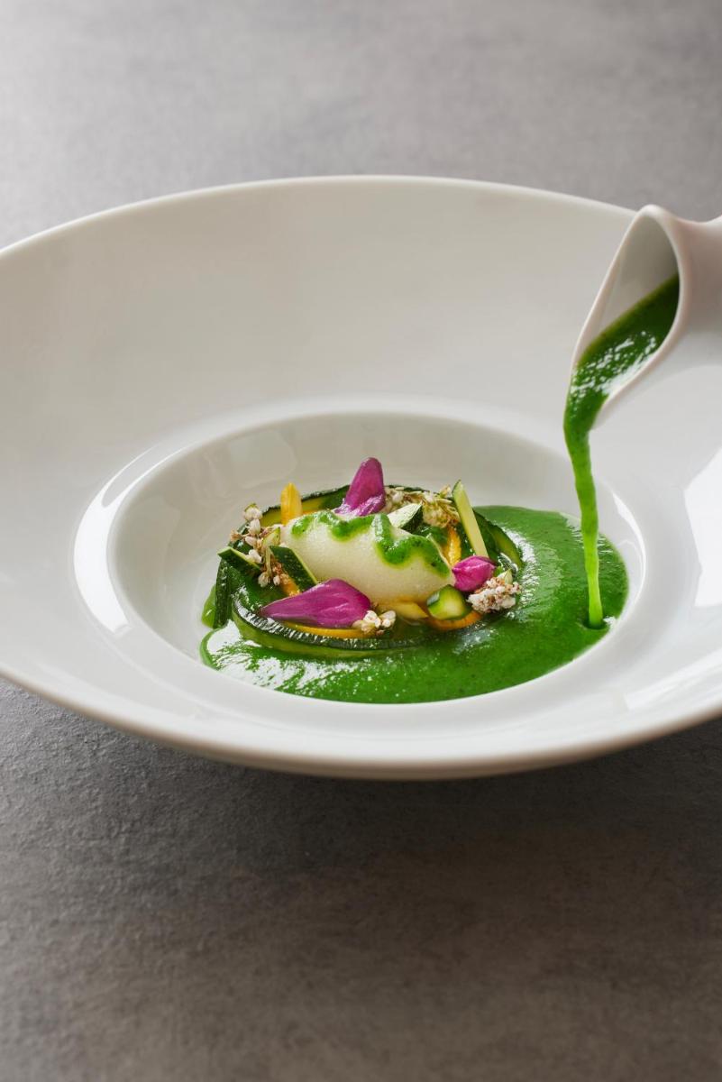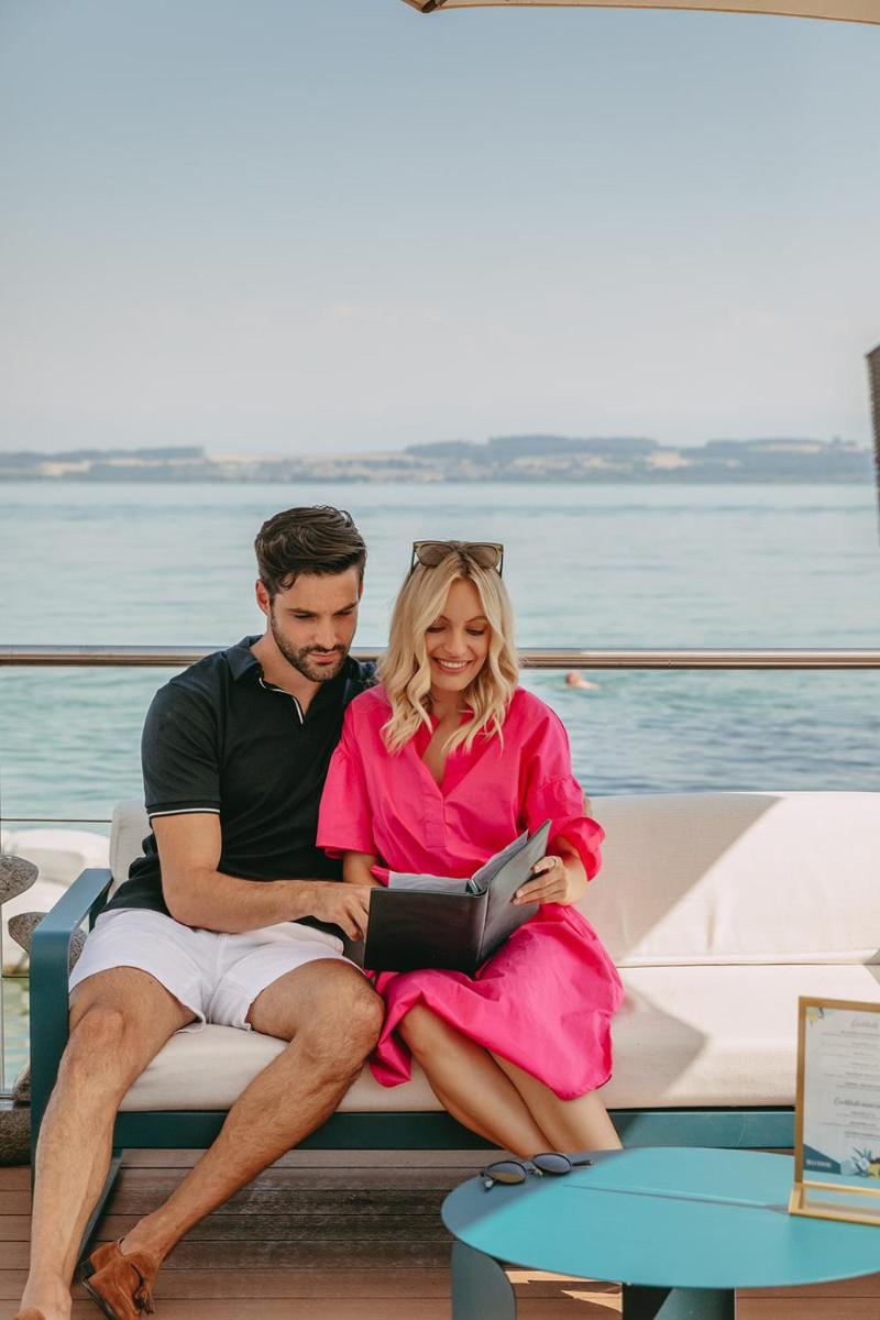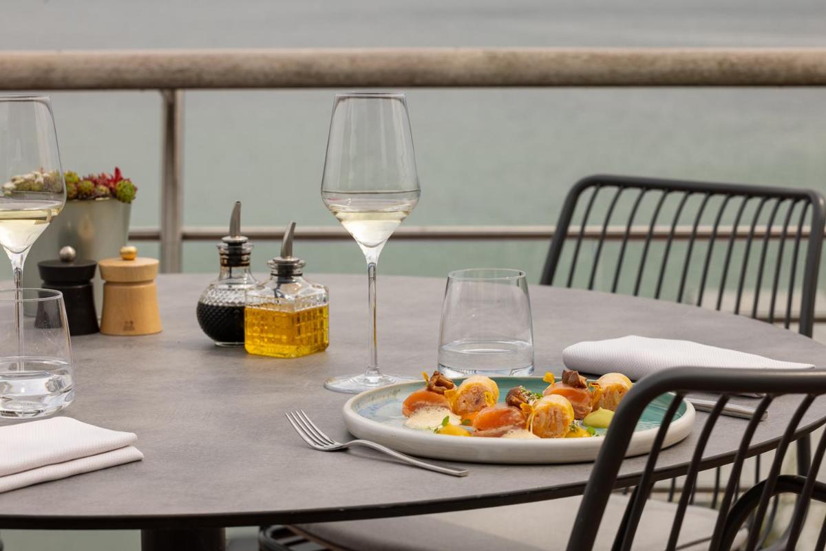 Il ristorante dell'hotel offre una cucina raffinata e creativa, con una forte enfasi sui prodotti freschi regionali e sul pesce di lago. La sala da pranzo, come l'intero complesso, è progettata per offrire una vista spettacolare sul Lago di Neuchâtel e sulle Alpi. Cenare qui è un'esperienza sensoriale unica e rilassante.
