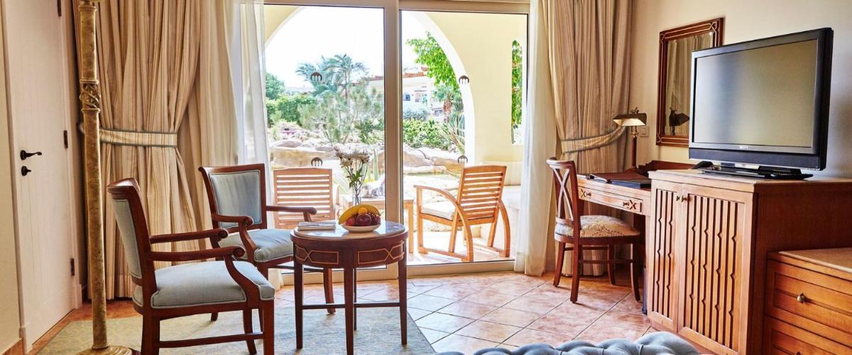 L'architettura del resort è grandiosa, con ampi cortili, specchi d'acqua e un'atmosfera opulenta. Le camere e le suite sono lussuosamente arredate, con balconi o terrazze private che offrono viste spettacolari sul Mar Rosso o sui rigogliosi giardini. Il comfort è garantito da servizi di alta gamma e un design curato.