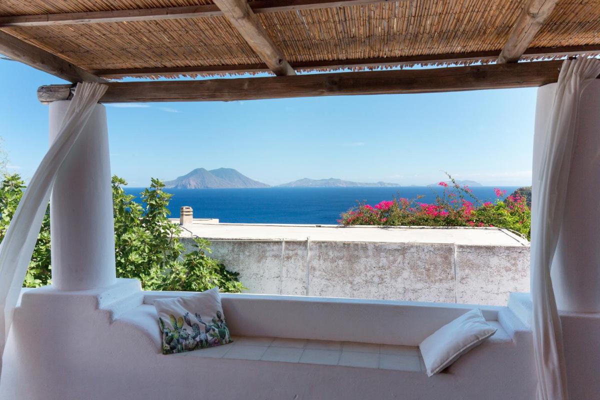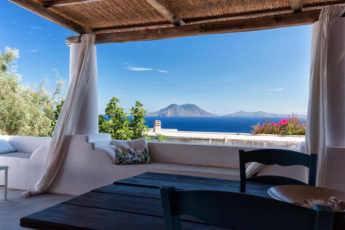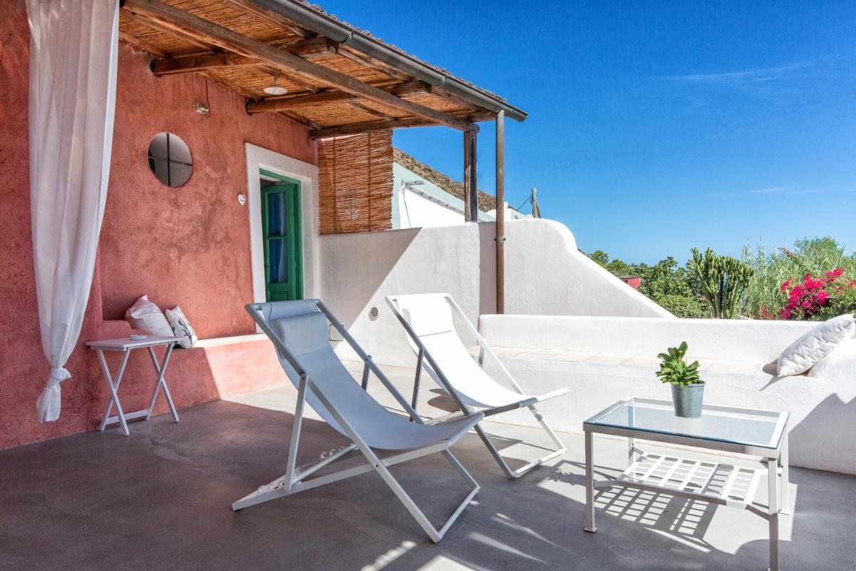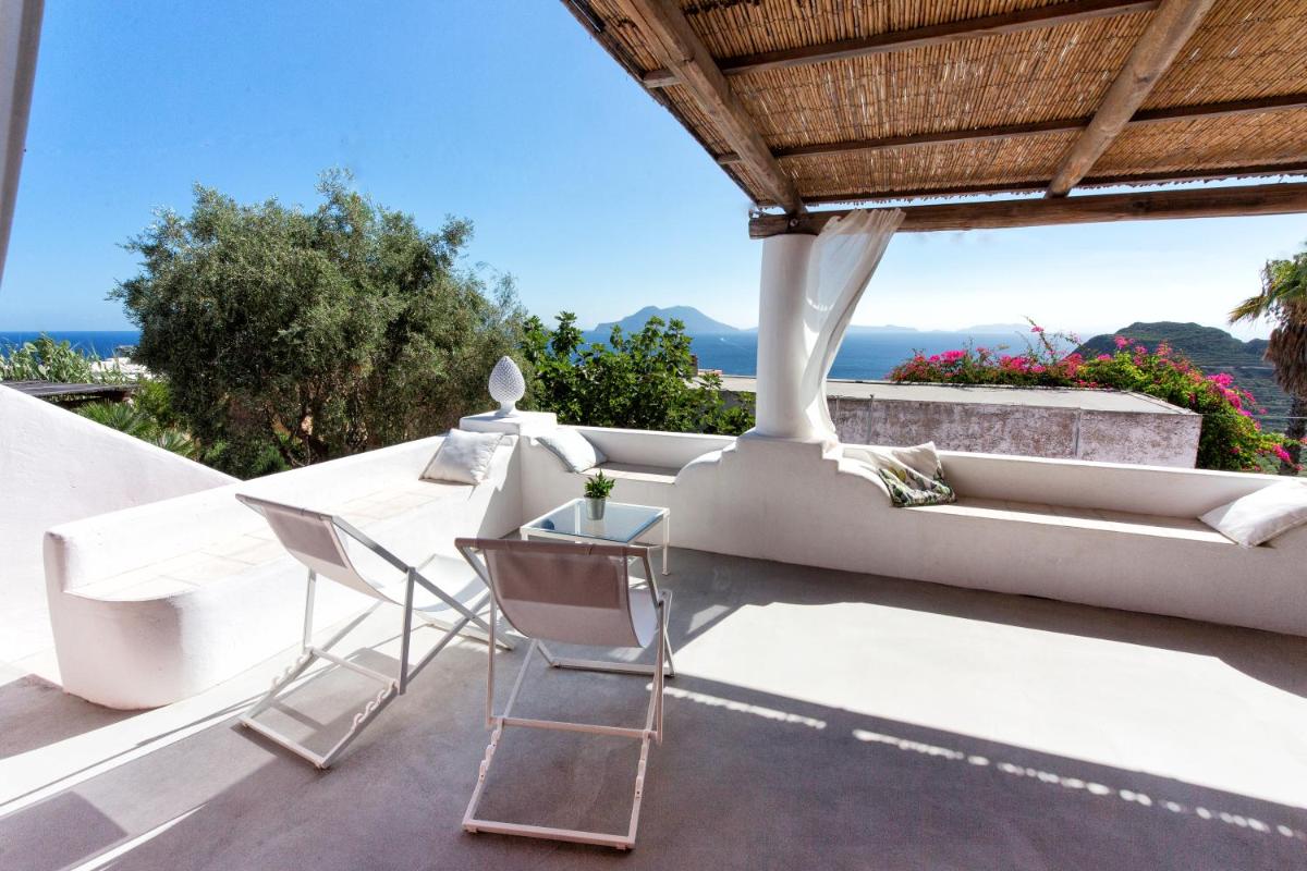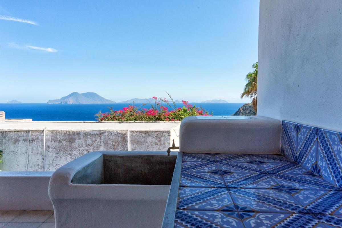 Un rigoglioso giardino e una terrazza comune invitano gli ospiti a godersi colazioni all’aperto, letture o momenti di contemplazione. La posizione elevata offre una vista mozzafiato su Filicudi Porto e l’orizzonte marino.