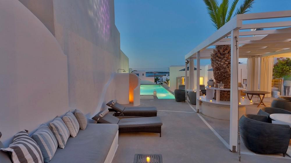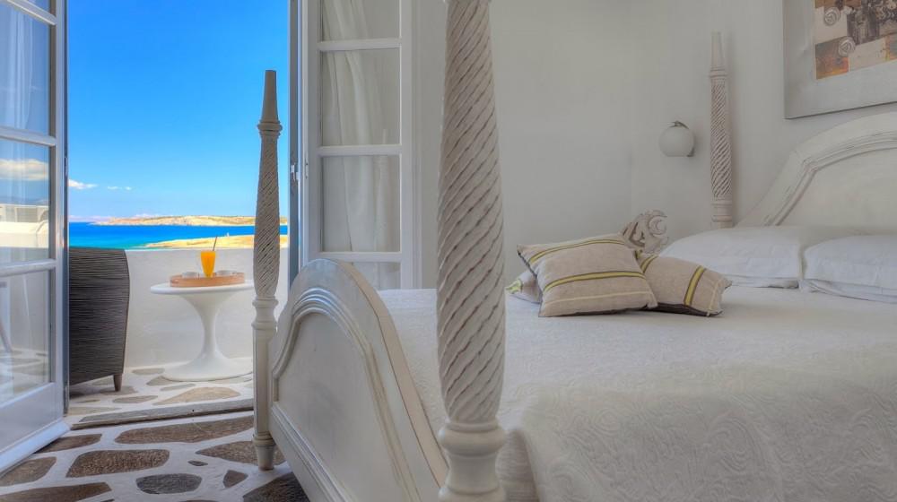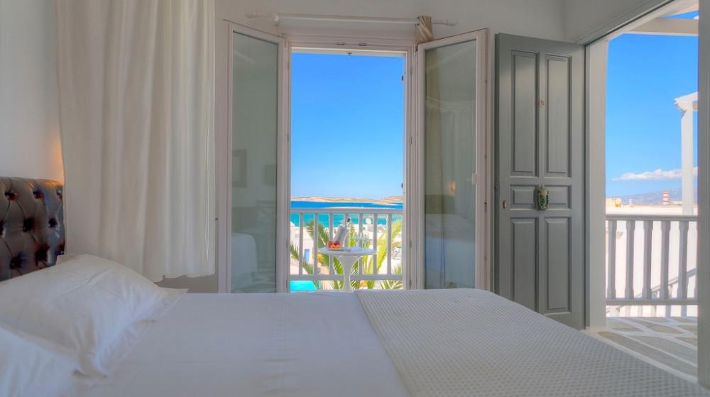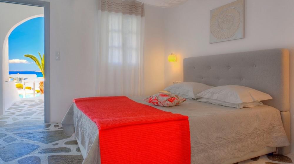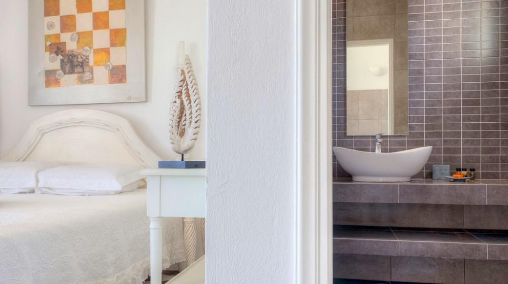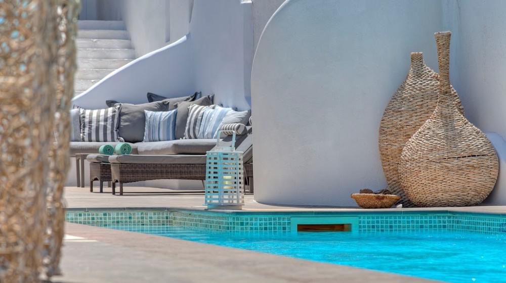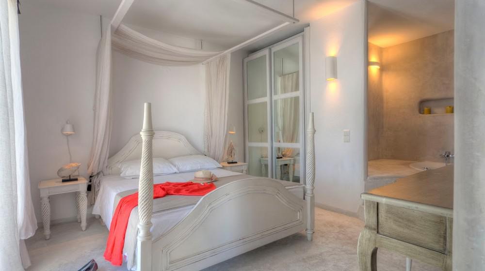 L'hotel si distingue per la sua offerta di sole suite, tutte progettate per massimizzare la vista sul mare. Le sistemazioni sono spaziose, luminose e arredate con uno stile che combina eleganza rustica e modernità. Molte suite includono vasche idromassaggio all'aperto o piccole piscine private, trasformando il balcone in un'oasi personale per godersi il tramonto sull'Egeo.