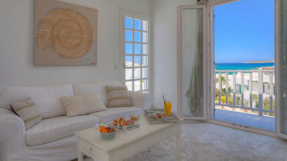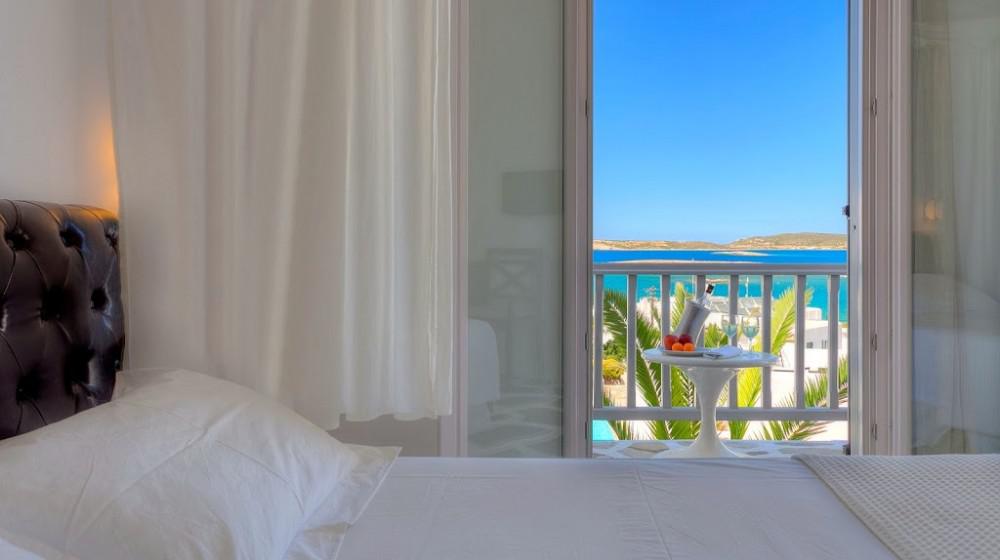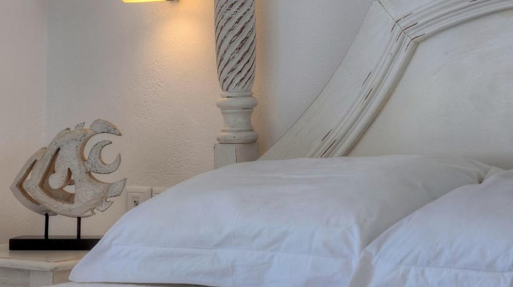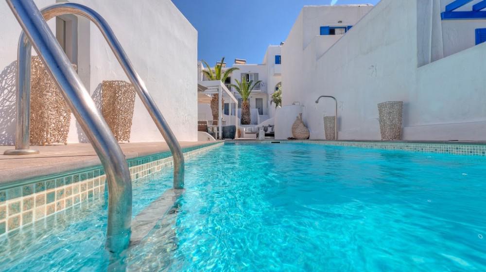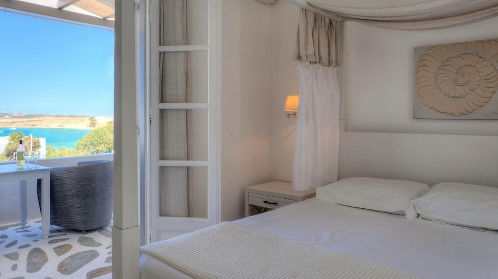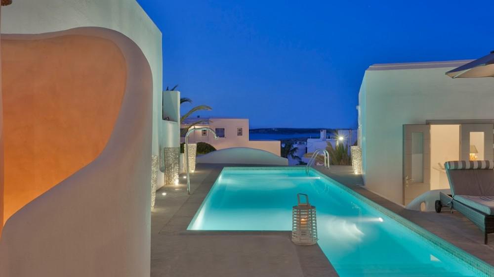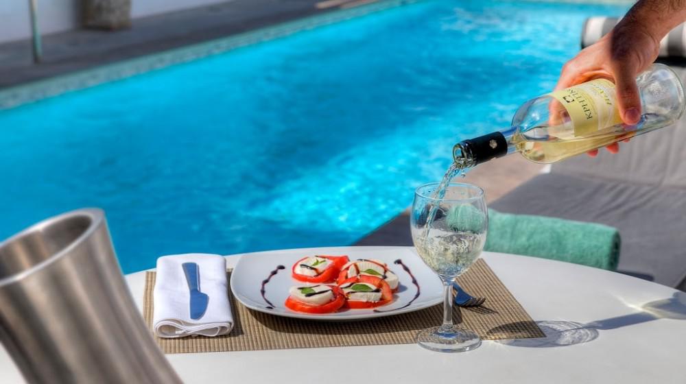 L'hotel si distingue per la sua offerta di sole suite, tutte progettate per massimizzare la vista sul mare. Le sistemazioni sono spaziose, luminose e arredate con uno stile che combina eleganza rustica e modernità. Molte suite includono vasche idromassaggio all'aperto o piccole piscine private, trasformando il balcone in un'oasi personale per godersi il tramonto sull'Egeo.