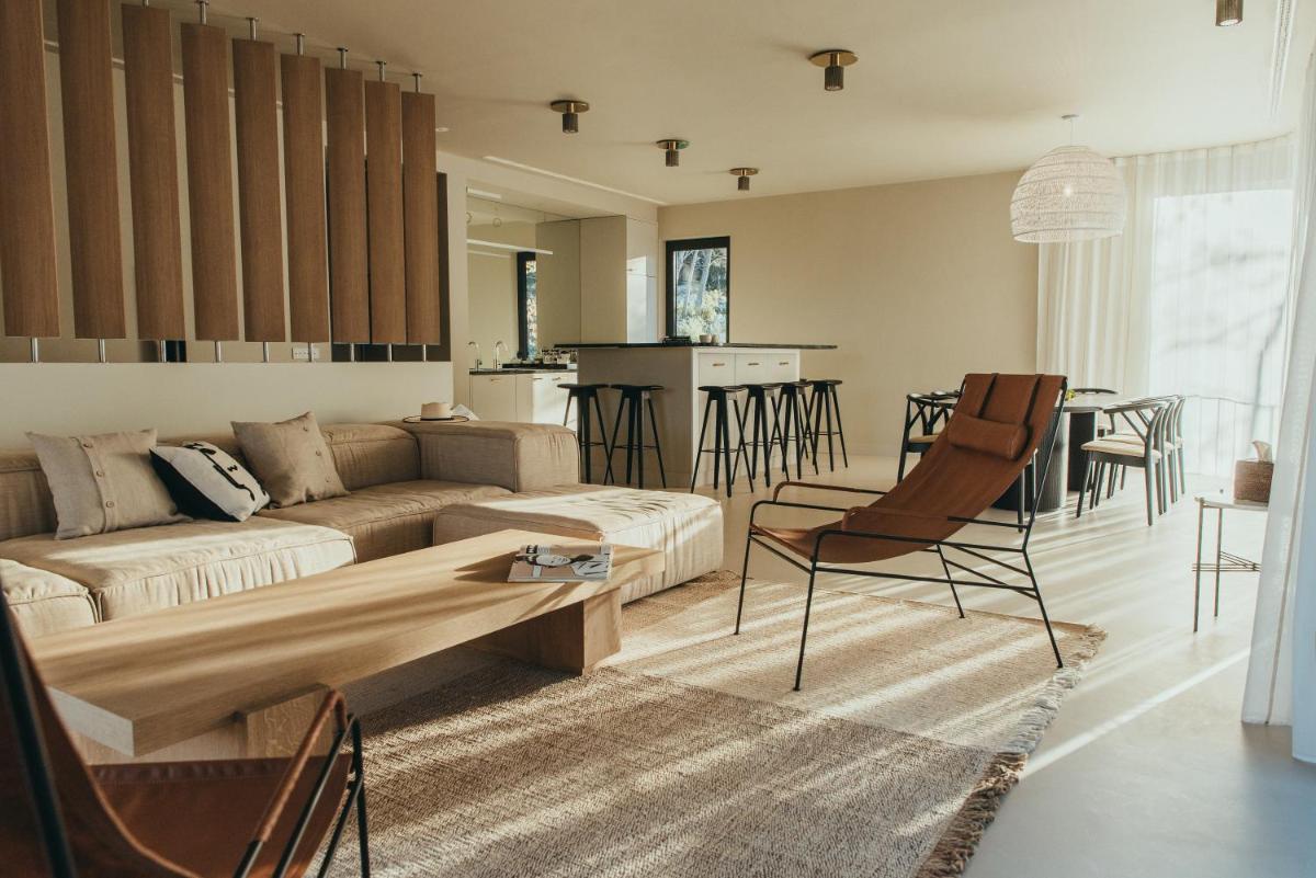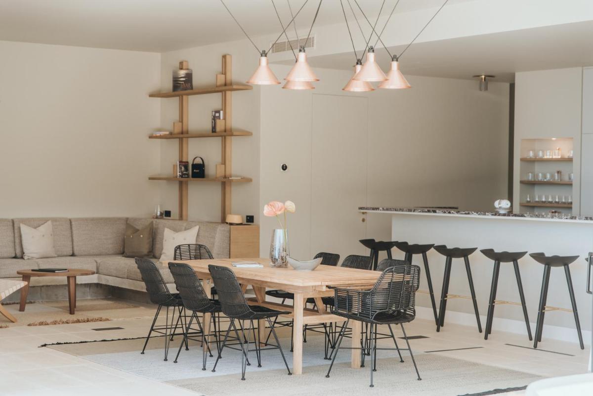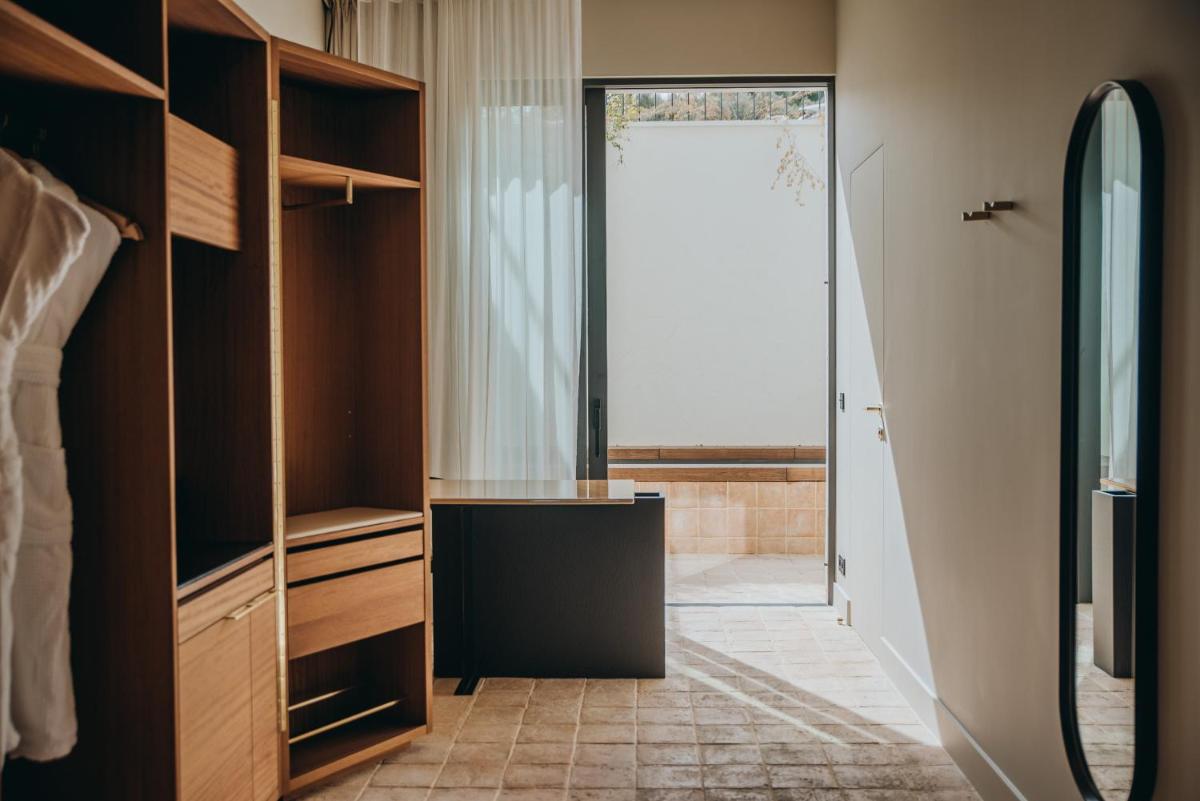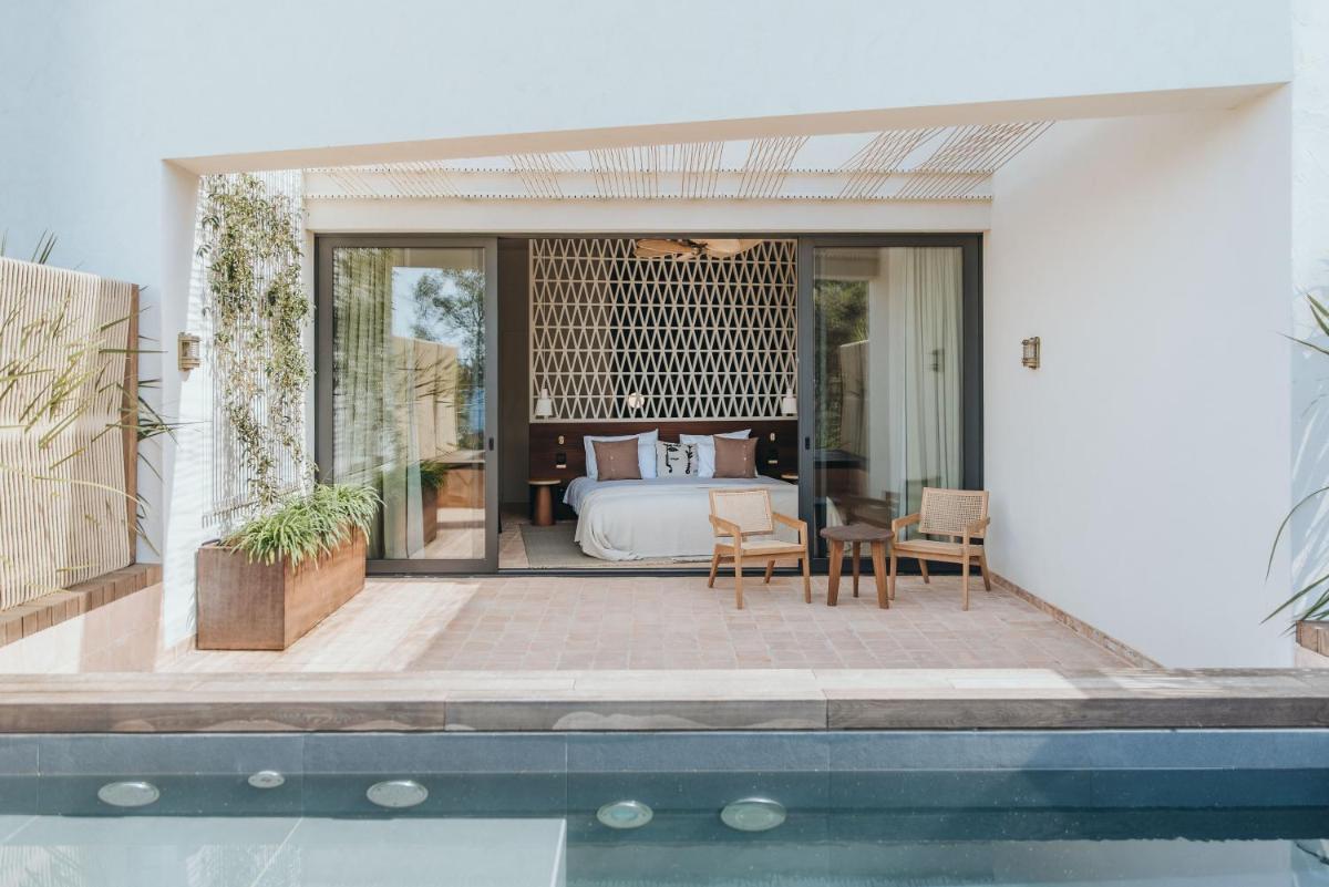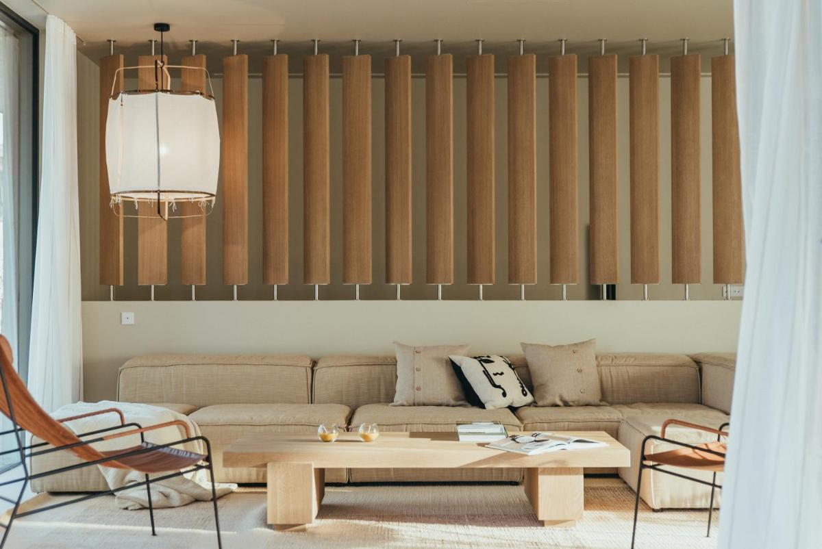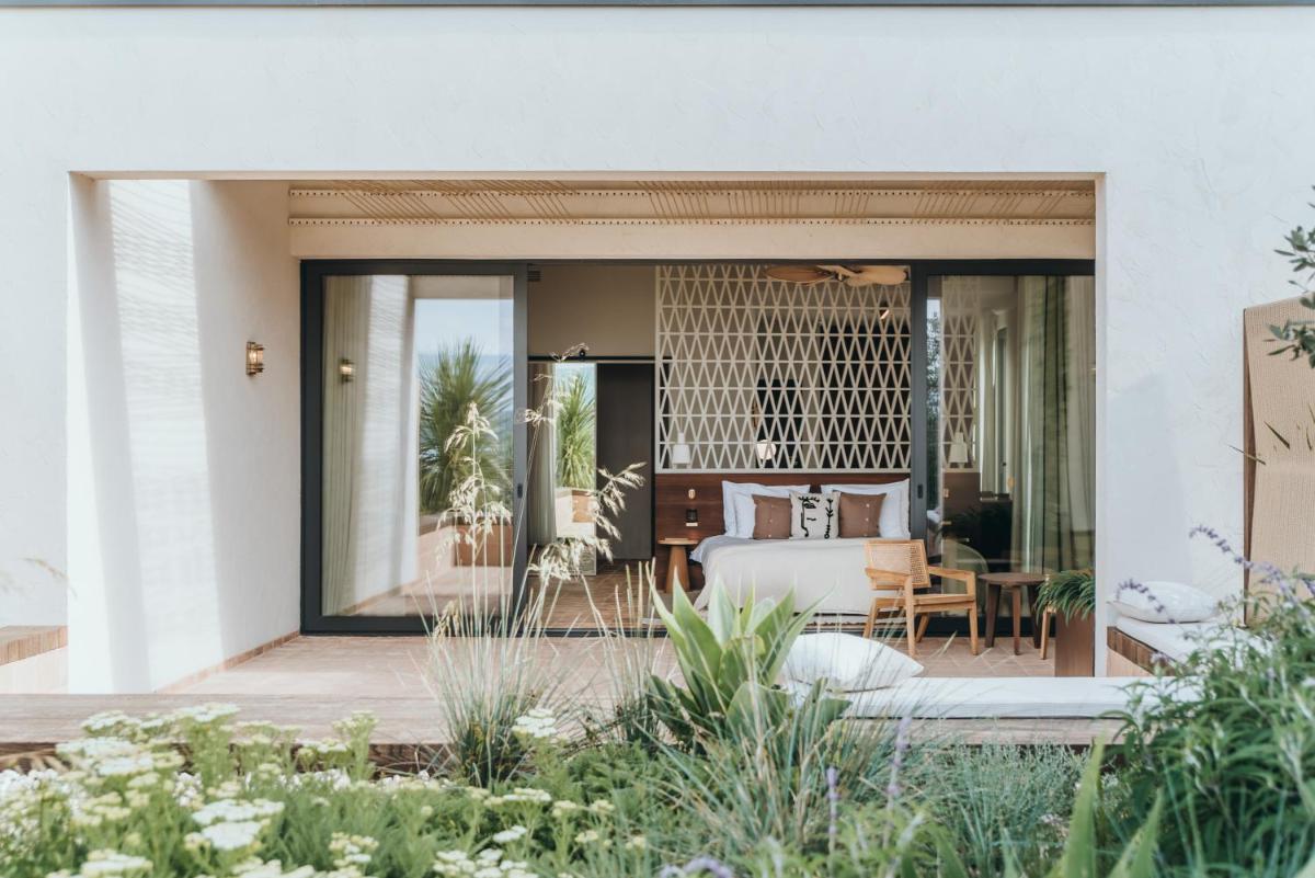 Il design è un capolavoro di architettura integrata, con camere, suite e ville che offrono tutte terrazze private con vista mare e lussuosi comfort. L'uso di pietra locale, legno di quercia e tonalità terrose crea un'atmosfera di calma e connessione con l'ambiente. Ogni dettaglio è curato per massimizzare la privacy e il relax, con un focus sul lusso discreto e l'estetica minimalista.