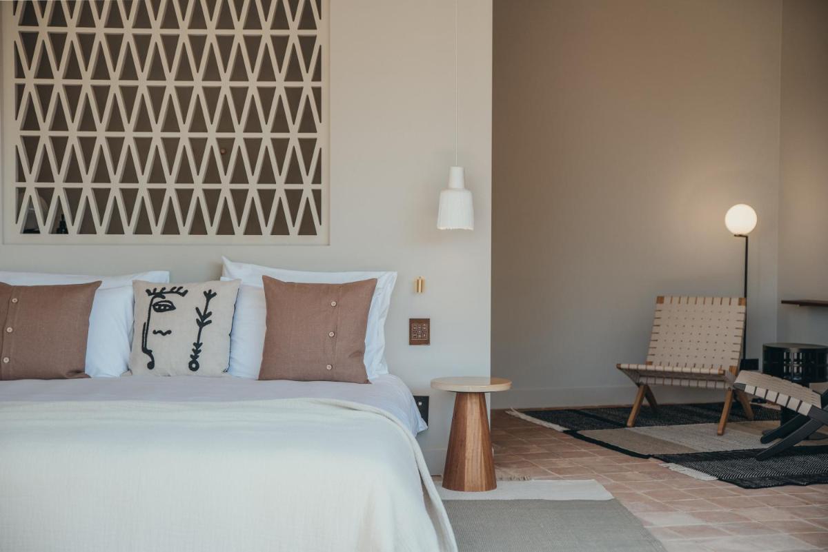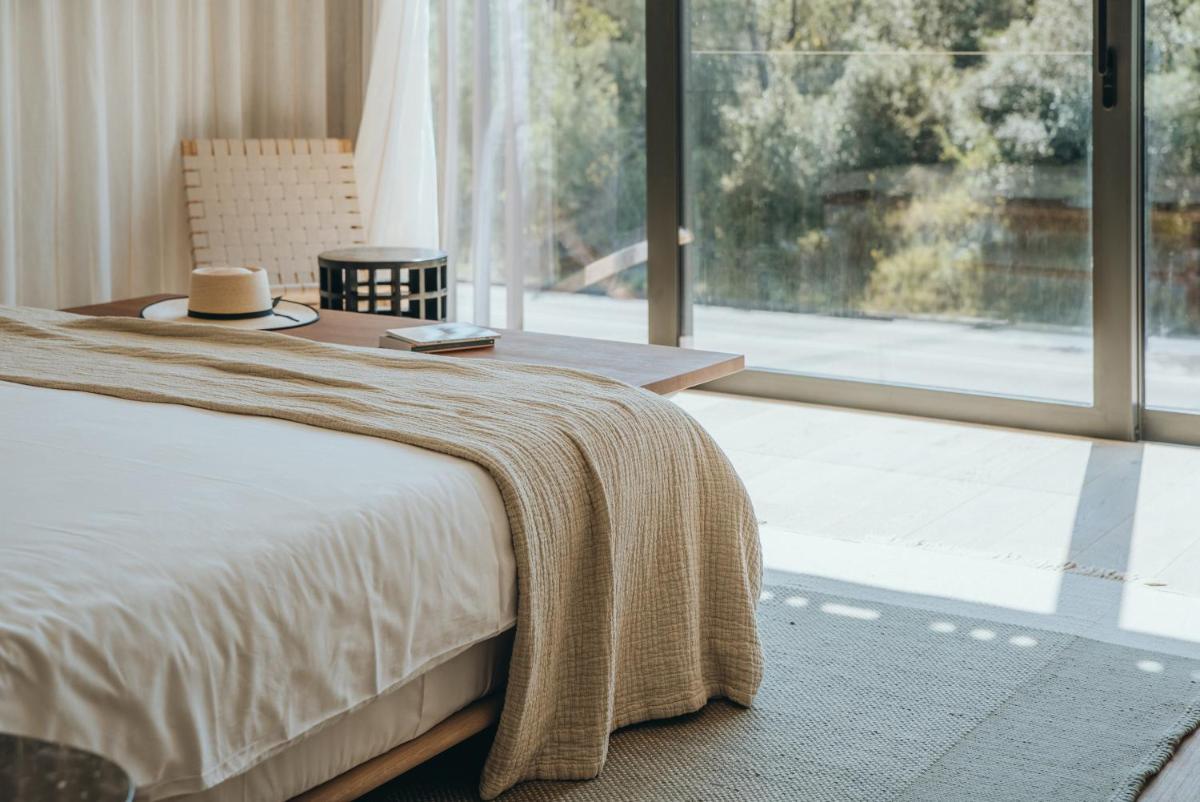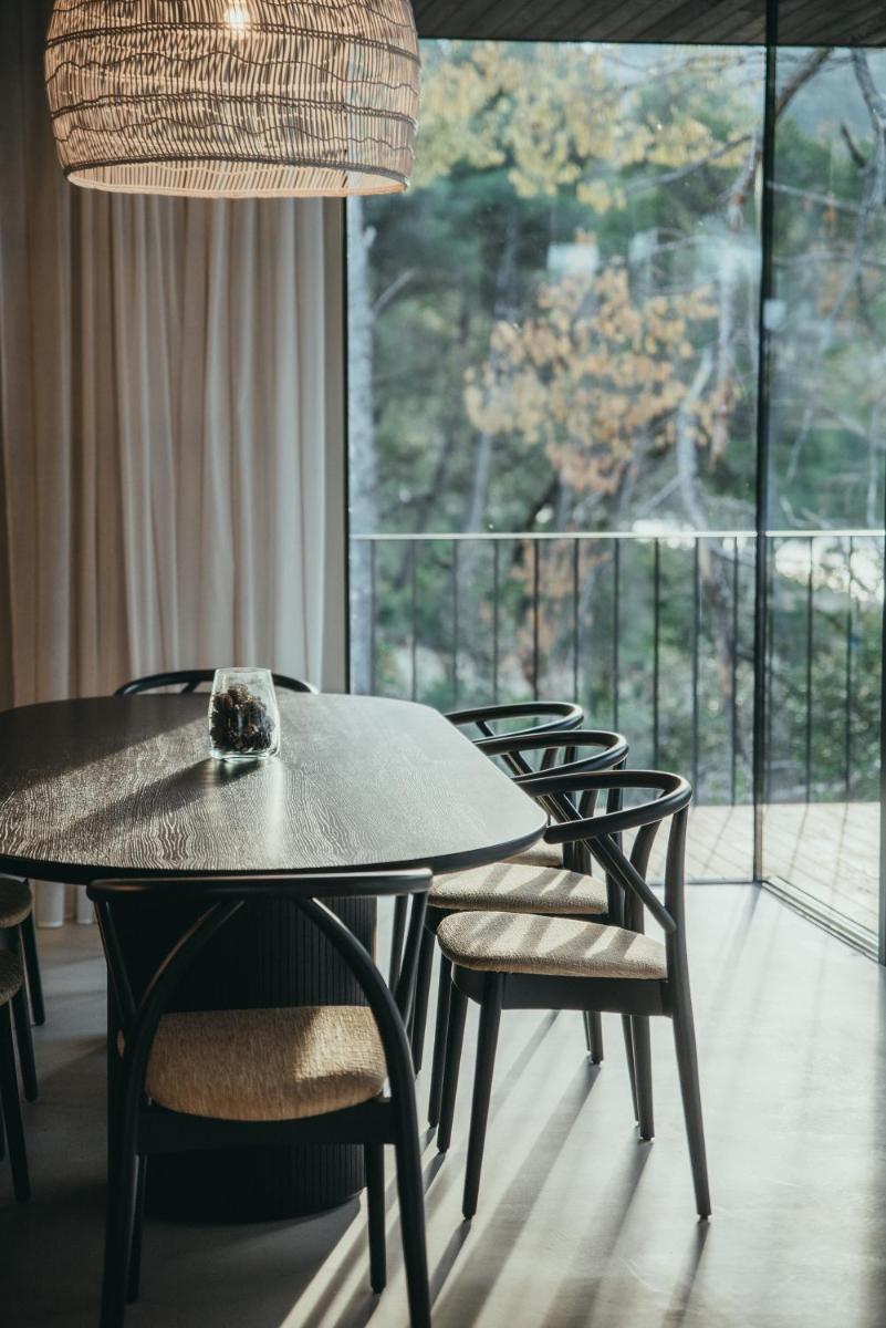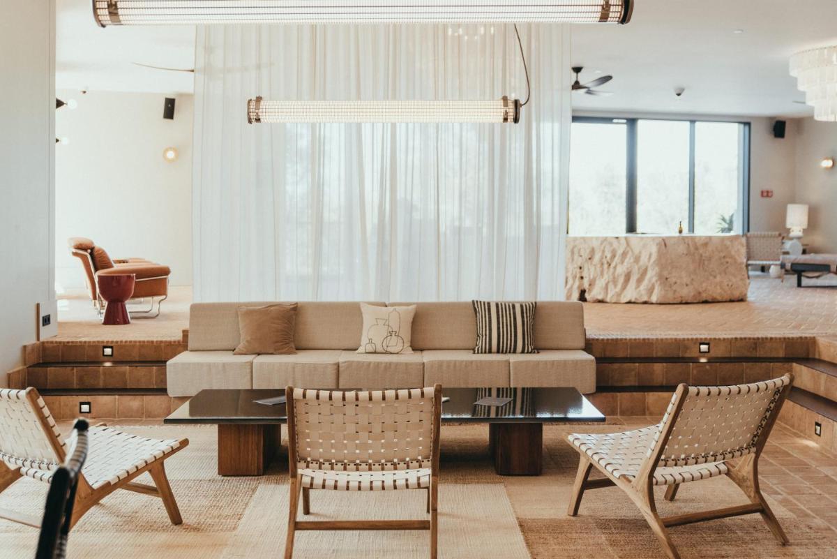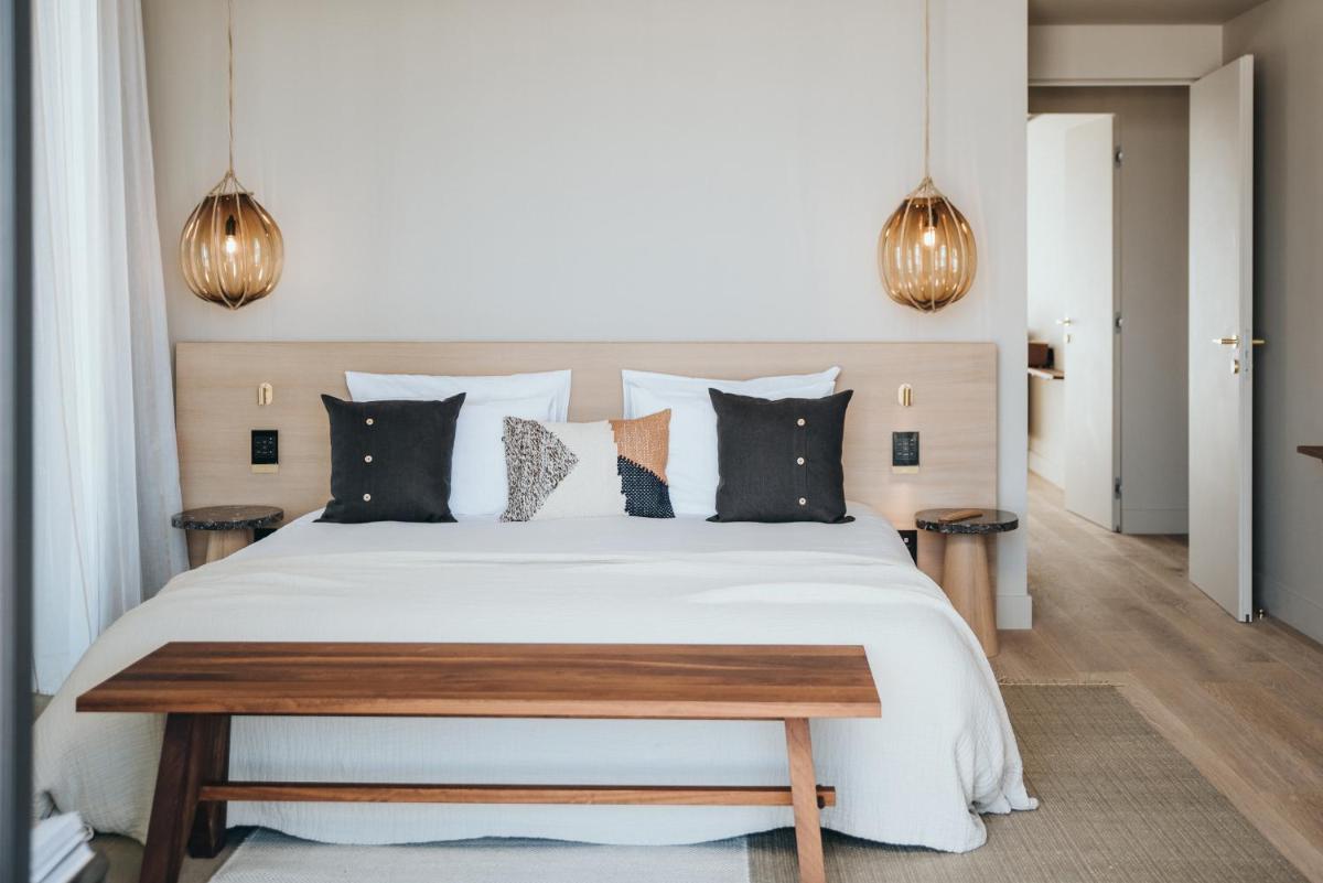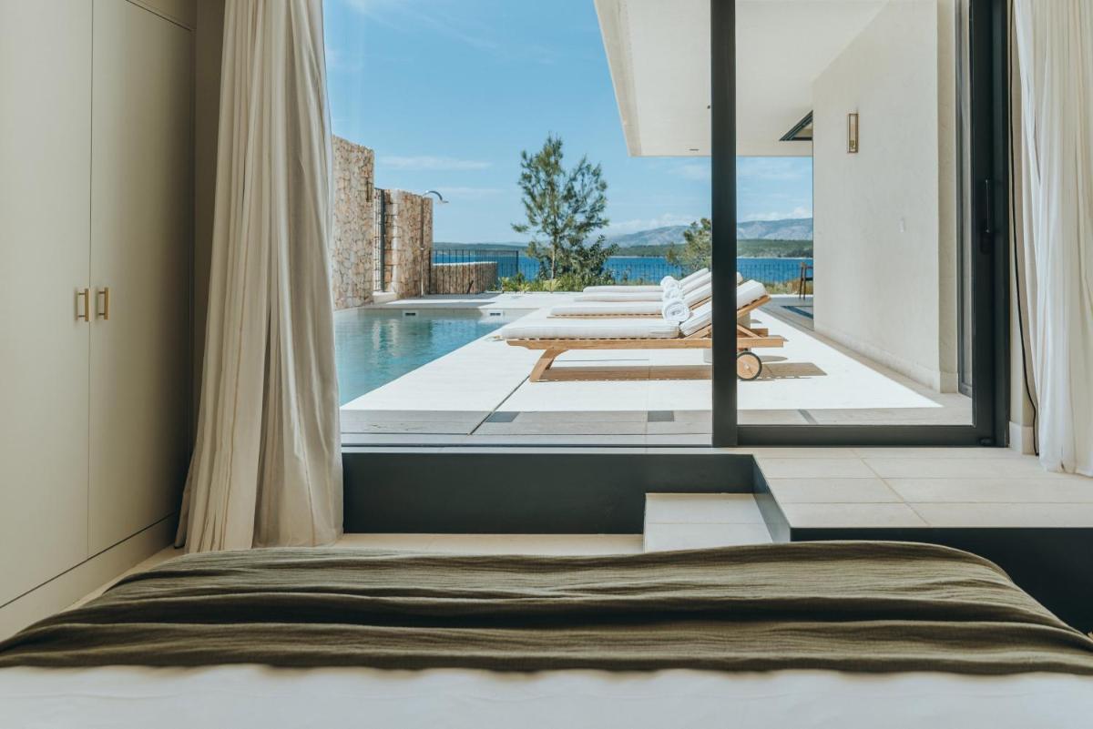 Il design è un capolavoro di architettura integrata, con camere, suite e ville che offrono tutte terrazze private con vista mare e lussuosi comfort. L'uso di pietra locale, legno di quercia e tonalità terrose crea un'atmosfera di calma e connessione con l'ambiente. Ogni dettaglio è curato per massimizzare la privacy e il relax, con un focus sul lusso discreto e l'estetica minimalista.