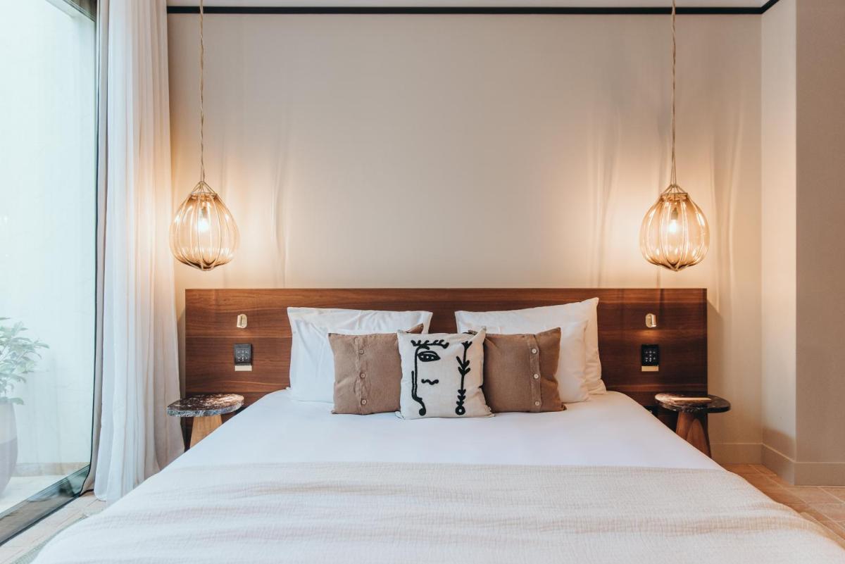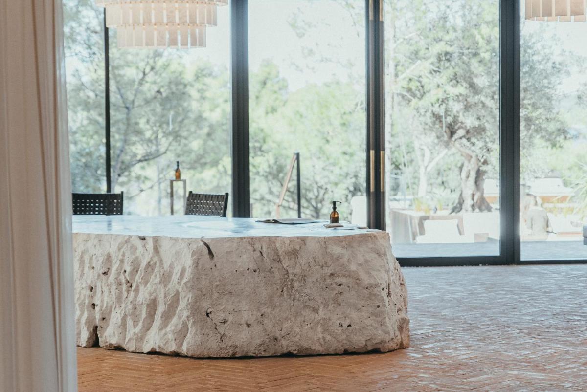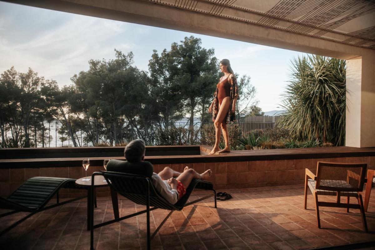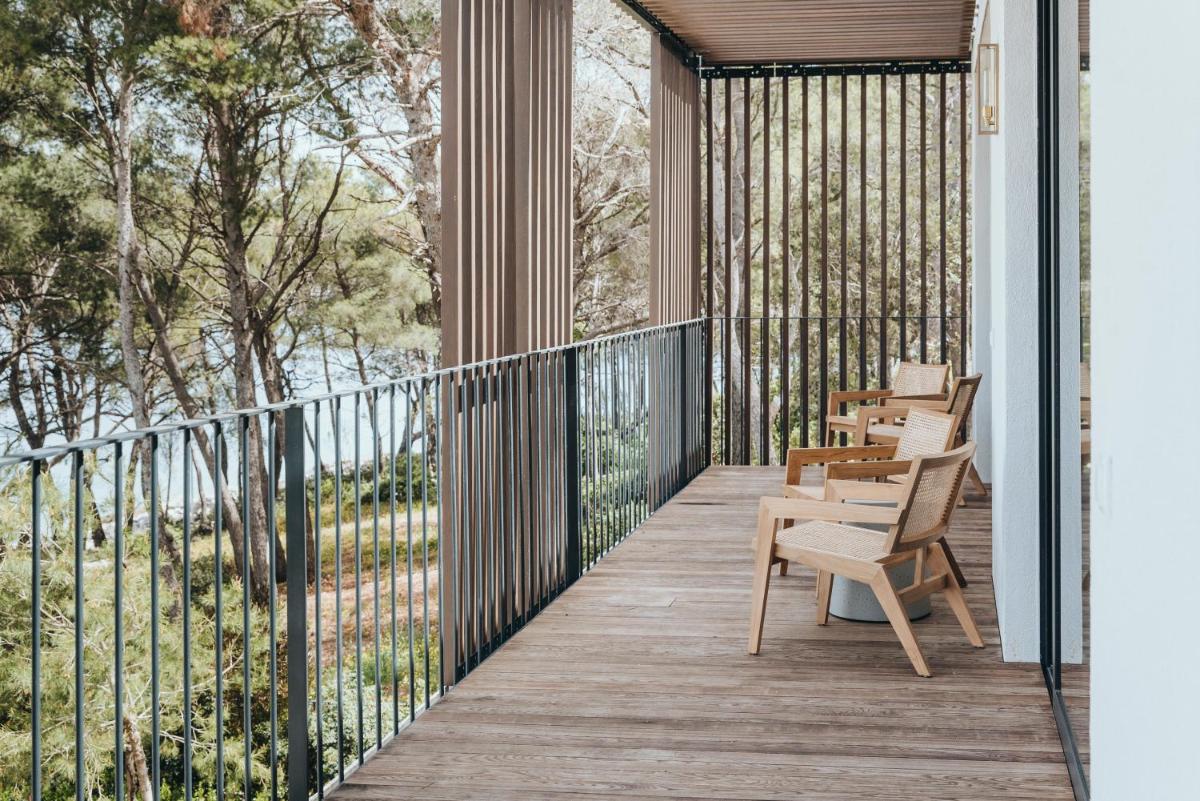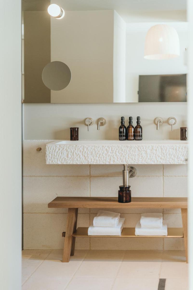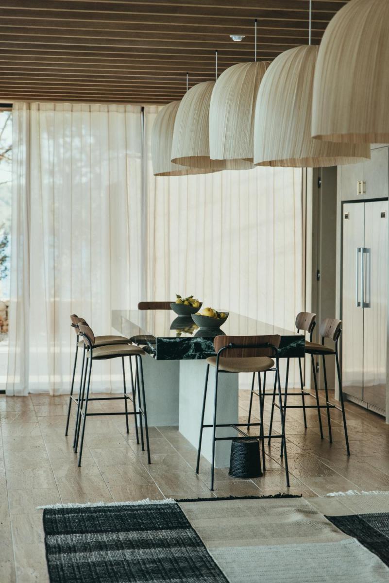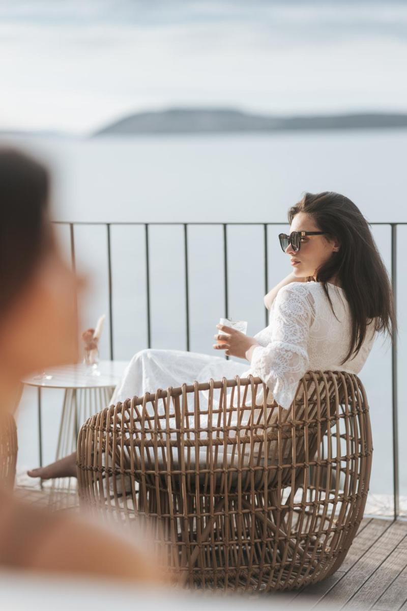 Il design è un capolavoro di architettura integrata, con camere, suite e ville che offrono tutte terrazze private con vista mare e lussuosi comfort. L'uso di pietra locale, legno di quercia e tonalità terrose crea un'atmosfera di calma e connessione con l'ambiente. Ogni dettaglio è curato per massimizzare la privacy e il relax, con un focus sul lusso discreto e l'estetica minimalista.