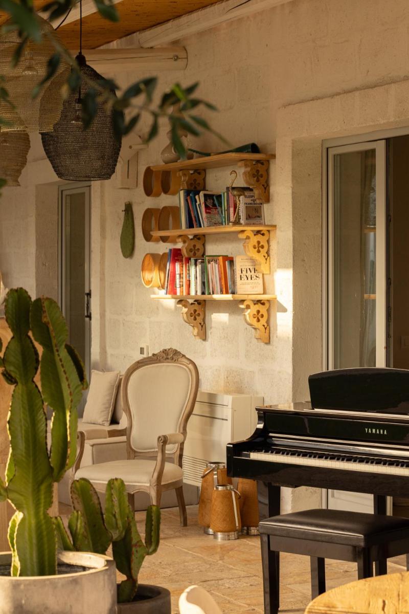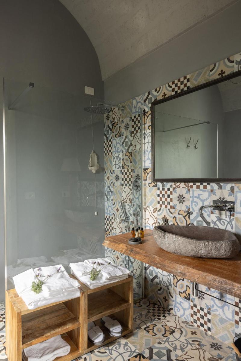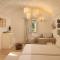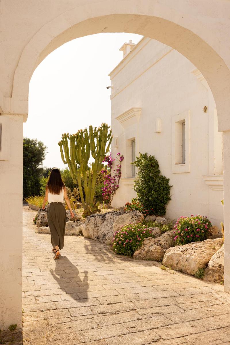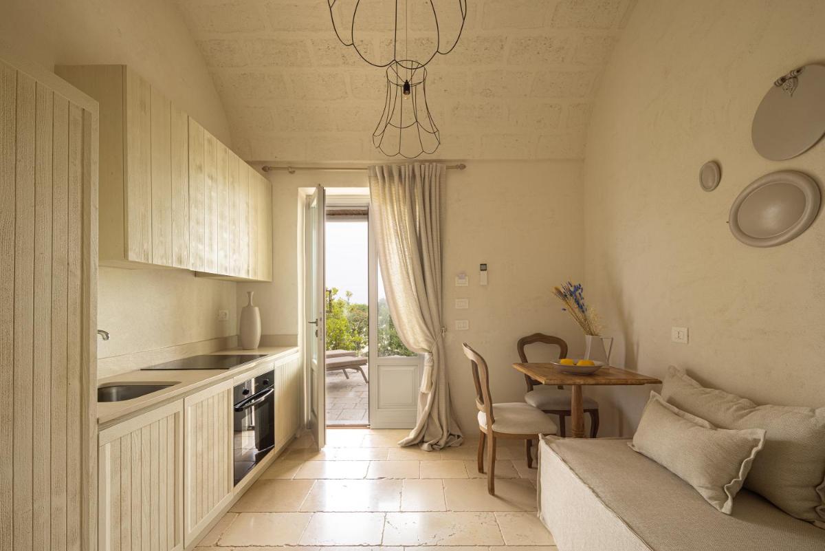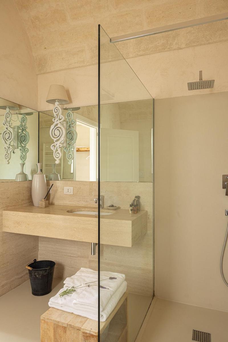 Le camere e le suite, ricavate dalle antiche strutture della masseria, mantengono il fascino rustico originale con volte in pietra, pavimenti in chianca e arredi che combinano mobili d'epoca con elementi moderni. Tutte le sistemazioni sono dotate di aria condizionata, minibar, TV satellitare e un bagno privato ben curato. Le suite più ampie includono una zona giorno separata, garantendo un soggiorno di massima privacy.
