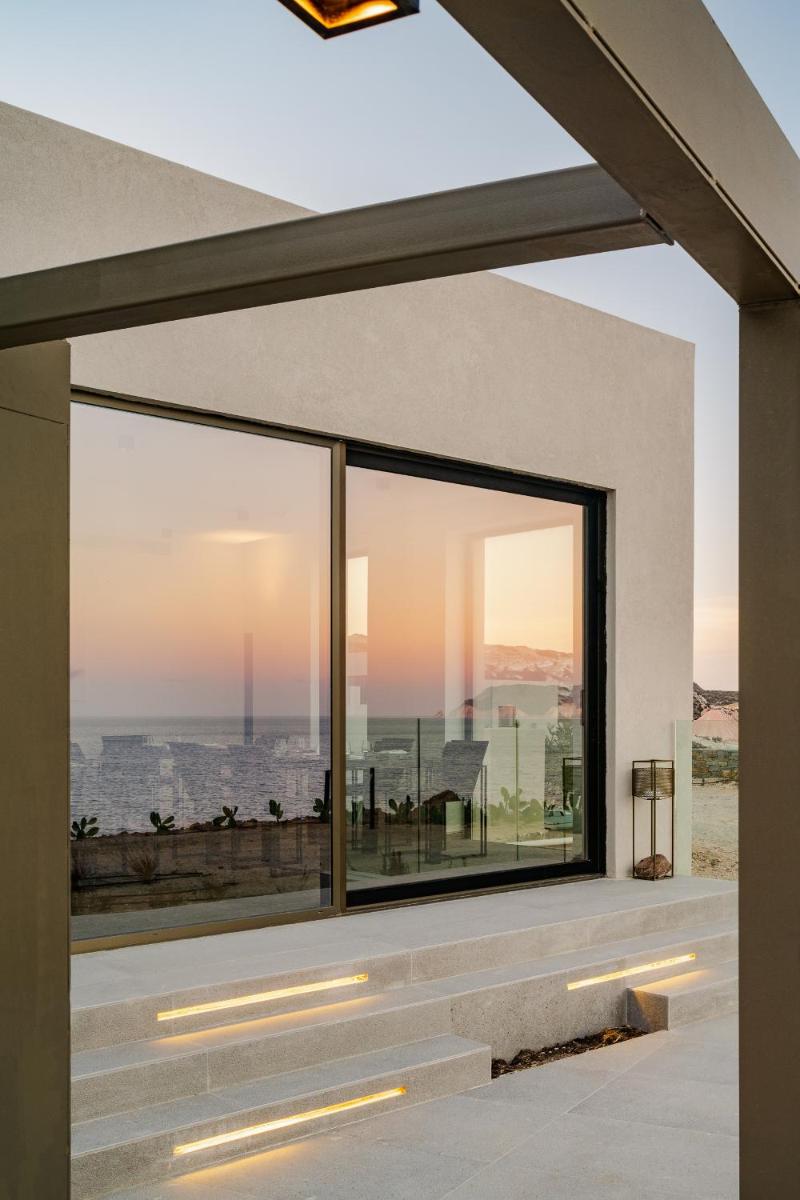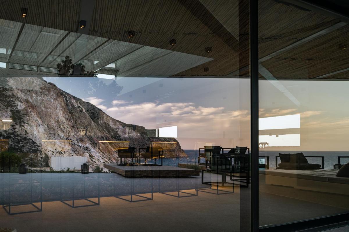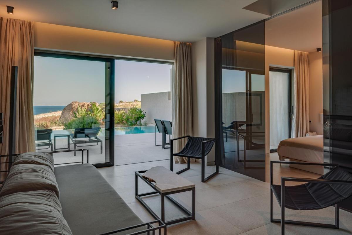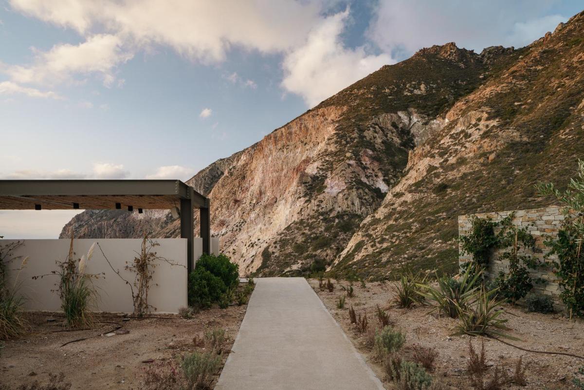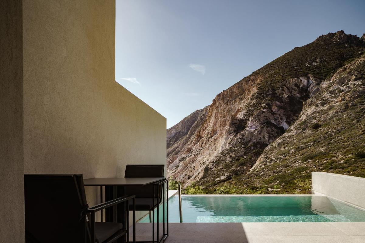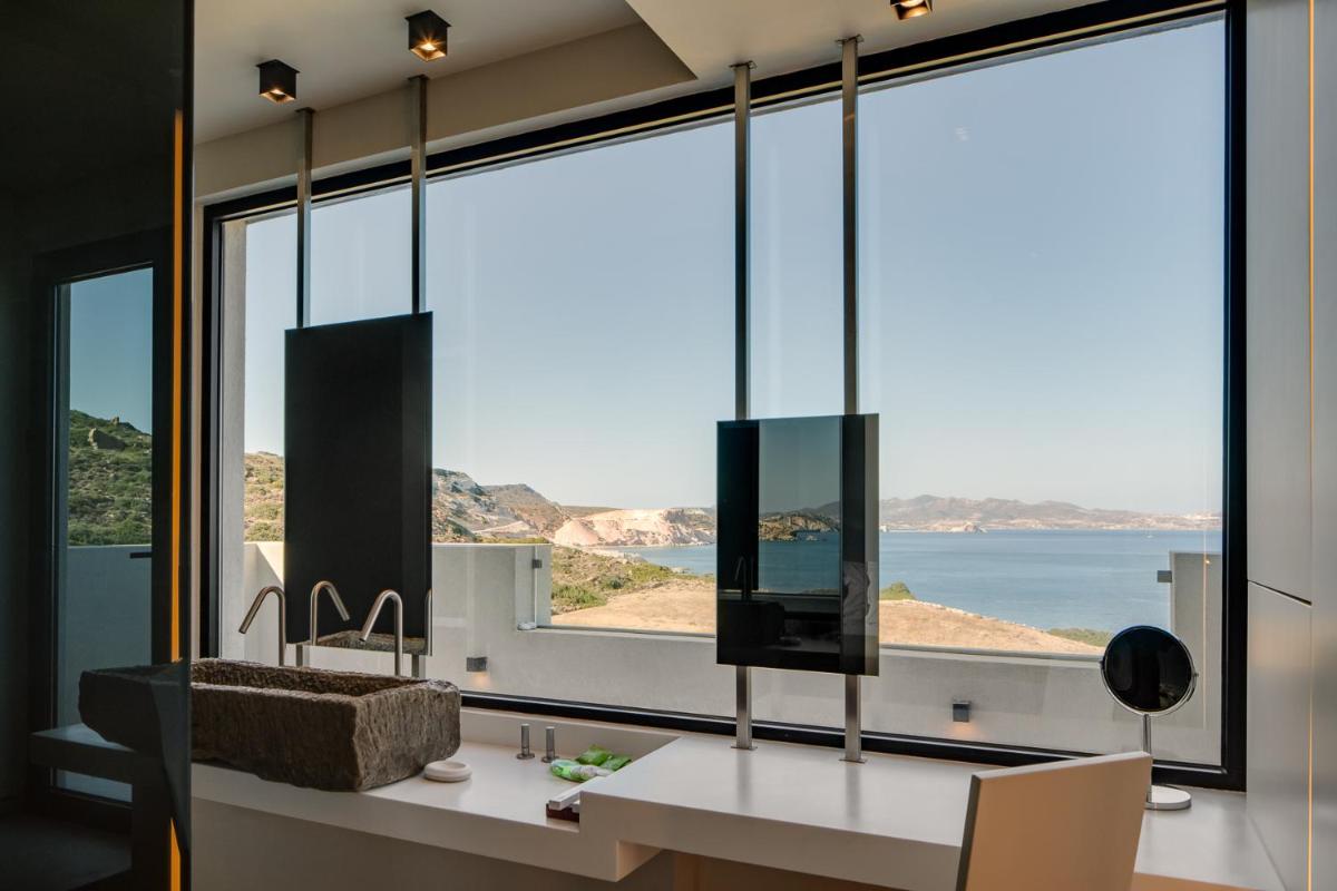 L'architettura del resort è ispirata alla roccia vulcanica di Milos, con suite e ville lussuose che si fondono con il paesaggio. Molte unità abitative vantano piscine private a sfioro e ampie terrazze, offrendo una vista ineguagliabile sul Mar Egeo. Gli interni sono minimalisti ma caldi, con materiali naturali che esaltano la bellezza dell'ambiente.