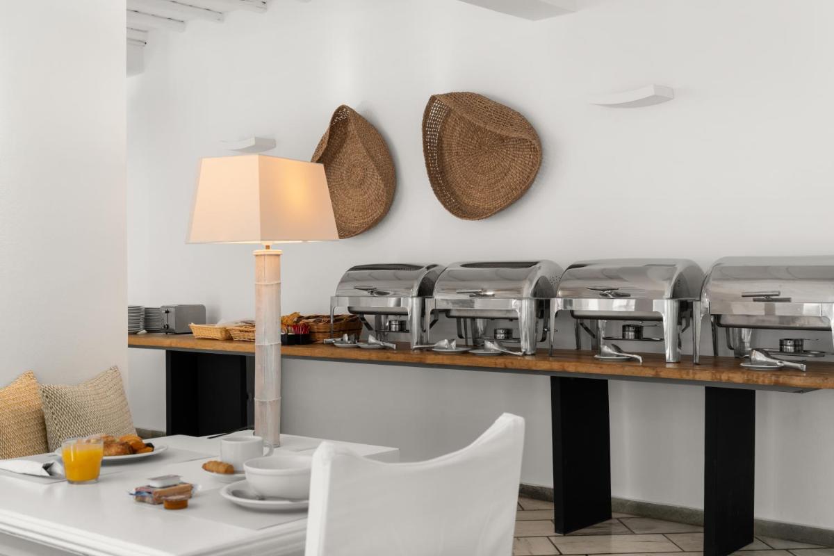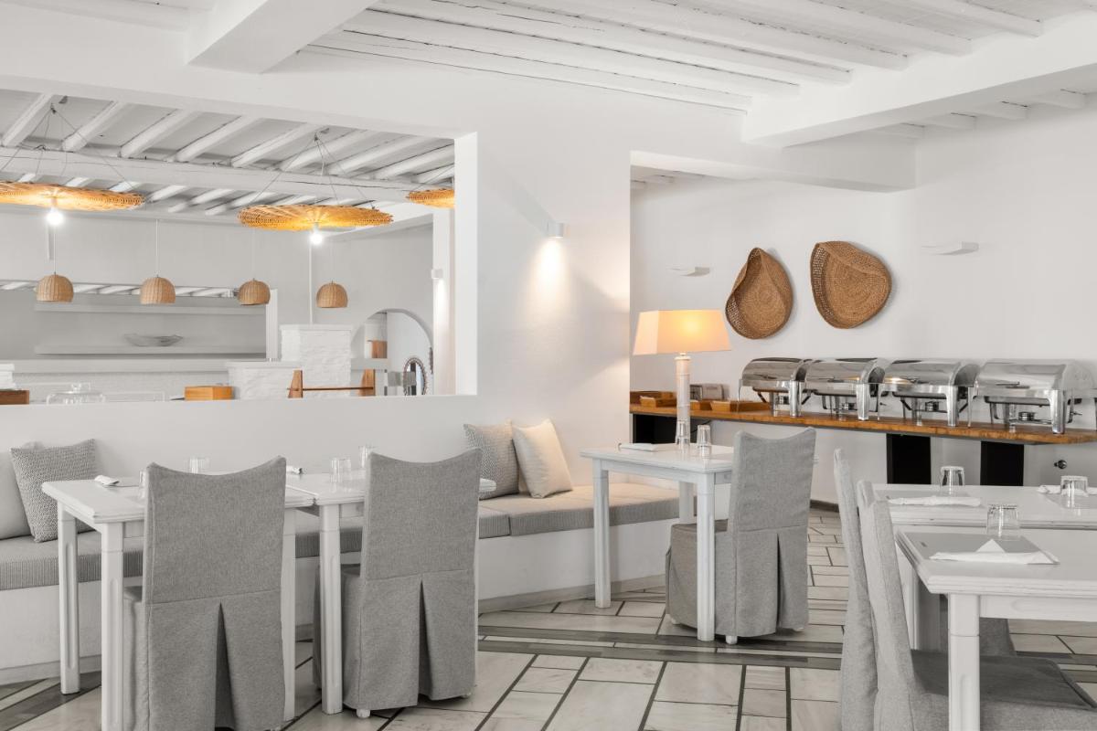 La proposta culinaria è focalizzata sulla cucina greca con enfasi sui sapori locali di Tinos, un'isola rinomata per la sua tradizione gastronomica. Il ristorante offre un'atmosfera intima ed elegante, dove gli ospiti possono gustare piatti freschi e autentici, spesso preparati con prodotti provenienti direttamente dall'isola. La colazione è un momento culminante, ricca di specialità fatte in casa.