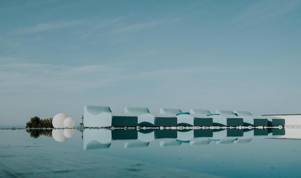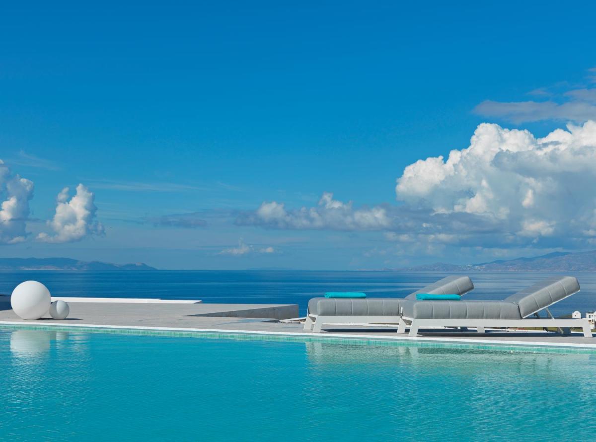 Il design si distingue per un'estetica pulita, dove il bianco brillante si fonde con dettagli in pietra e legno naturale. Le suites, tutte di generose dimensioni, sono vere e proprie oasi di pace, molte delle quali includono una piscina privata riscaldata o una jacuzzi esterna, permettendo agli ospiti di godere del panorama in totale privacy.