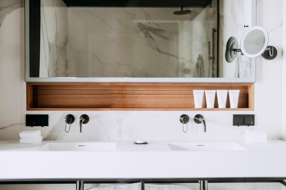 un doppio lavabo, una doccia con getto a pioggia e lussuosi cosmetici Natura Bisse. La suite offre la possibilità di