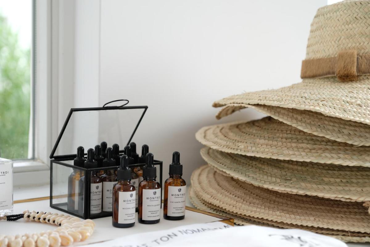 Le suite sono arredate con un gusto impeccabile, caratterizzato da linee pulite, colori neutri e materiali naturali di alta qualità. Molte offrono spazi esterni privati, come balconi o terrazze, ideali per godersi la vista. L'attenzione al dettaglio nel design assicura un'atmosfera di calma e sofisticatezza, tipica degli hotel di alto livello a Mykonos.