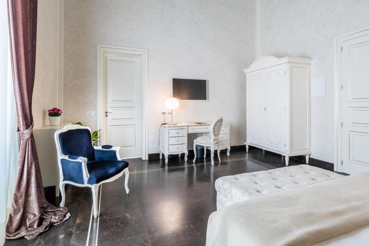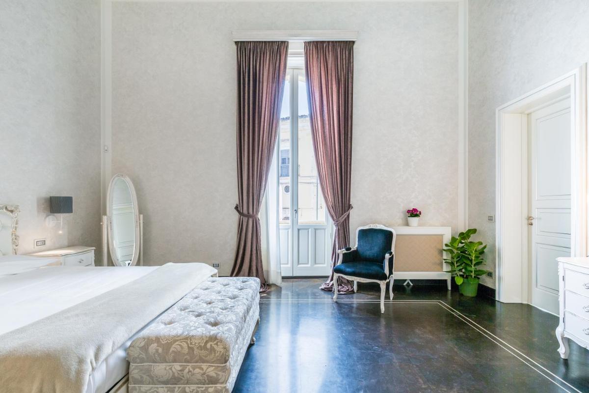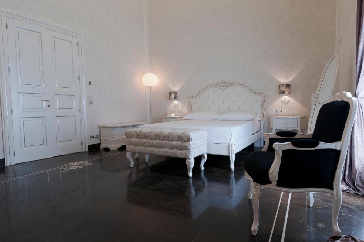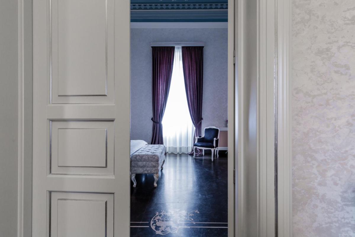 Gli interni sono un inno al Barocco siciliano, con volte affrescate, ampi saloni e balconi in ferro battuto che si affacciano sulla maestosità delle vie di Scicli. Ogni suite o camera conserva intatto il fascino storico, combinandolo sapientemente con servizi moderni e di alto livello. I dettagli architettonici, come le grandi porte in legno e le scalinate monumentali, raccontano secoli di storia e cultura.