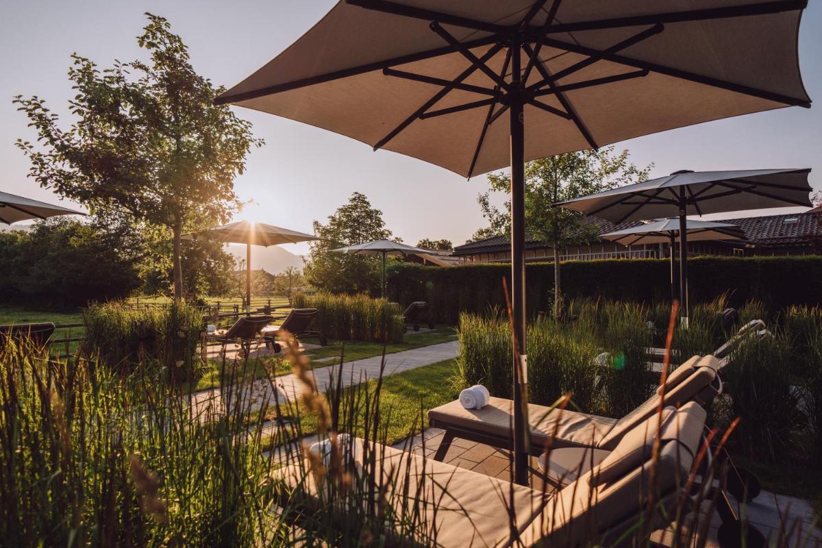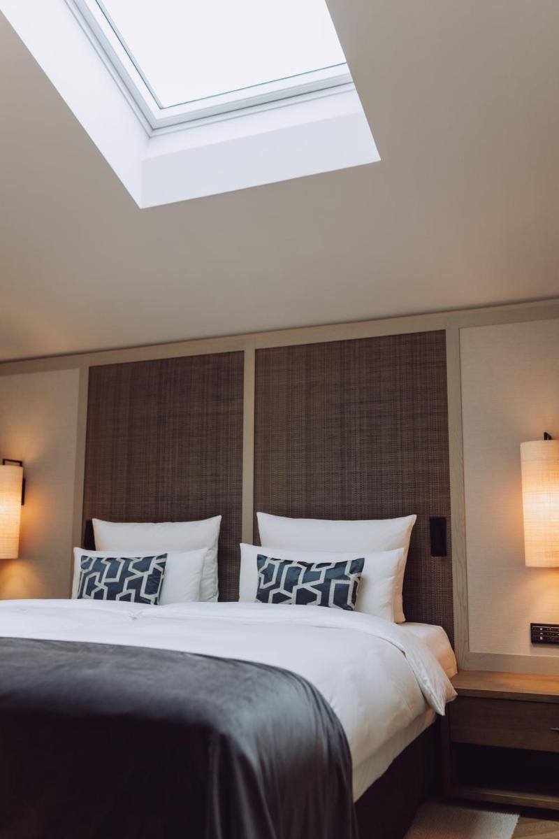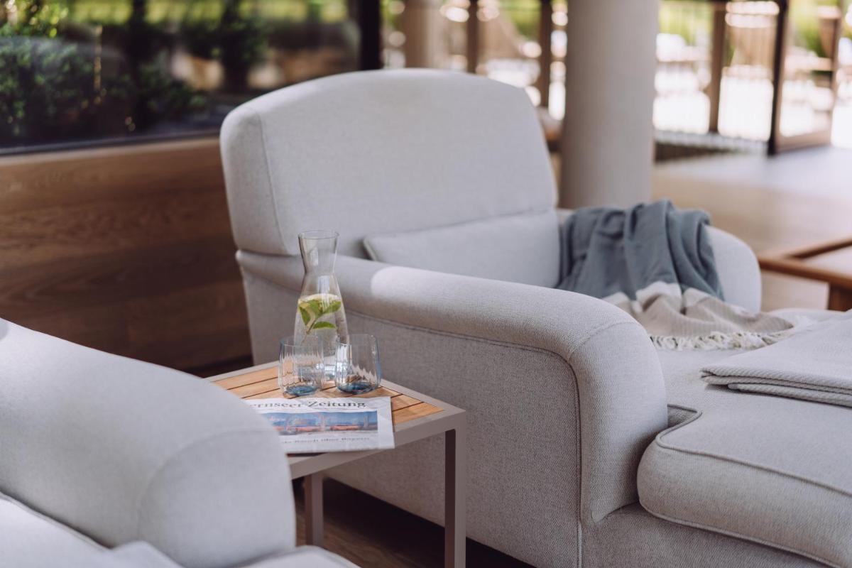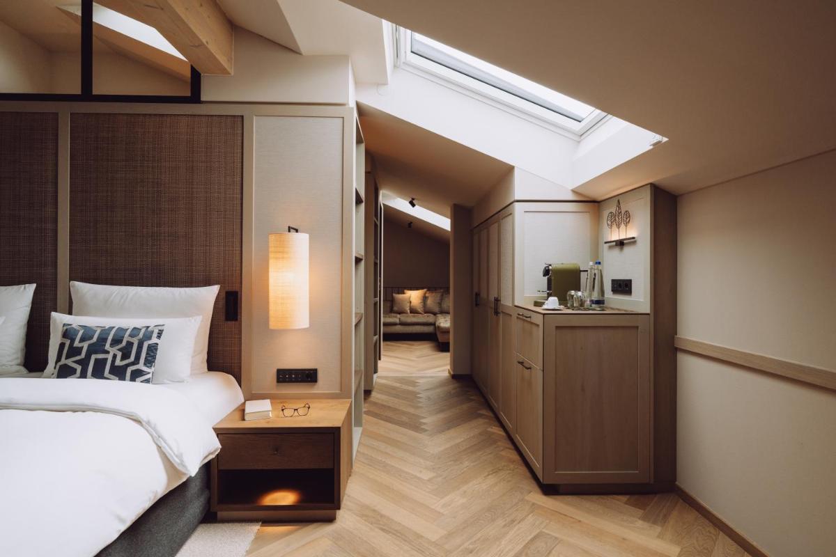 L'hotel si presenta con un'architettura che evoca le tradizionali fattorie bavaresi (Höfe), sapientemente rinnovata con un design interno sofisticato e contemporaneo. Le camere e le suite sono caratterizzate da materiali naturali di alta qualità, come legno di quercia e tessuti pregiati, offrendo un'atmosfera di caldo lusso e intimità. Molte godono di una vista incantevole sul parco o sulle Alpi del Mangfall.