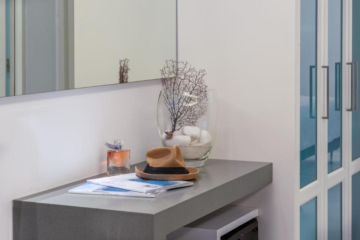 Il design è caratterizzato da pareti bianche, linee curve e un abbondante uso di materiali naturali, creando un'atmosfera luminosa ed estremamente accogliente. Le camere e le suite sono lussuosamente arredate, molte delle quali dispongono di vasche idromassaggio o piscine private sui balconi, offrendo un comfort esclusivo e una quiete sorprendente data la vicinanza al centro.