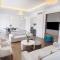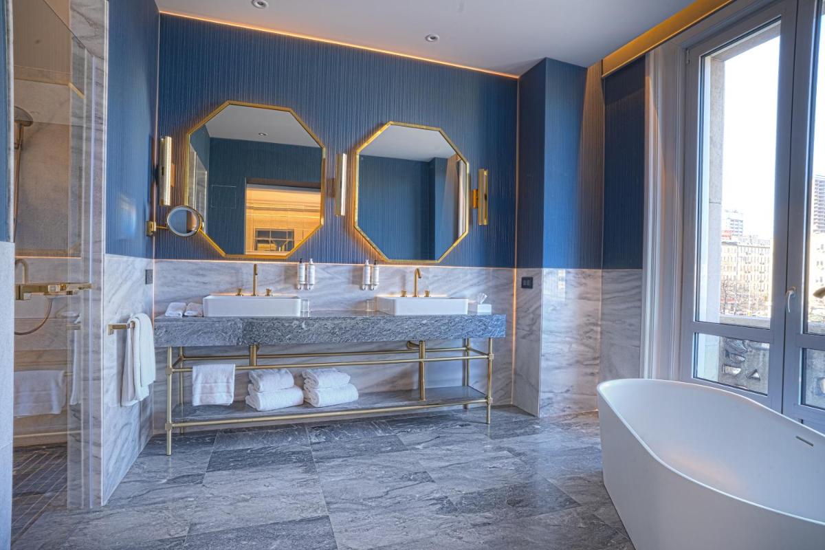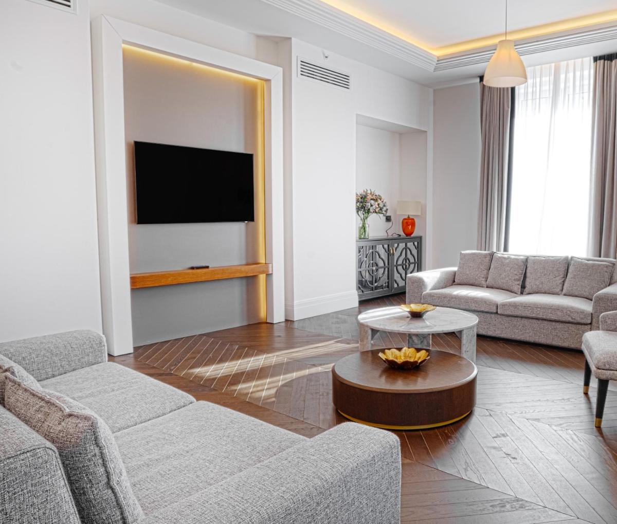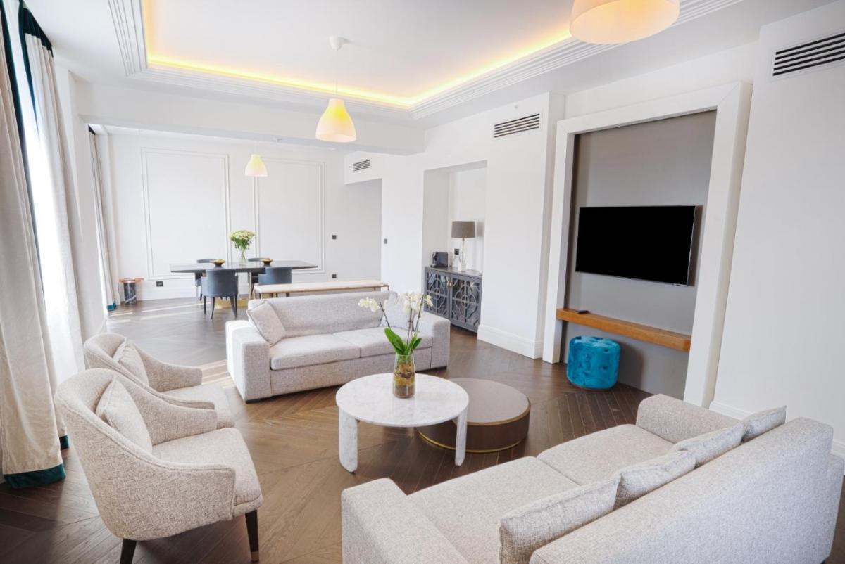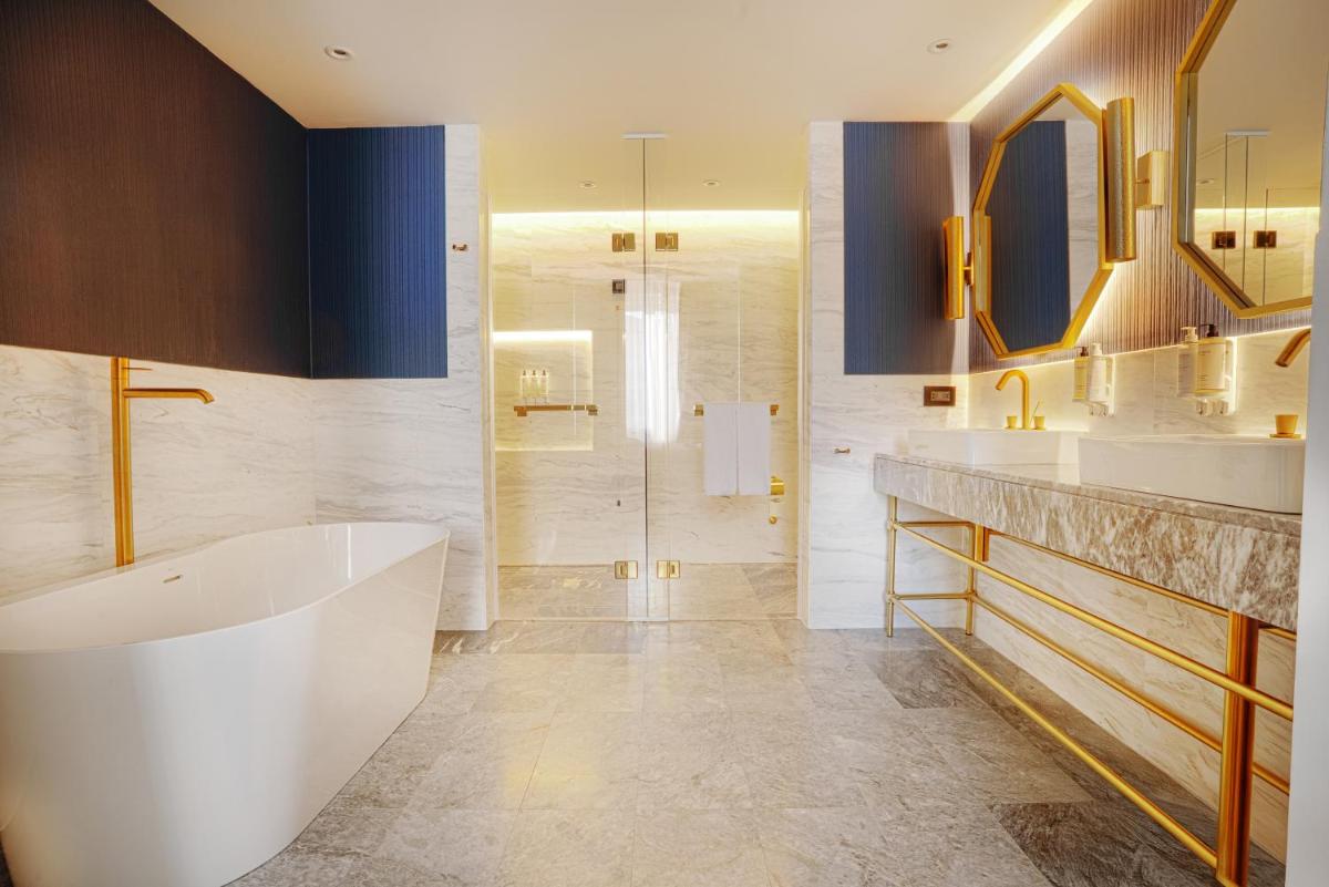 Ampia suite dotata di soggiorno separato, bagno di servizio, zona pranzo e lussuosa camera da letto con vasca, doccia e bidet.