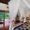 Cooled by both air conditioning and a ceiling fan, this suite features a four-poster bed with mosquito nets and a seating area with a sofa. The en suite bathroom has a dressing room, double vanities and a bath tub overlooking the greenery.
