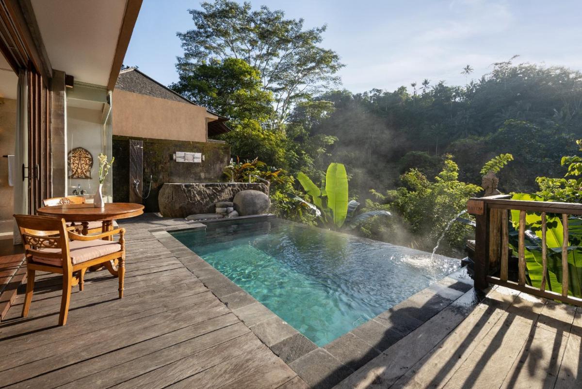 Il punto focale del resort è la sua iconica piscina a cascata, che offre un'esperienza di nuoto indimenticabile con una vista mozzafiato sulla foresta pluviale. Il resort vanta anche una spa di lusso che offre trattamenti tradizionali balinesi, un padiglione yoga per le lezioni mattutine e percorsi naturali per passeggiate meditative nella giungla circostante.