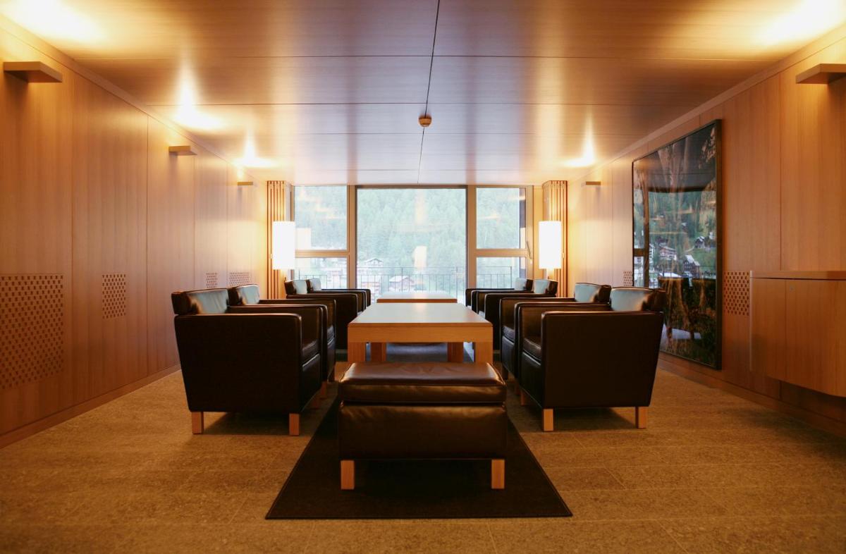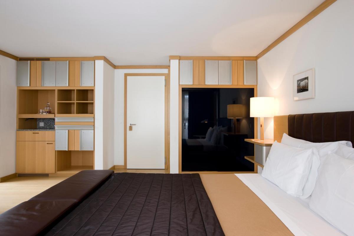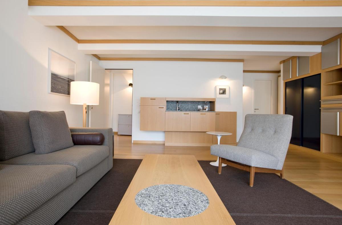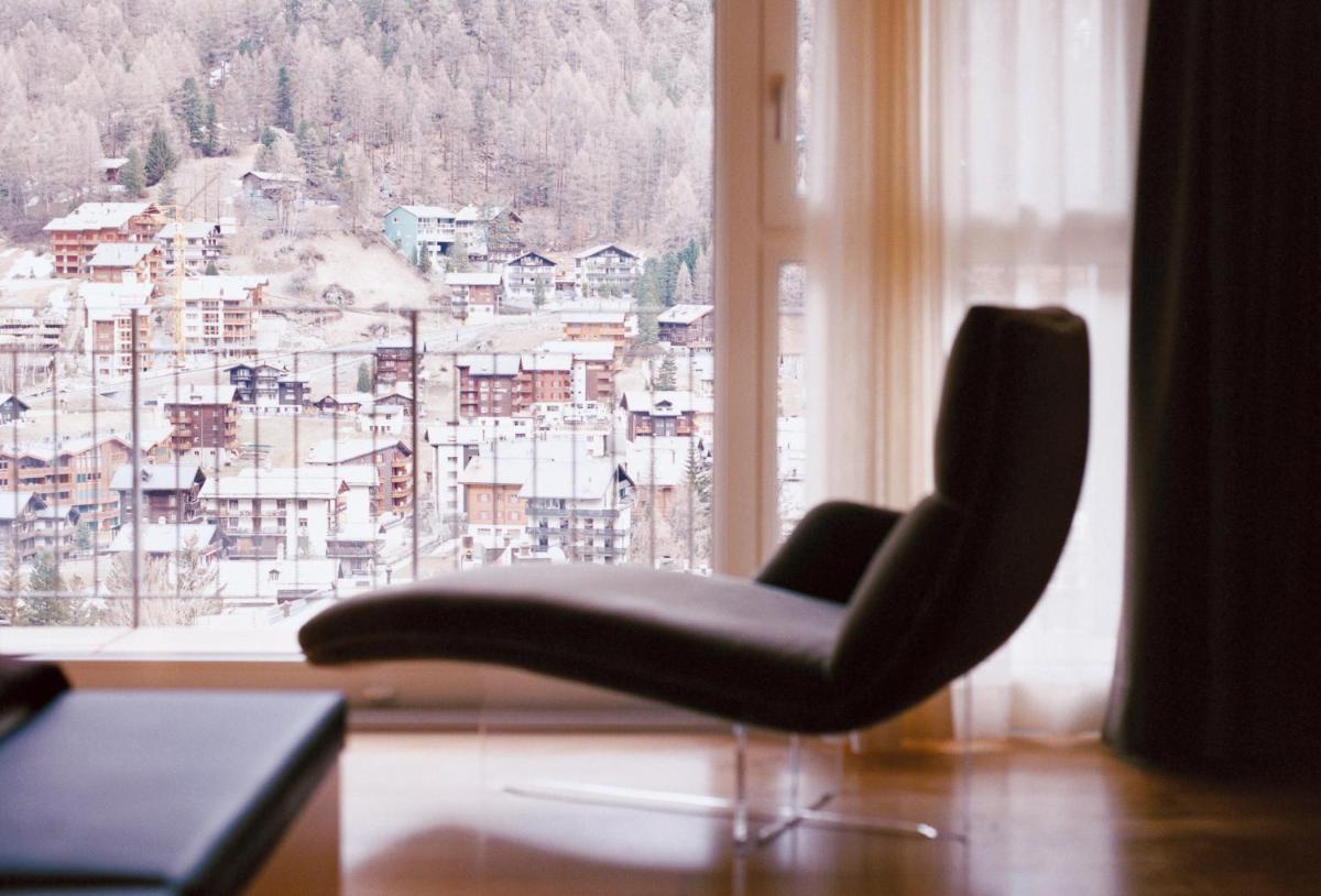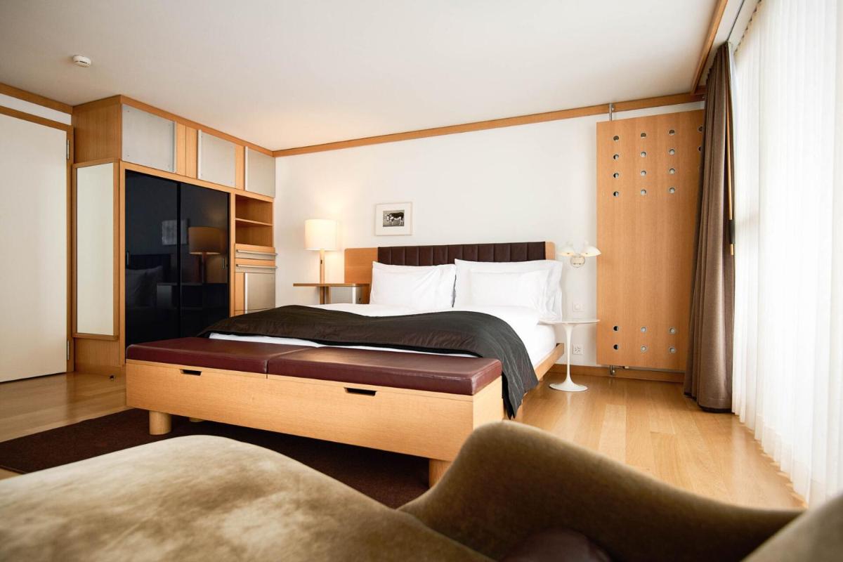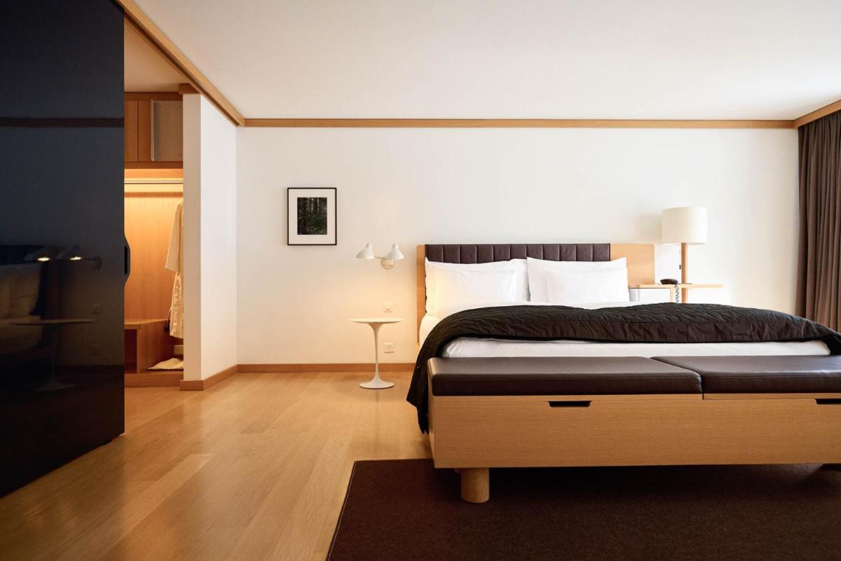 Il design interno è un capolavoro di minimalismo e comfort, caratterizzato dall'uso di materiali naturali come pietra, legno e vetro. Le 30 camere e suite sono concepite come eleganti rifugi, con ampie finestre e balconi che incorniciano il paesaggio alpino. Lo stile è ispirato al concetto di 'lodge' americano, ma con una sensibilità e una qualità artigianale svizzera.